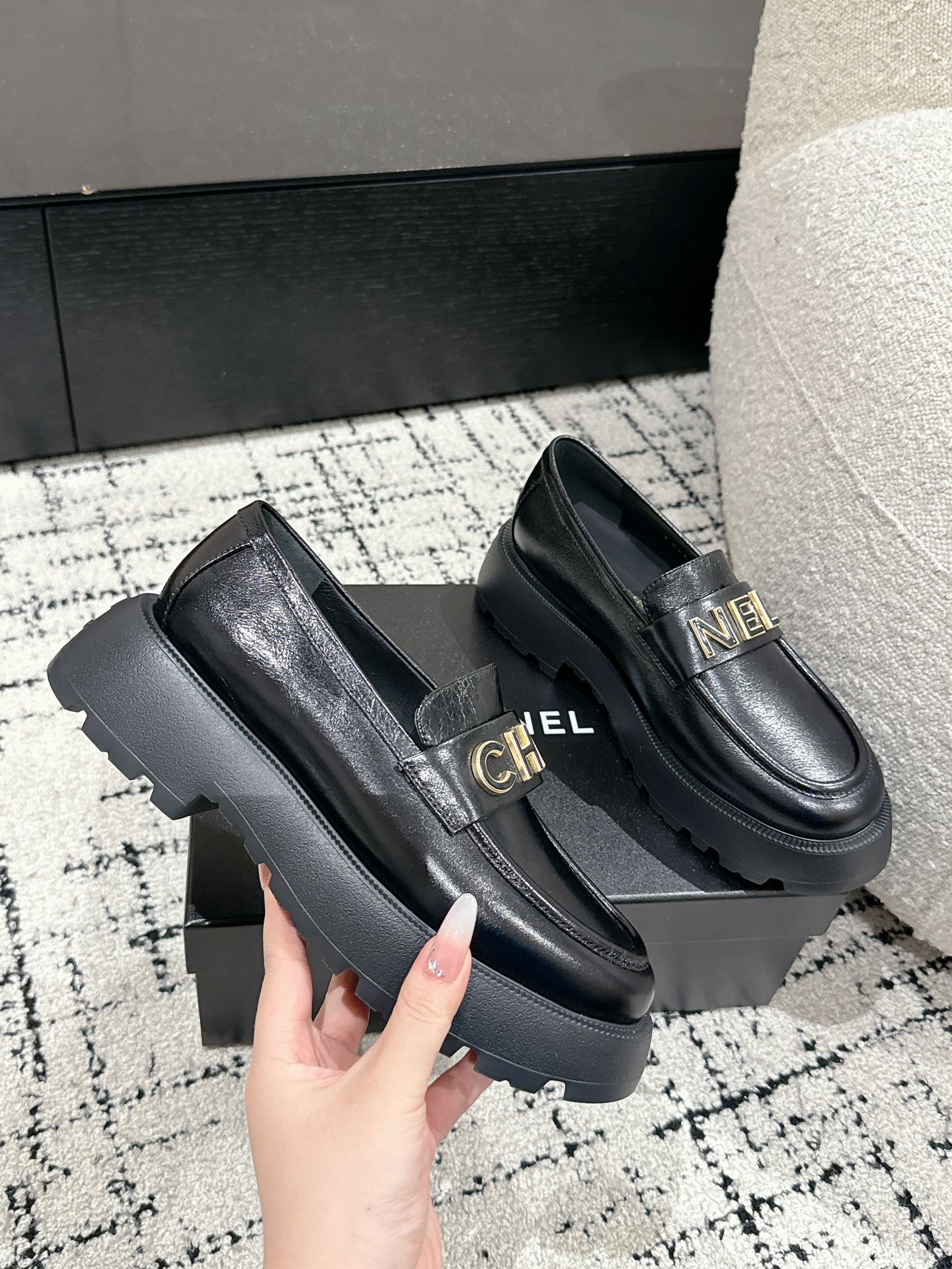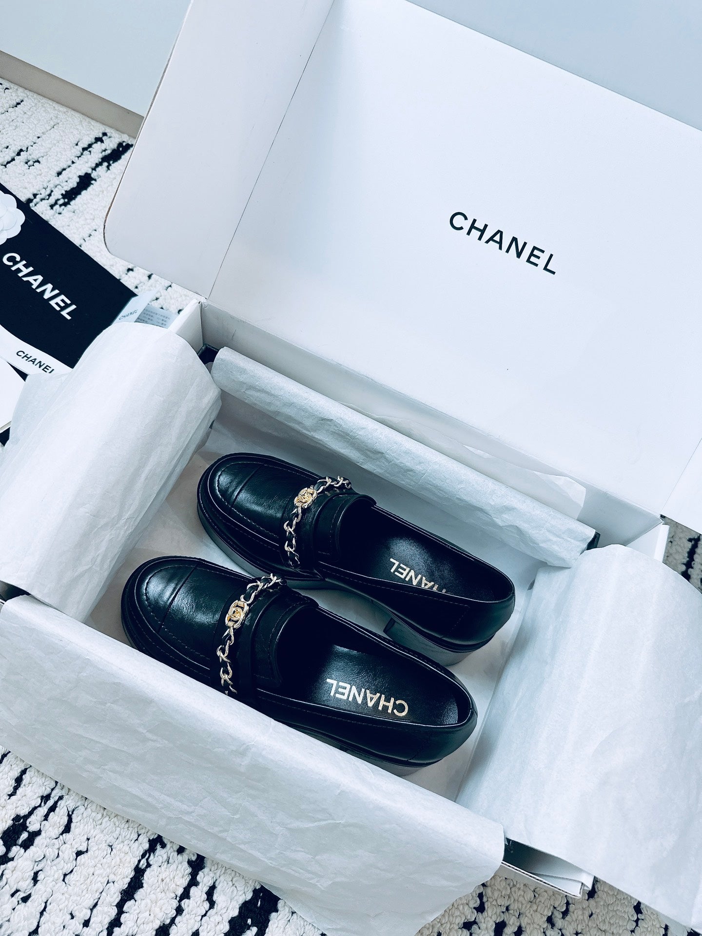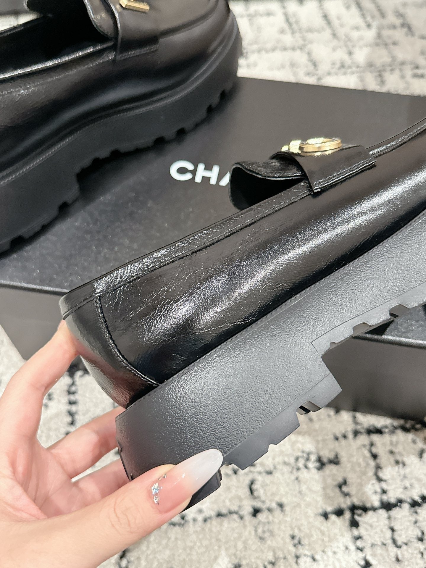 CC Moccasins 55mm In Black Glossy Lambskin With Chain 144477