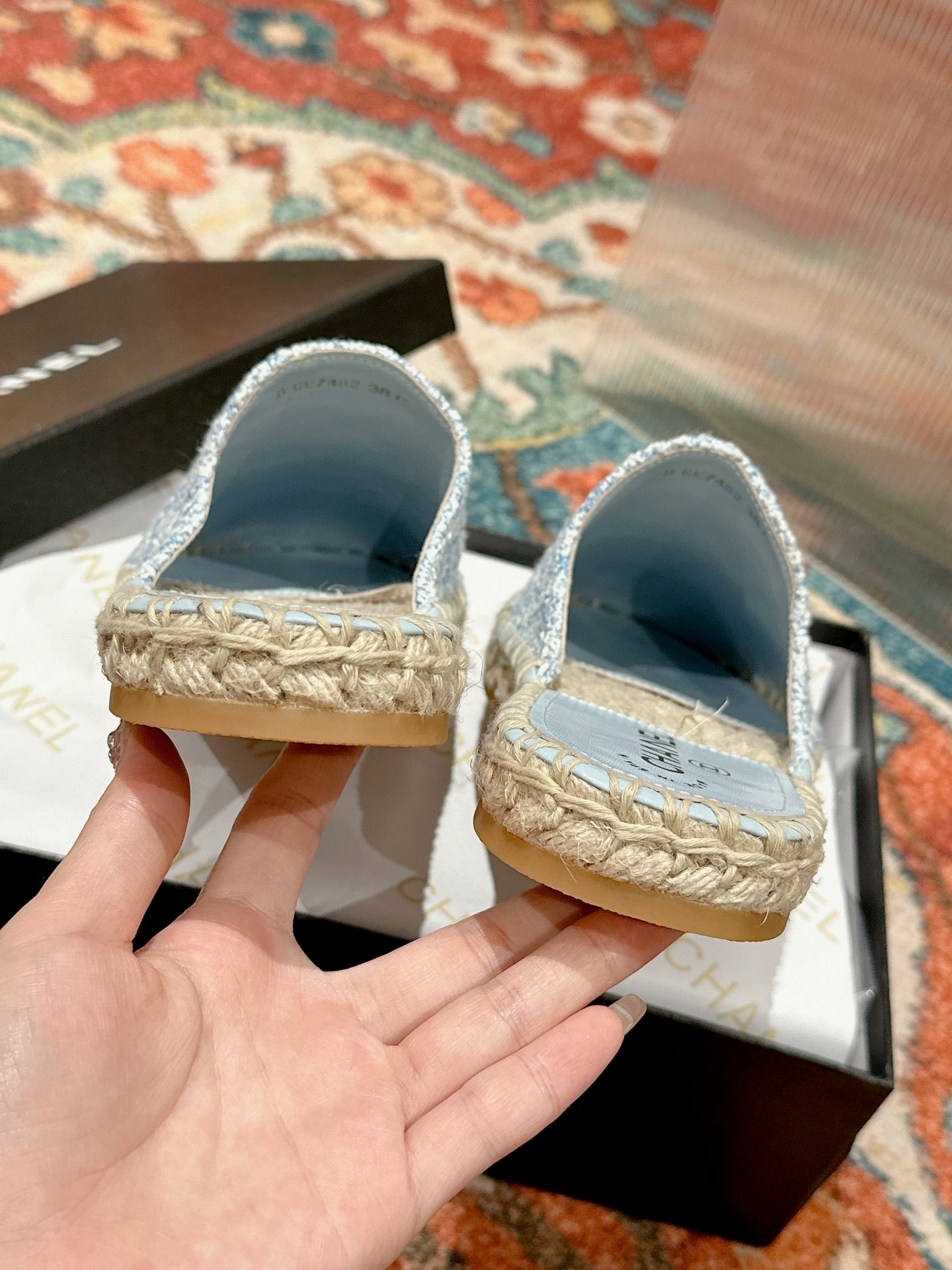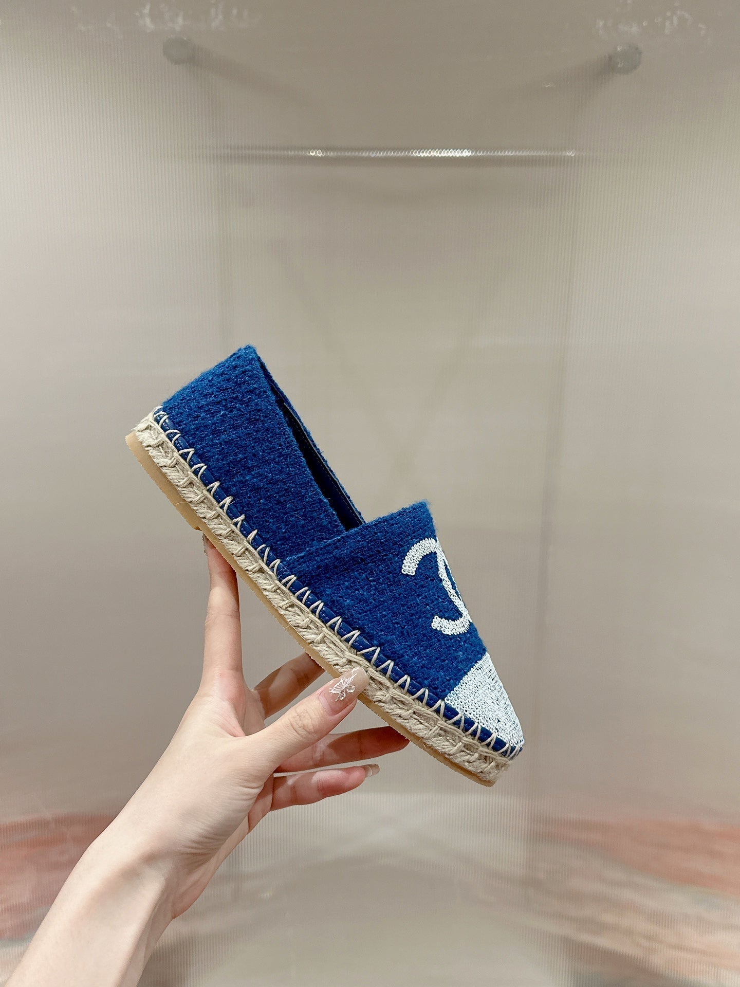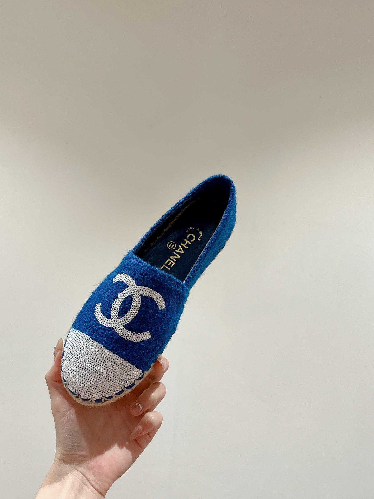 cc espadrilles mule blue tweed white sequin