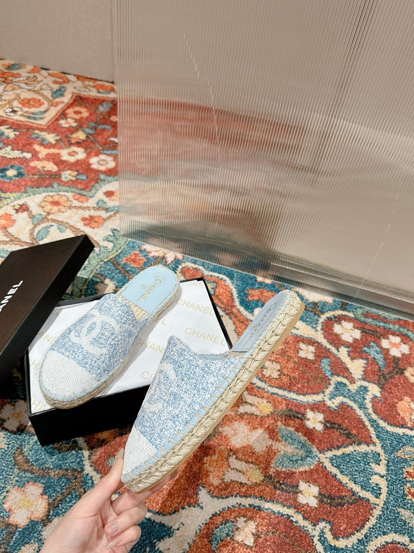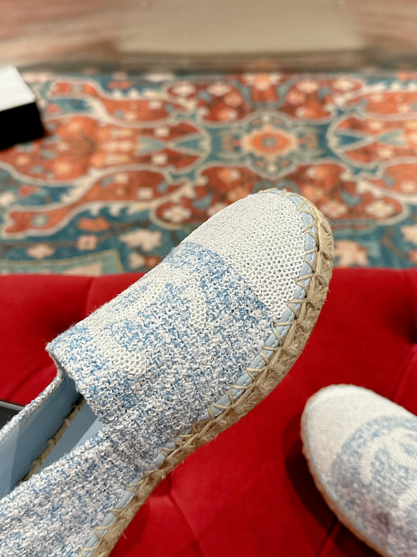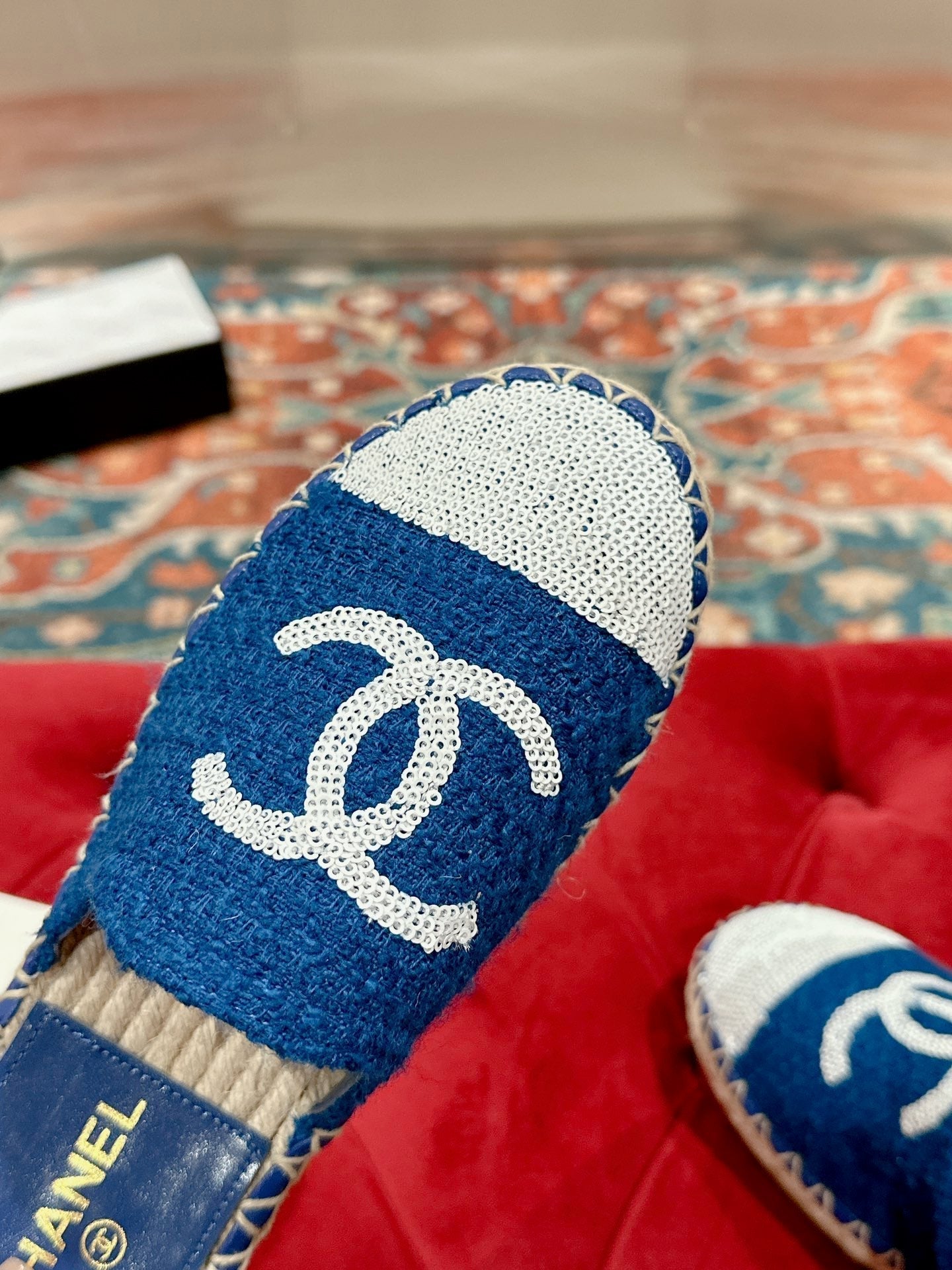 cc espadrilles mule blue tweed white sequin
