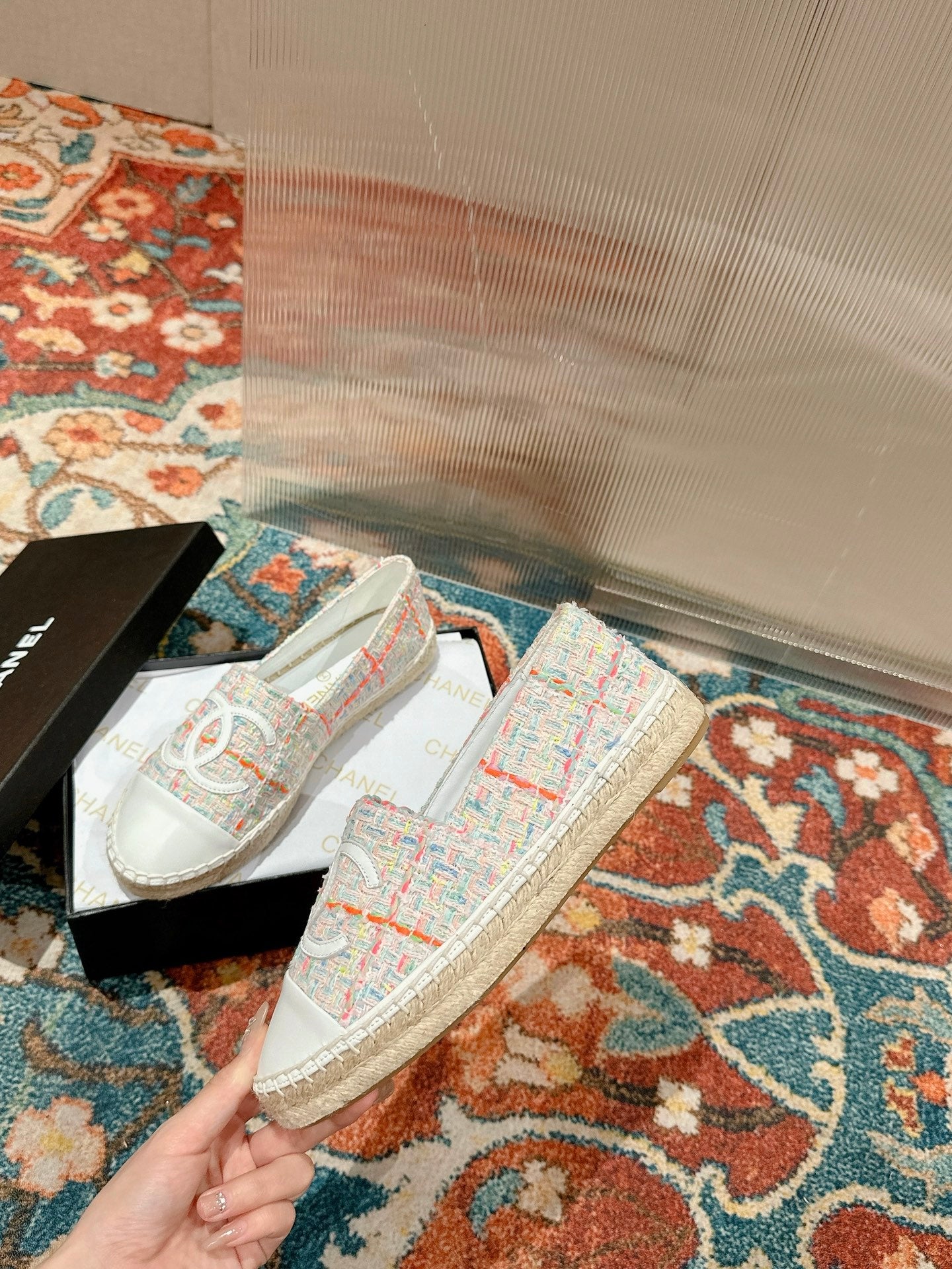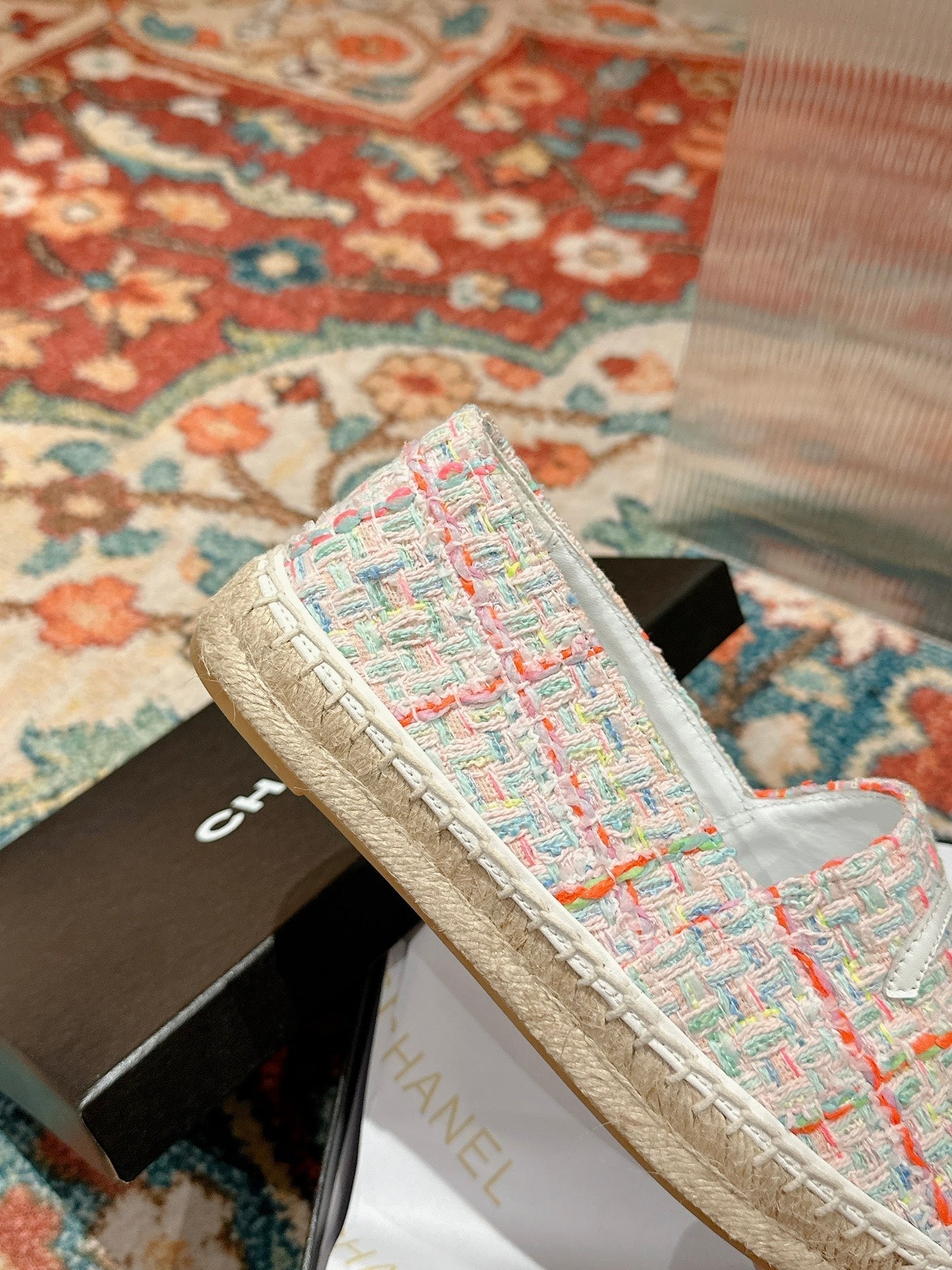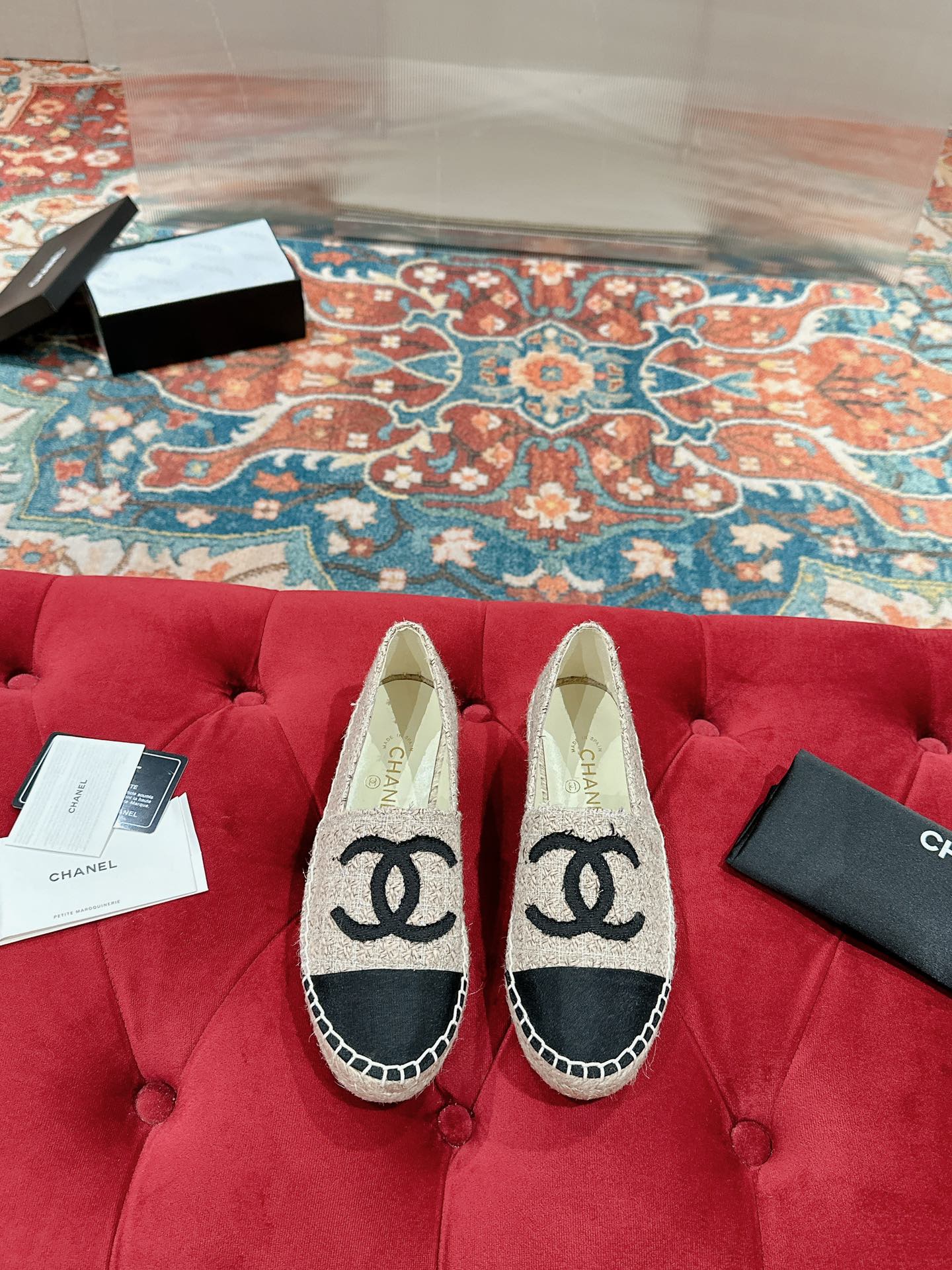 espadrilles pink tweed black patent calfskin