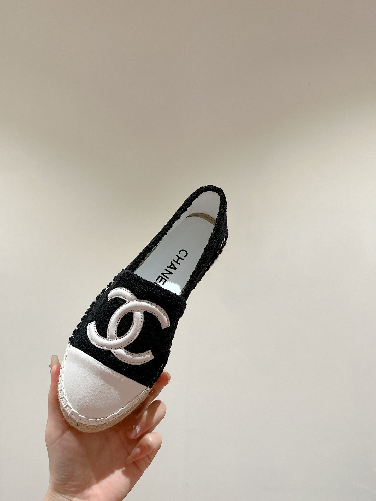 cc espadrilles black fleece fabric white calfskin