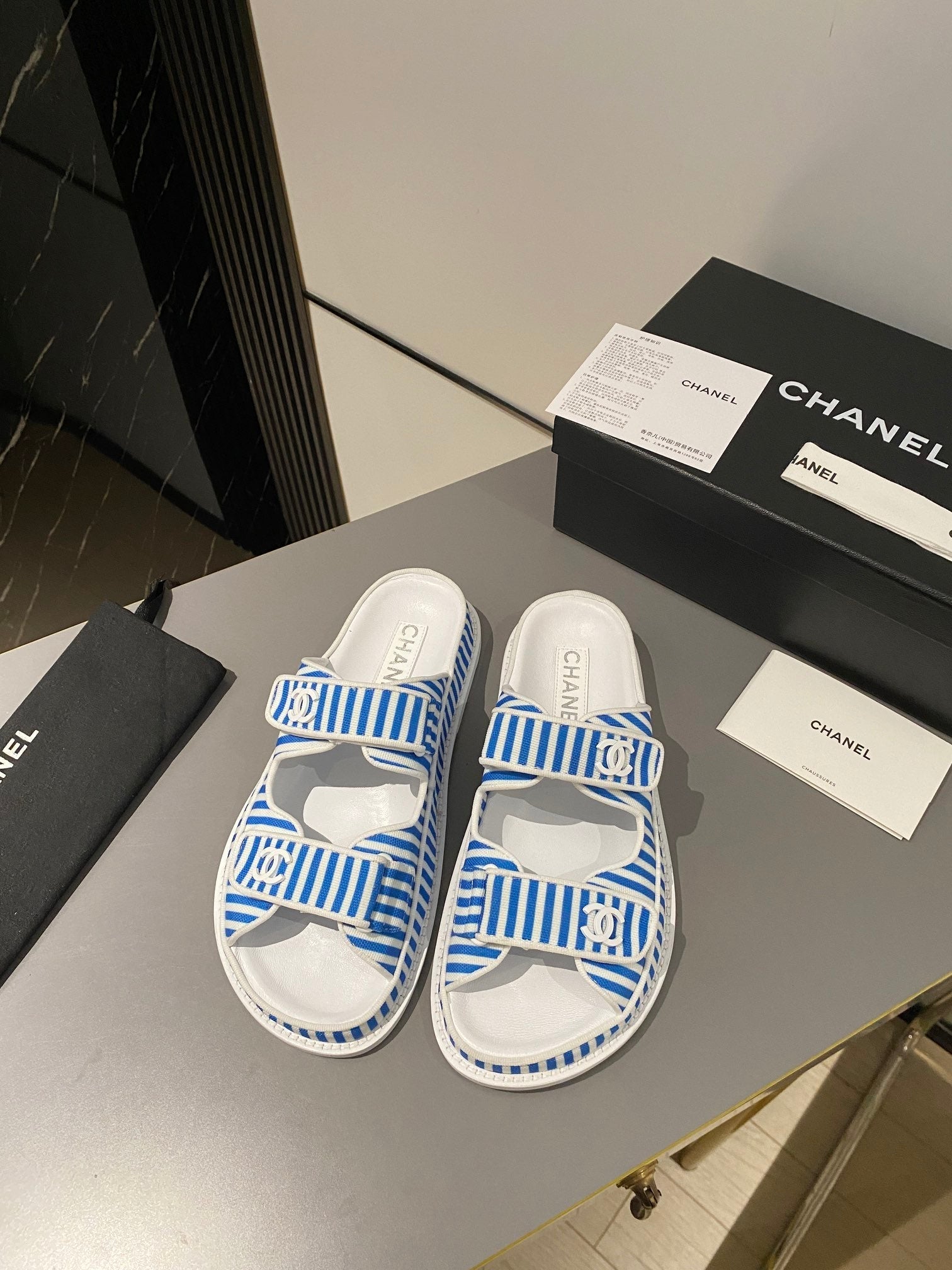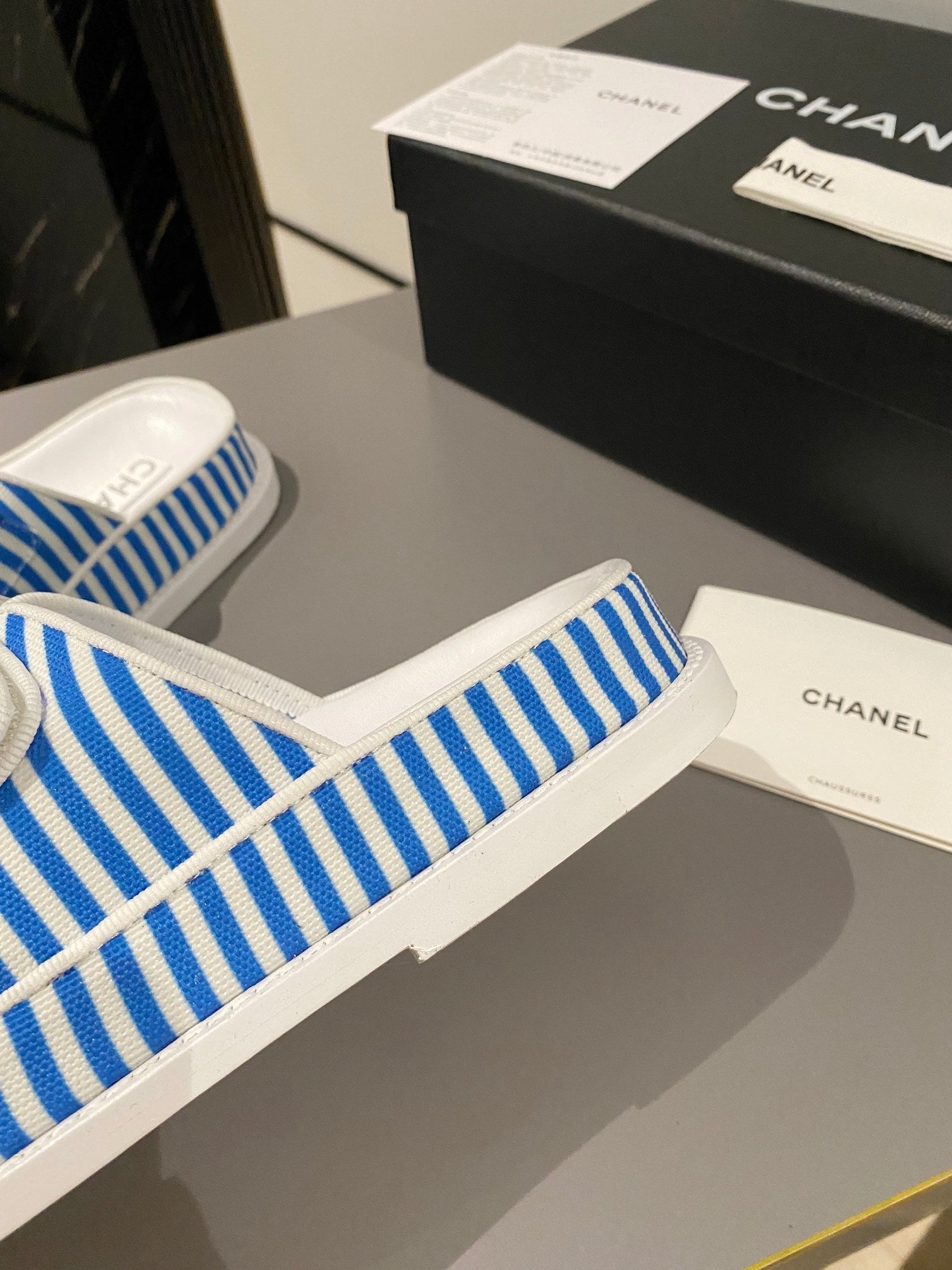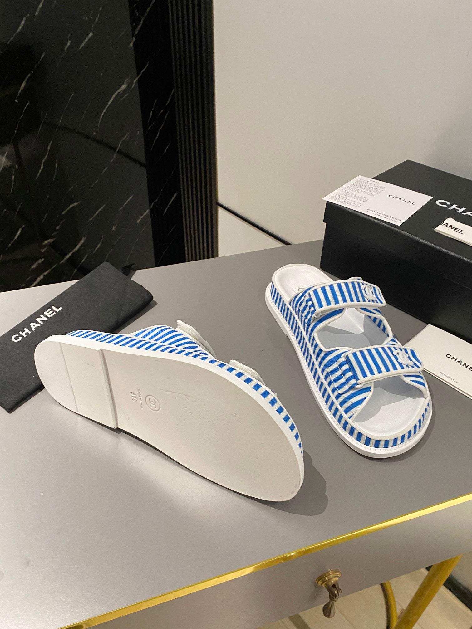dad sandal mule striped ocean blue white fabric calfskin
