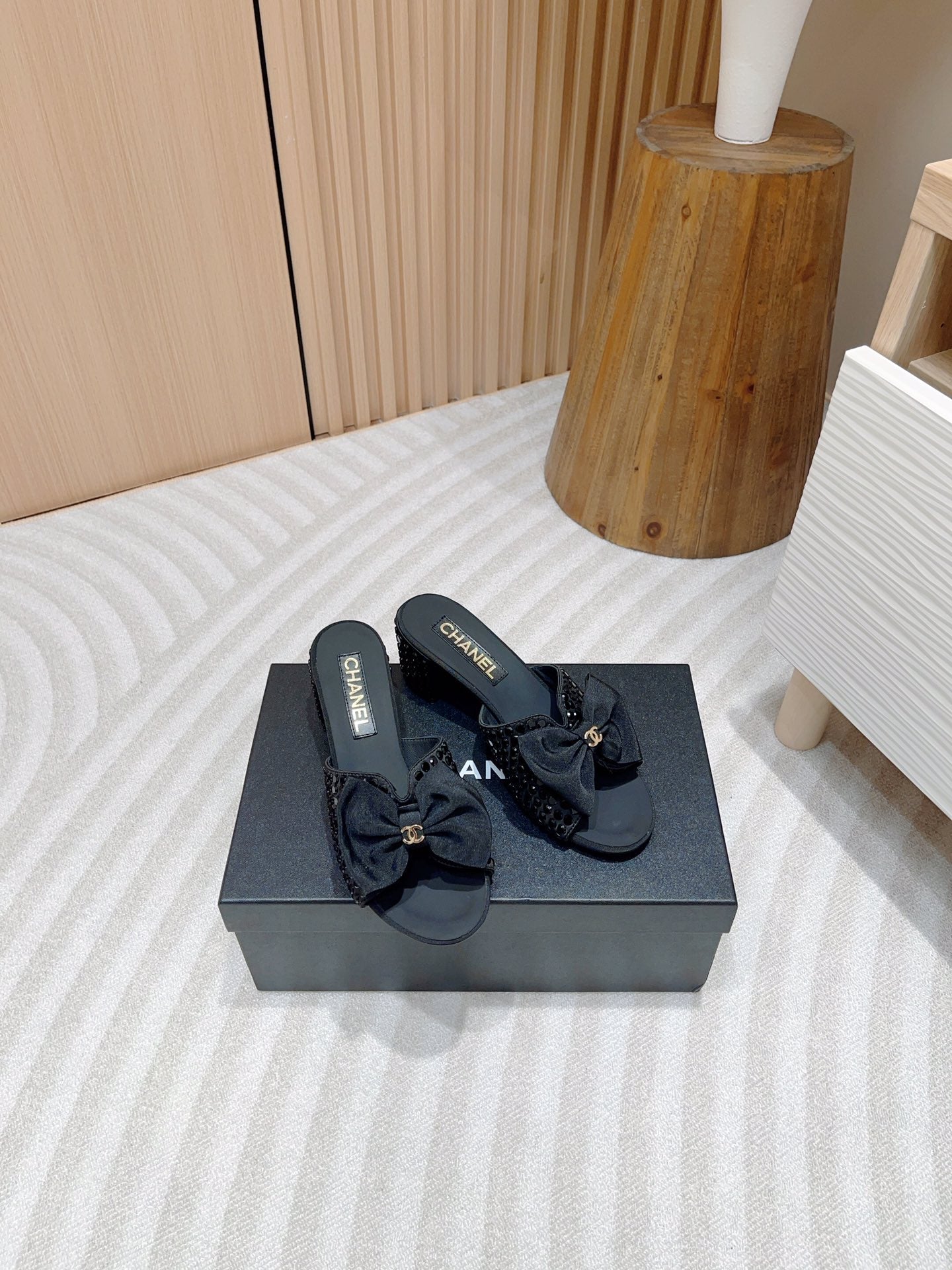 CC SLIPPERS WITH SILK BOW IN BLACK COWHIDE