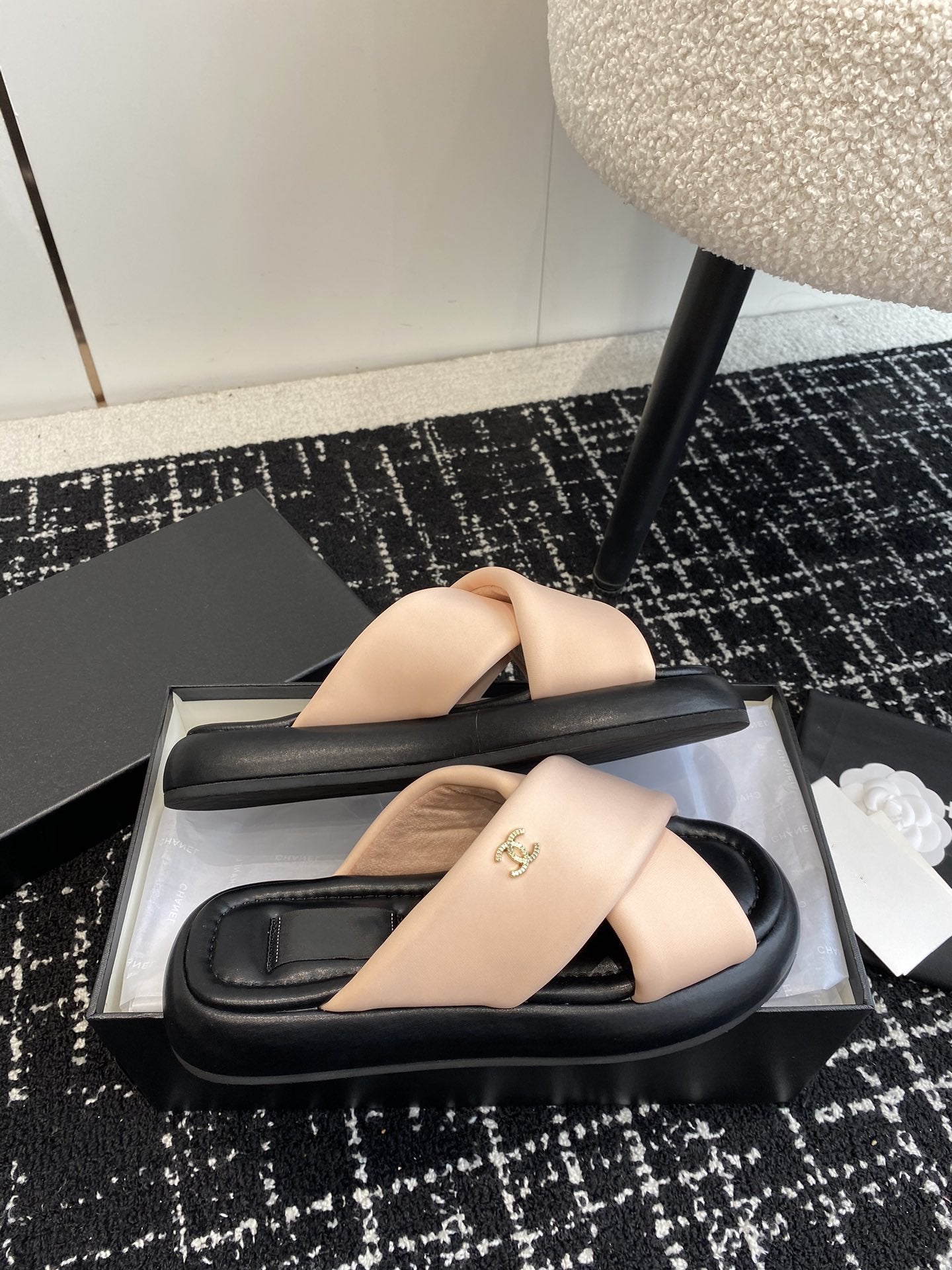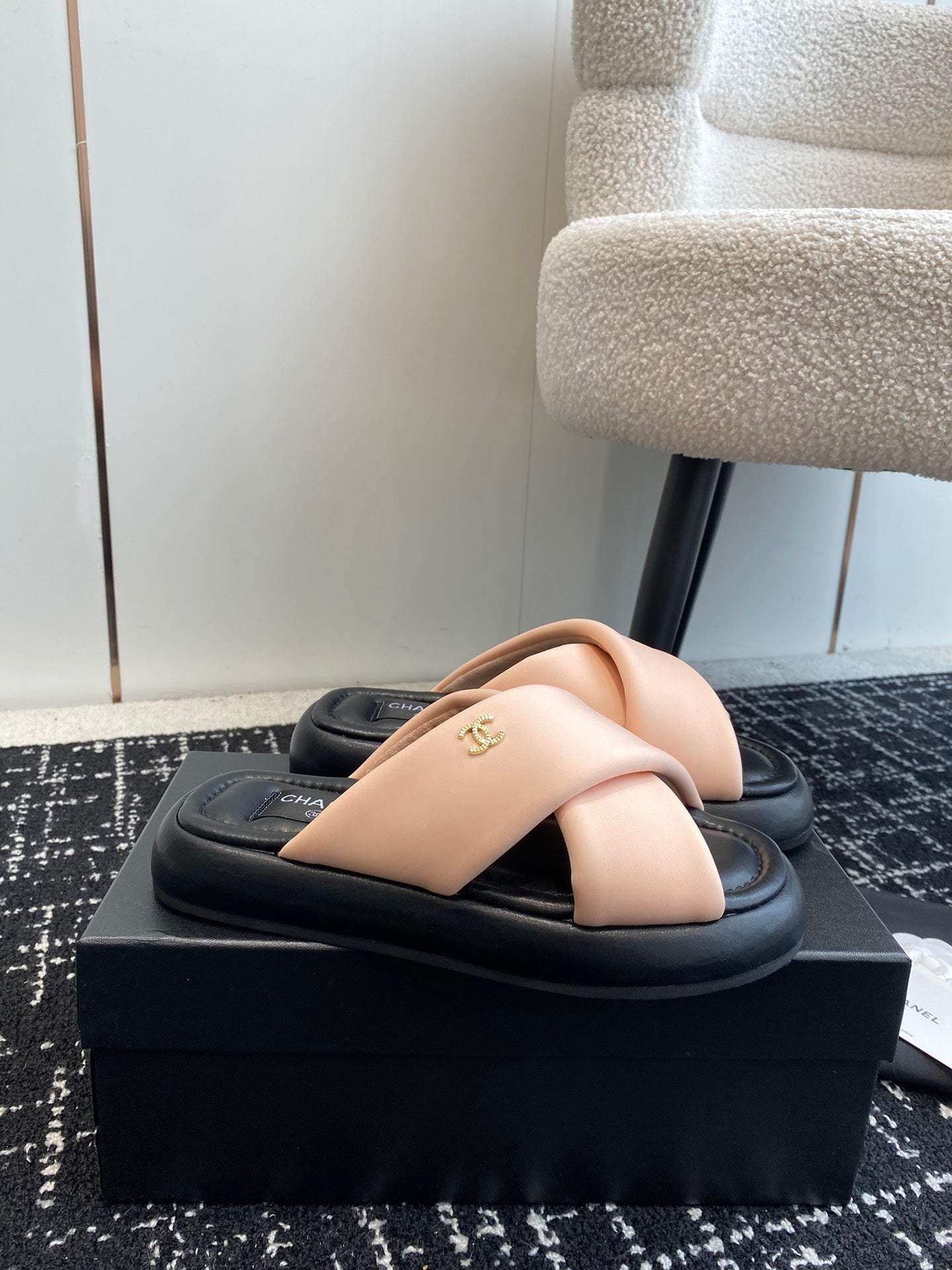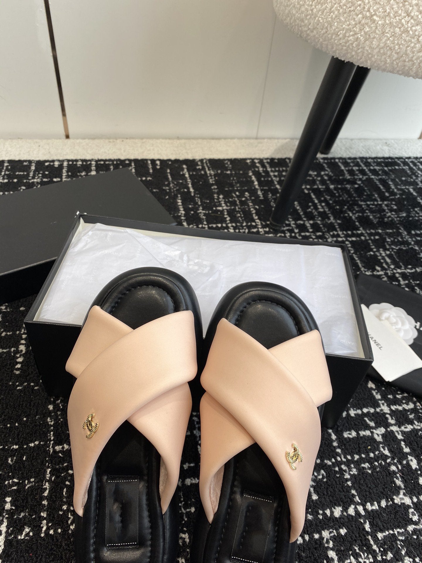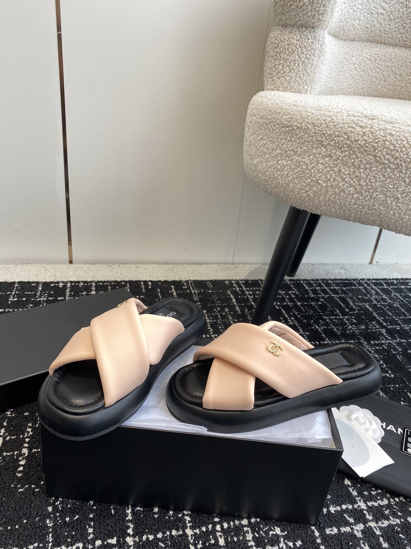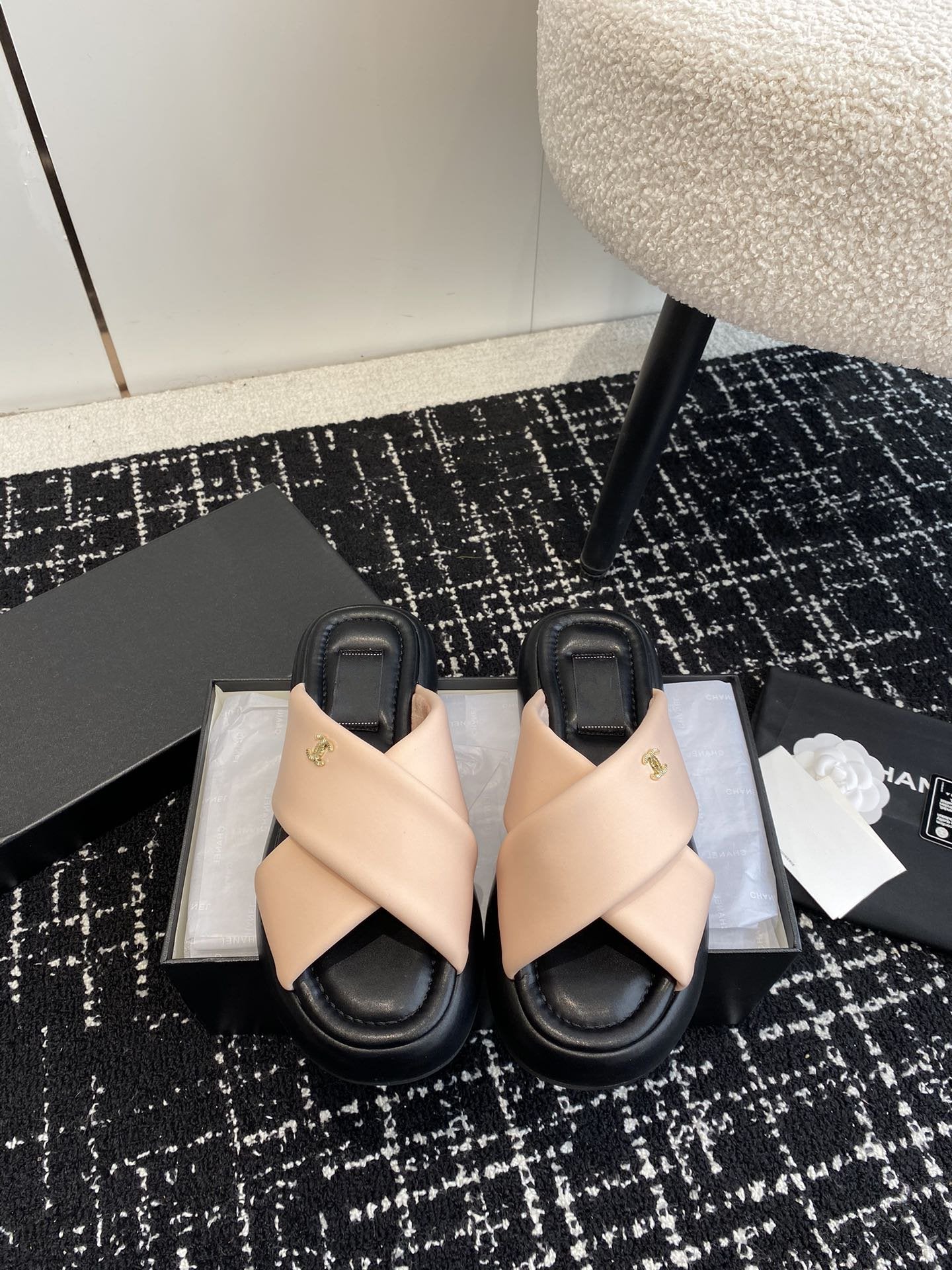 cross slippers 50 beige black quilted lambskin