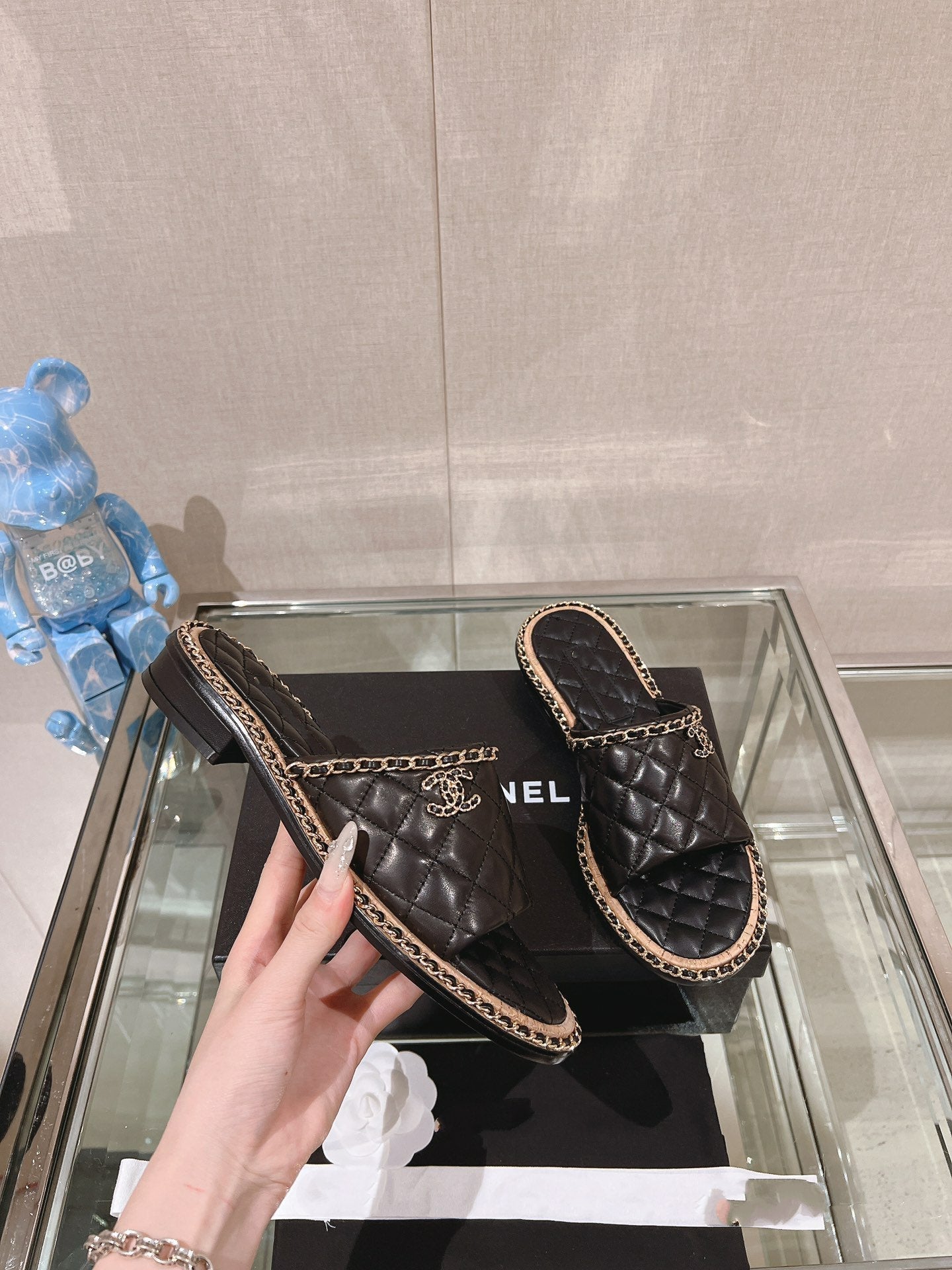cross slippers 30 beige black quilted lambskin