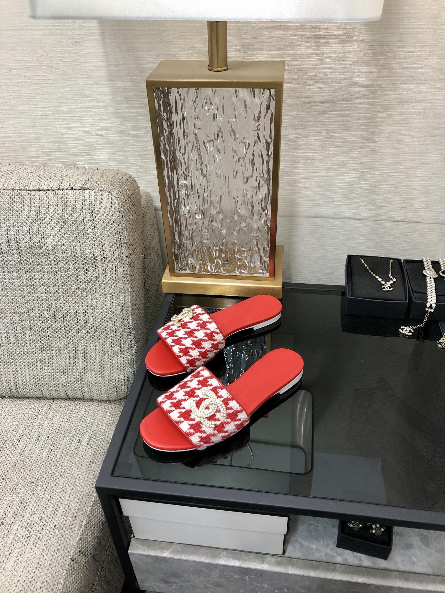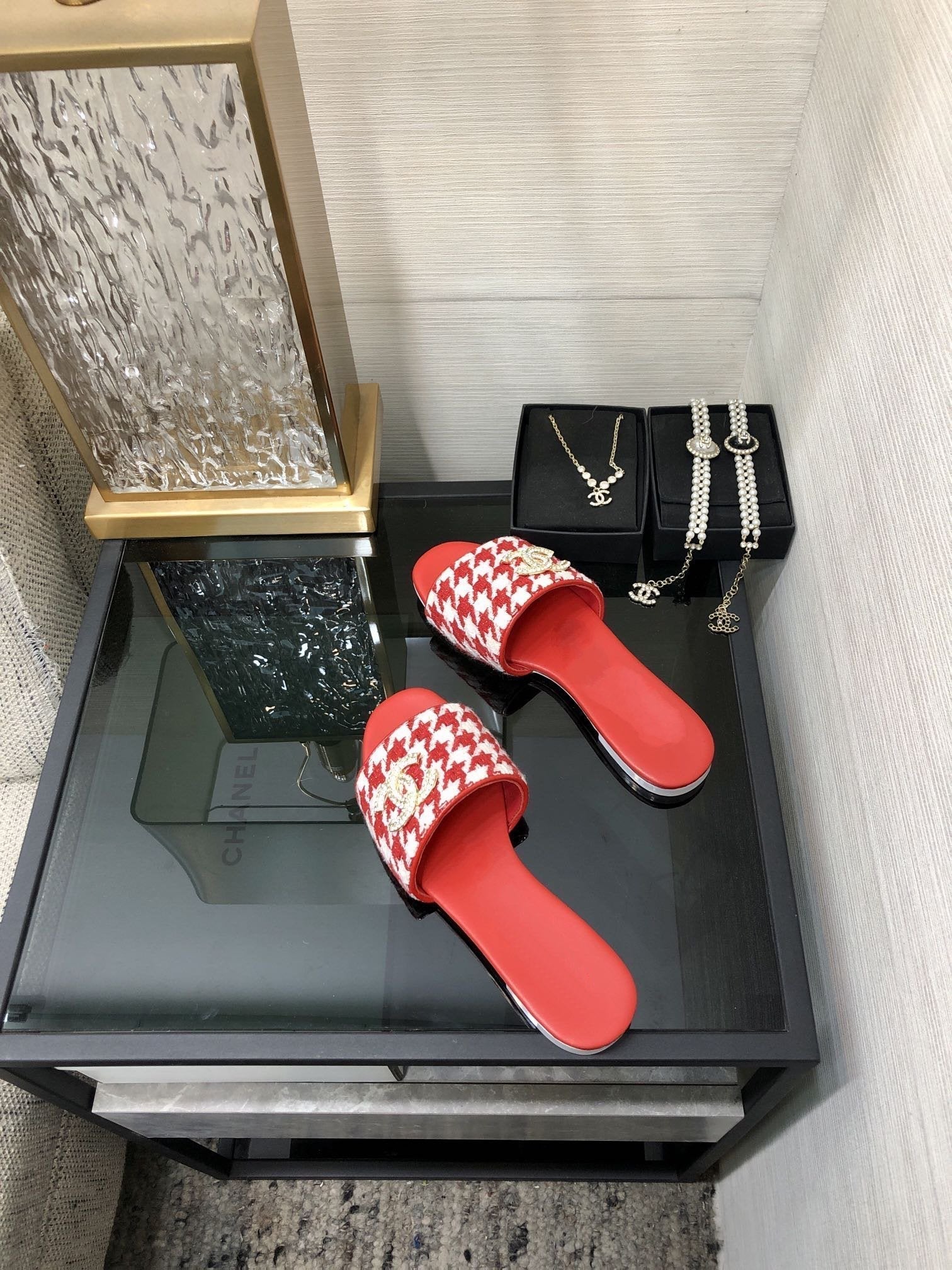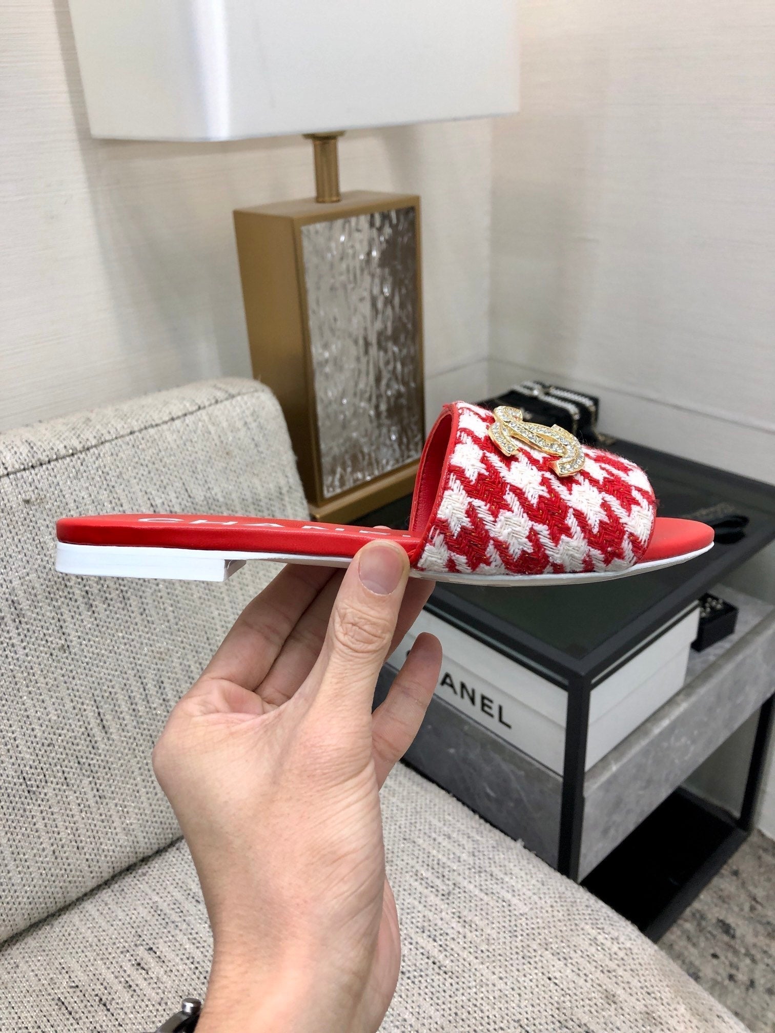 mule sandal red white houndstooth fabric