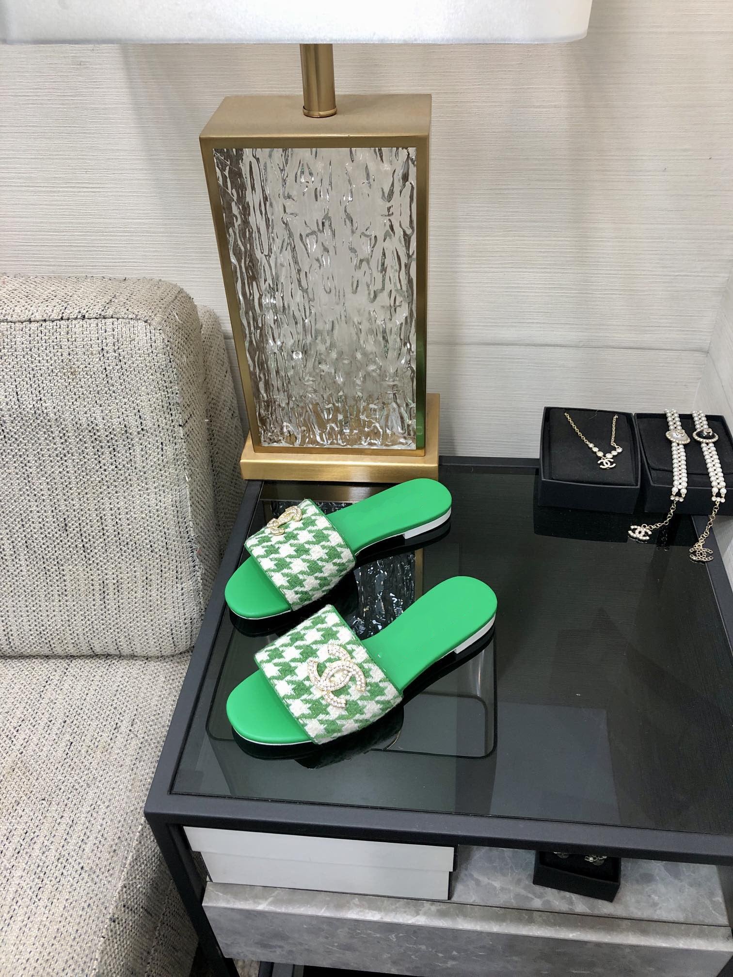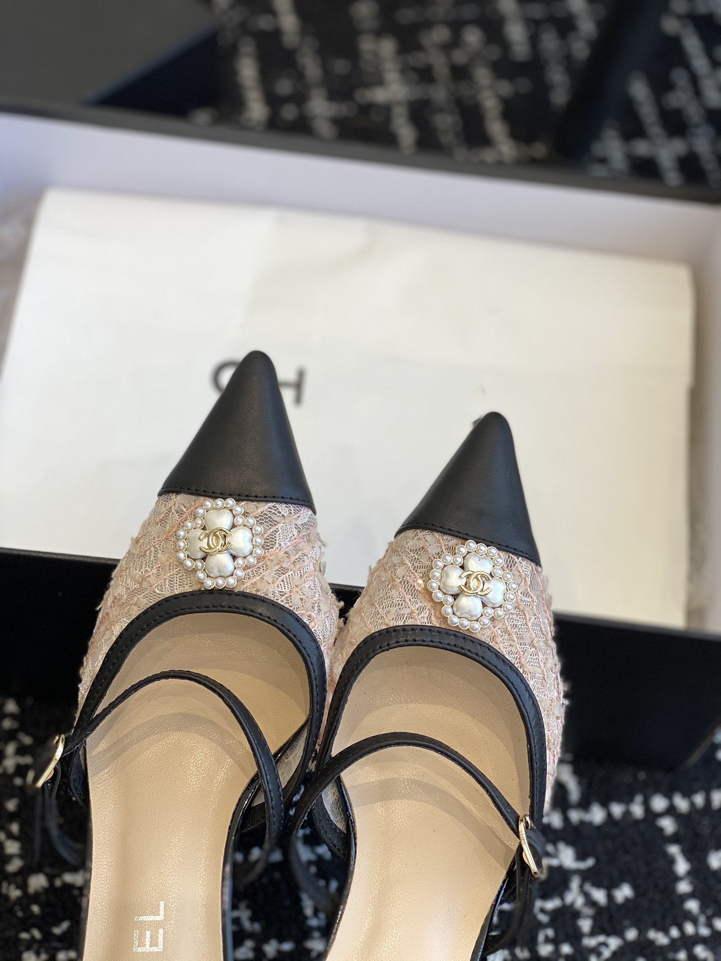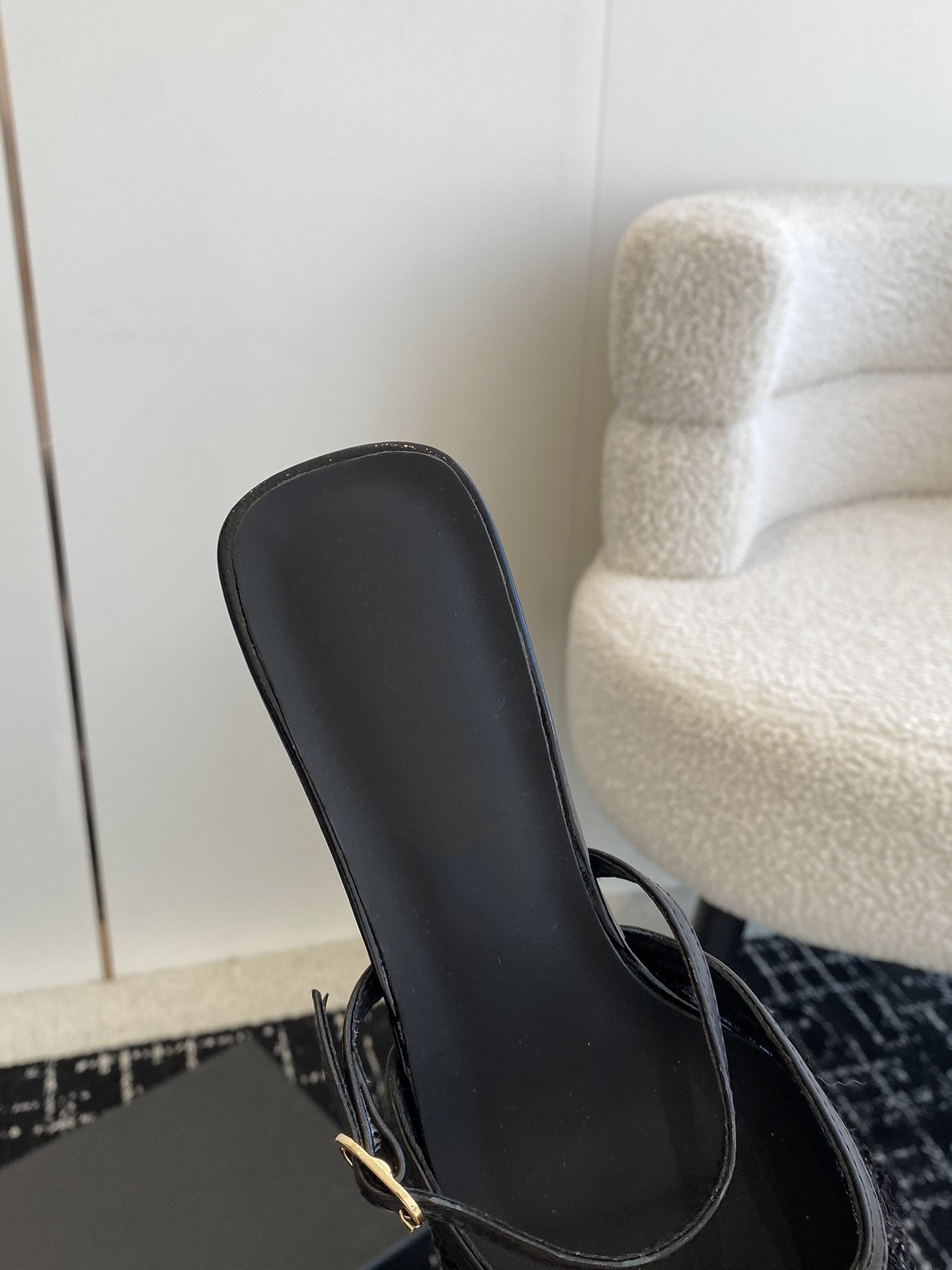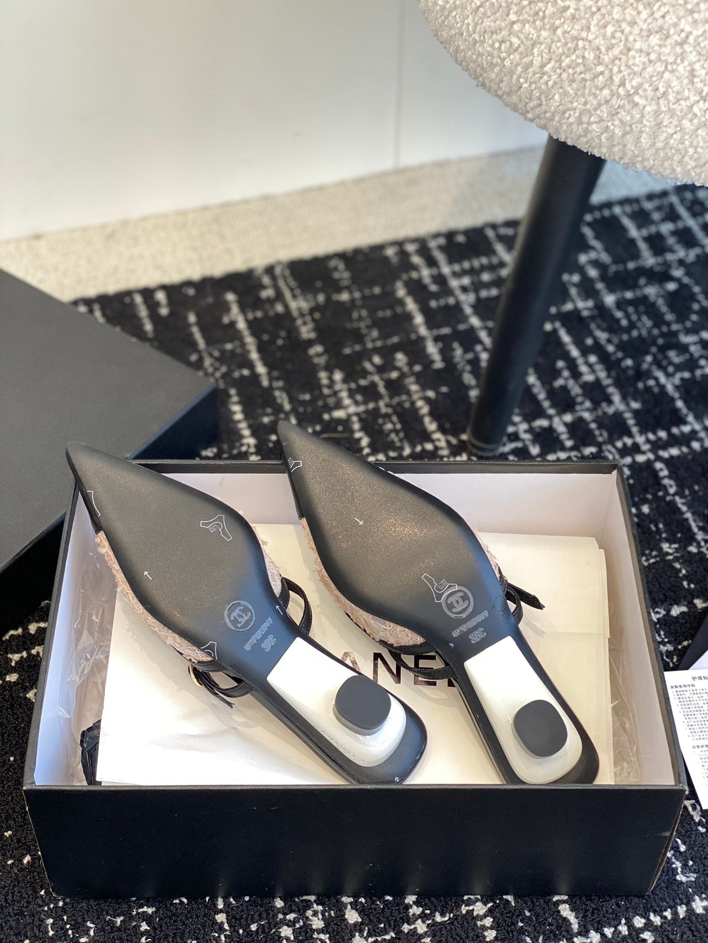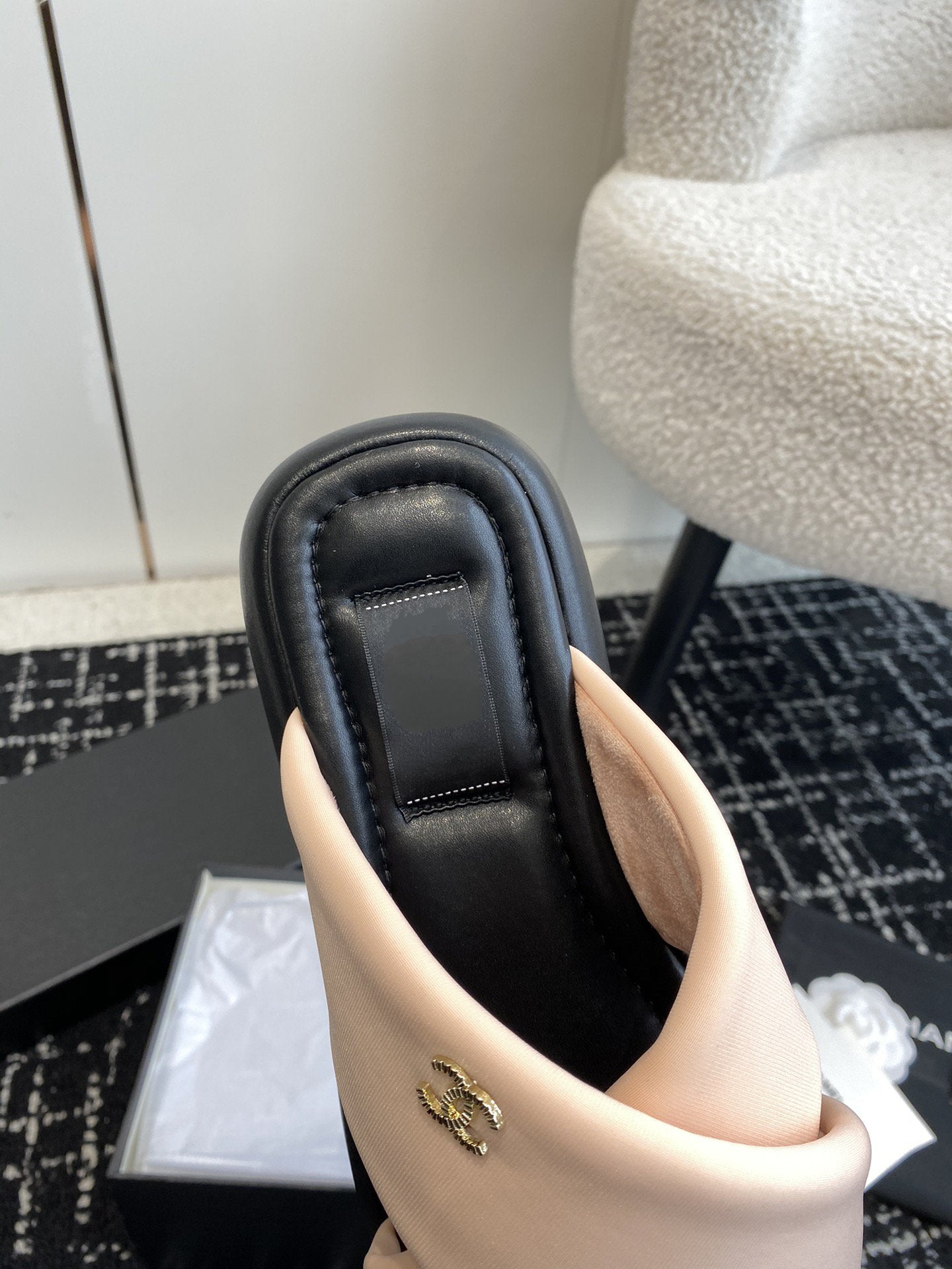 mule sandal beige tweed black lambskin