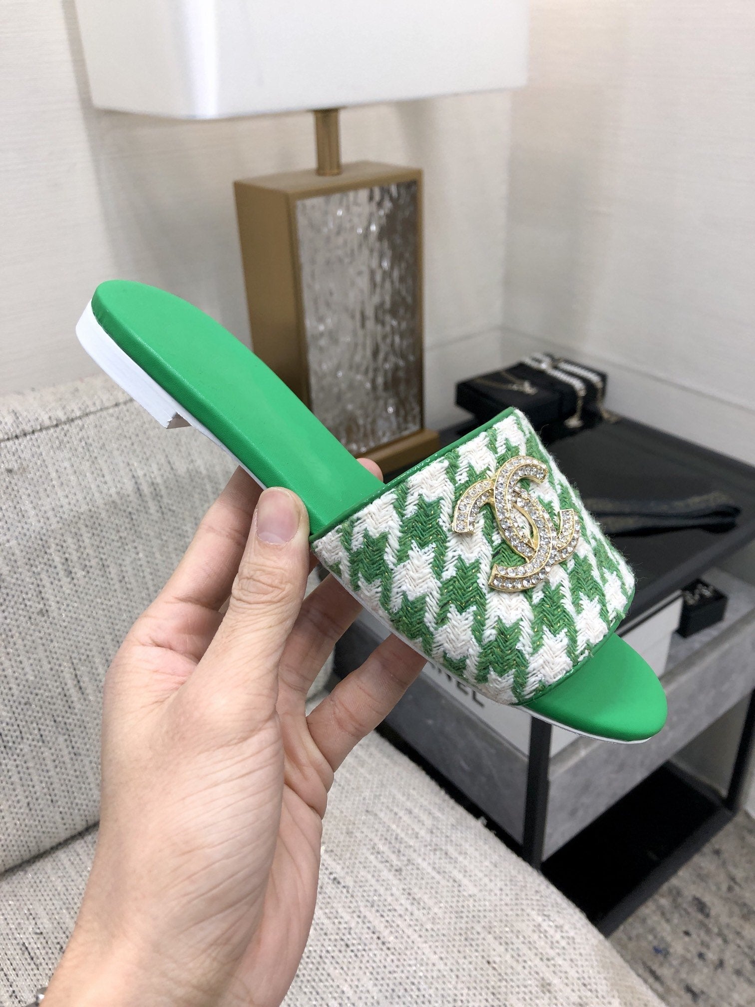 mule sandal green white houndstooth fabric