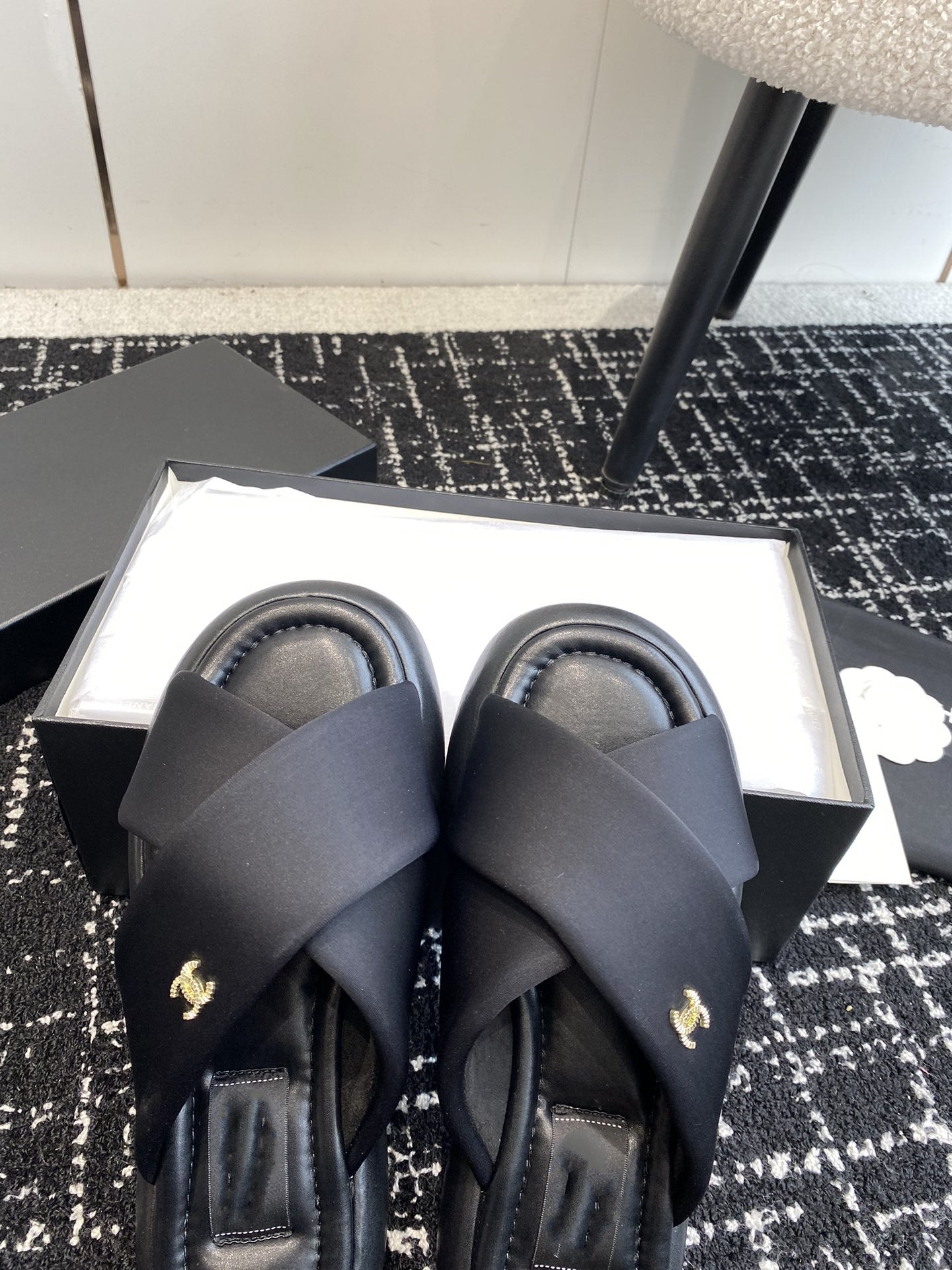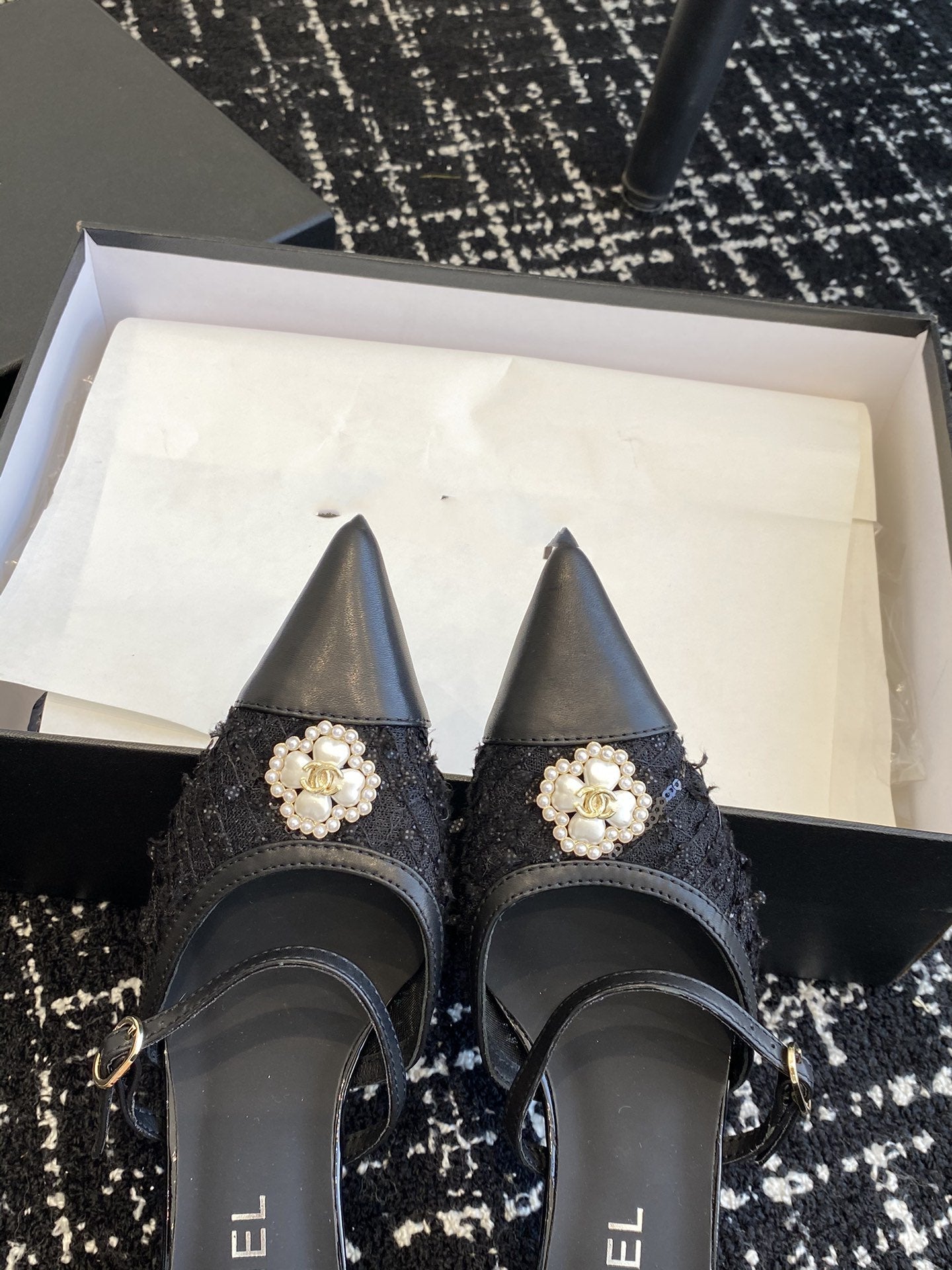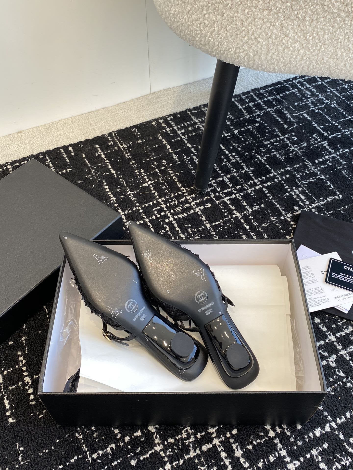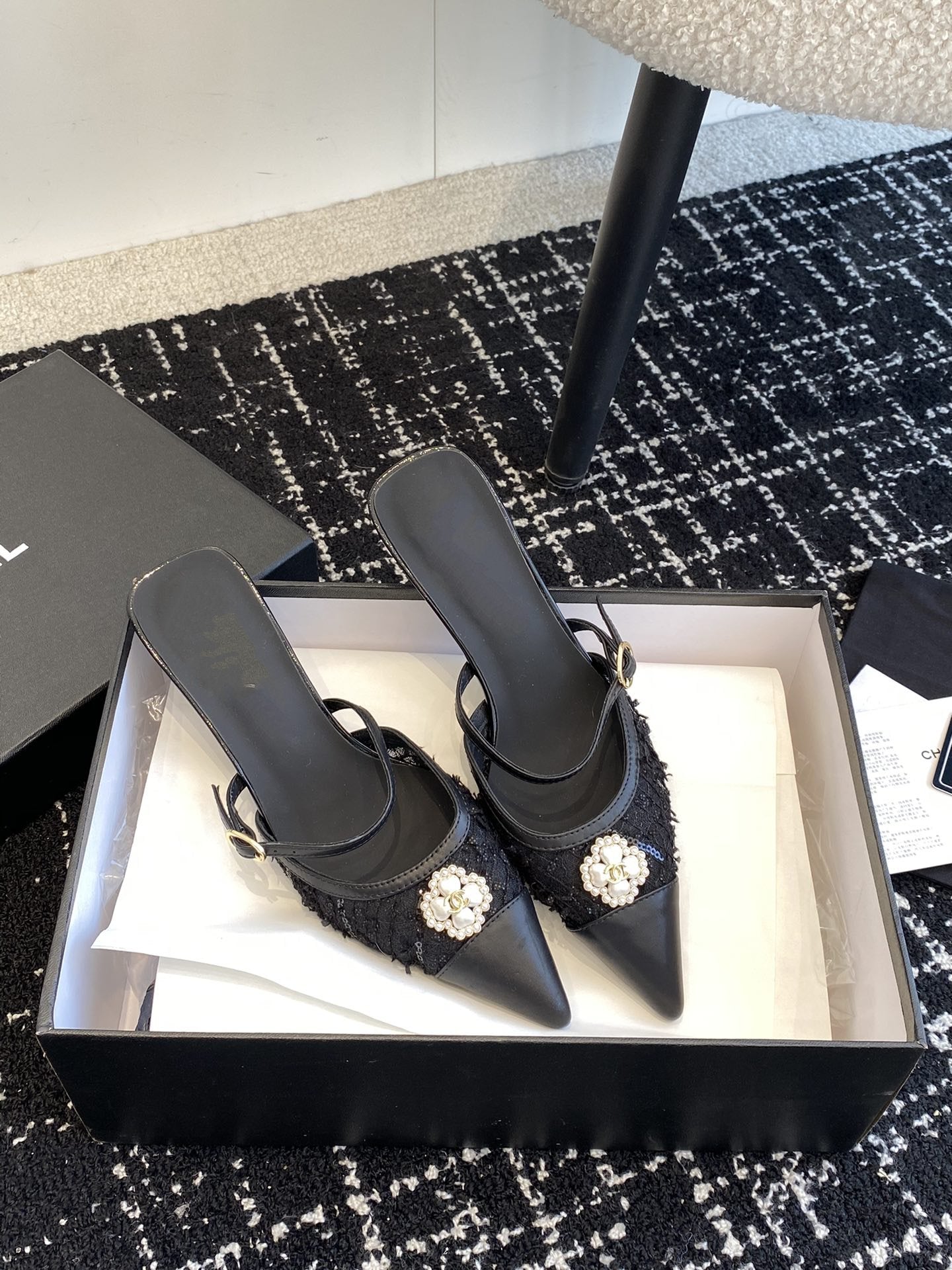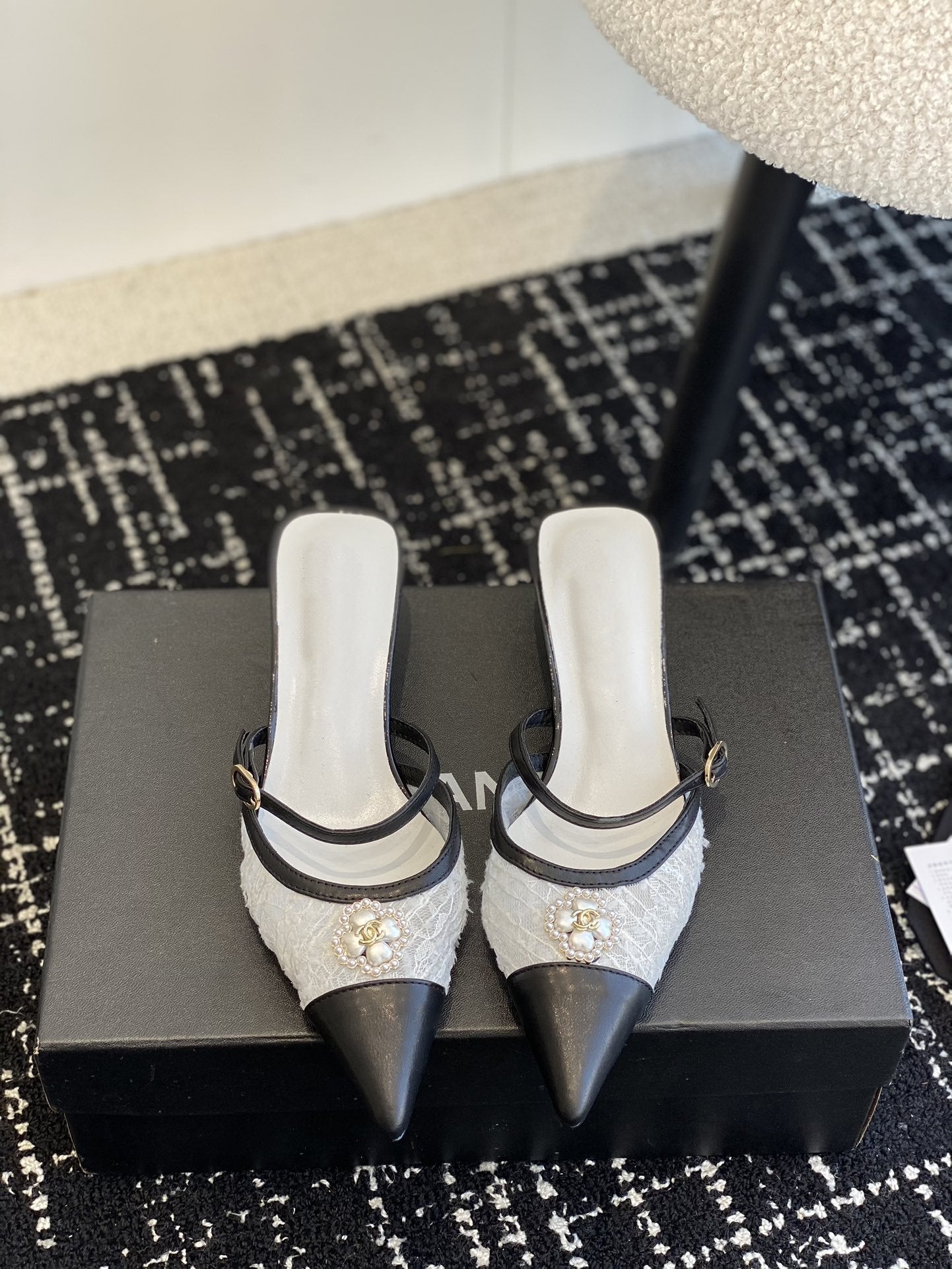 mule sandal white tweed black lambskin