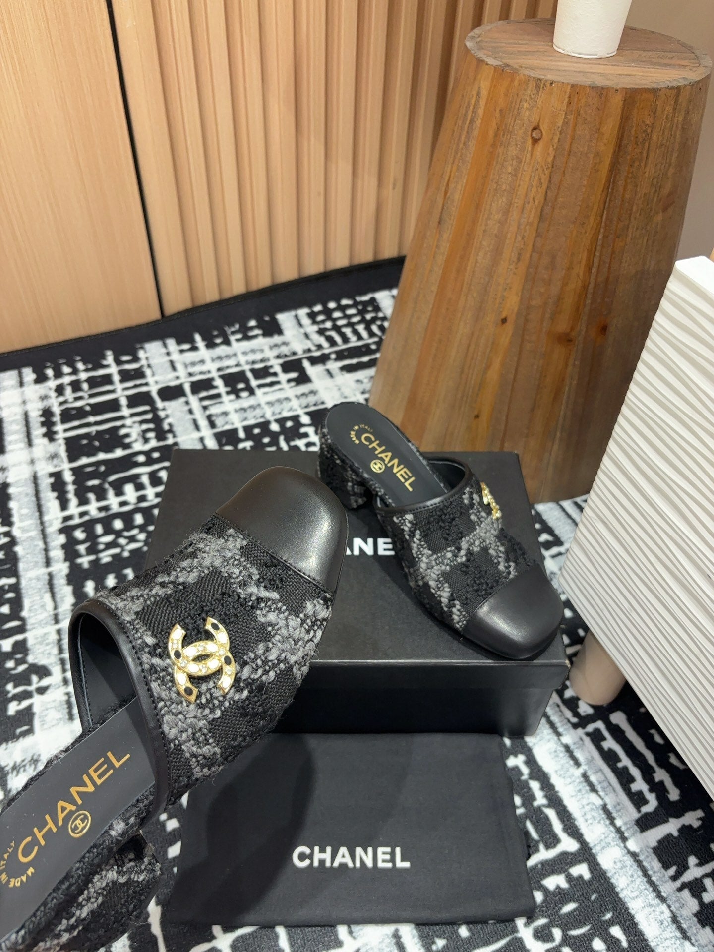 CC Mule 30mm In Black Mix White Wool Tweed And Lambskin