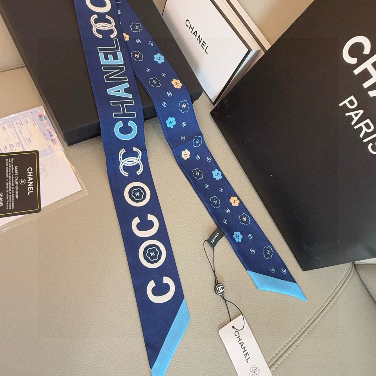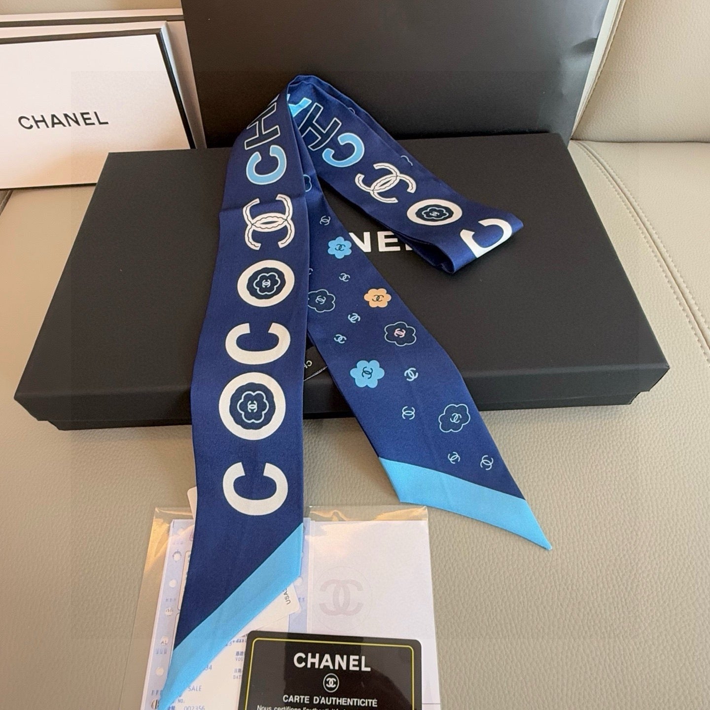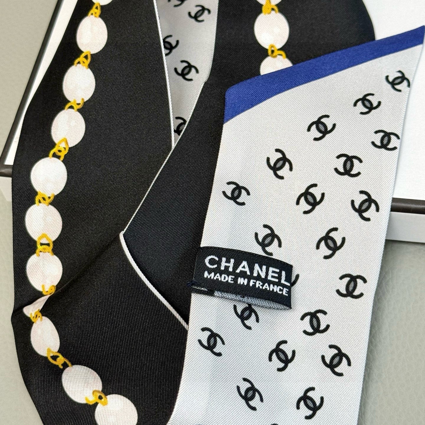 CC Twilly Mini Scarf 120cm White Navy Blue Mulberry Silk 802158