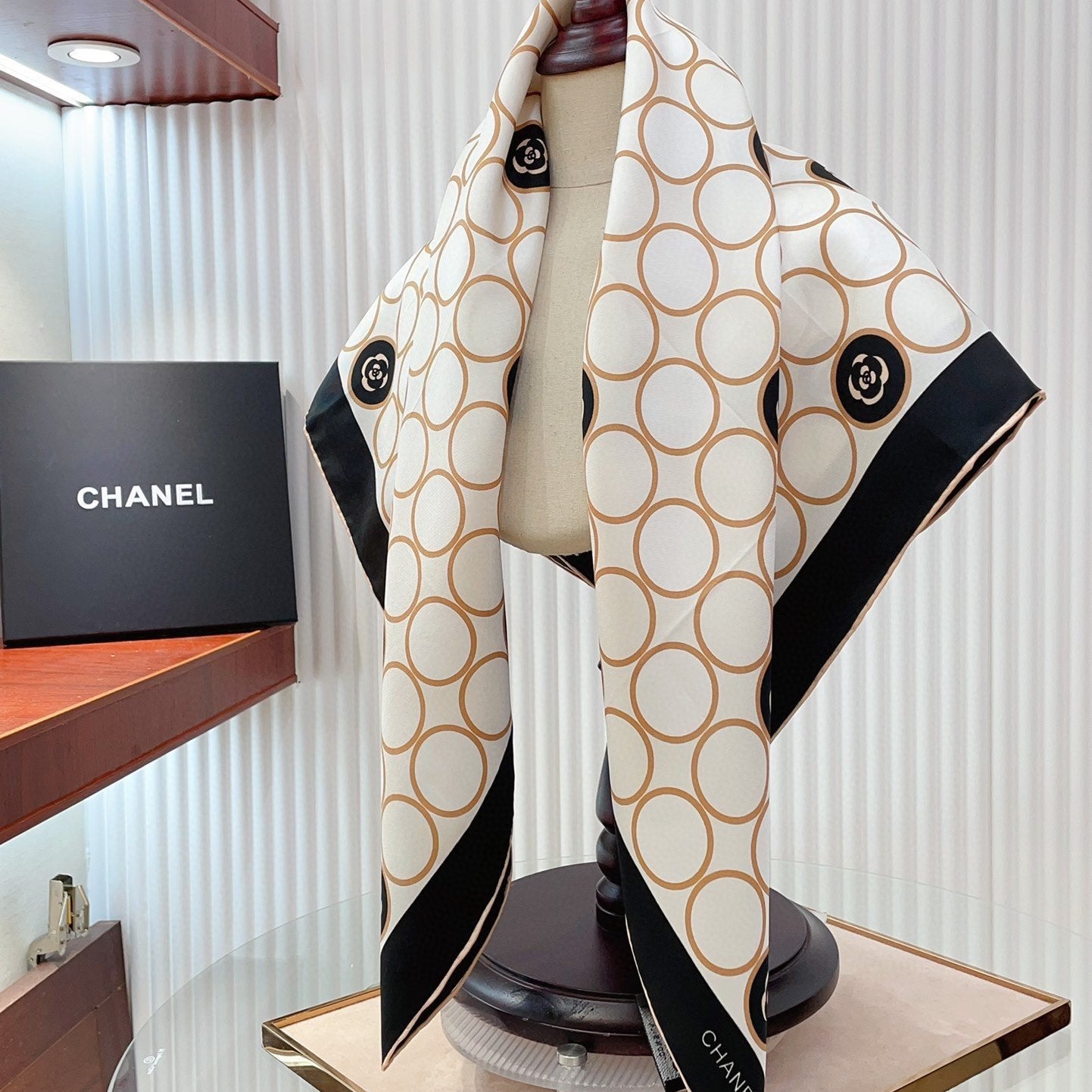 CC Square Scarf 90 CM In White Beige Mix Black Silk Twill 350414