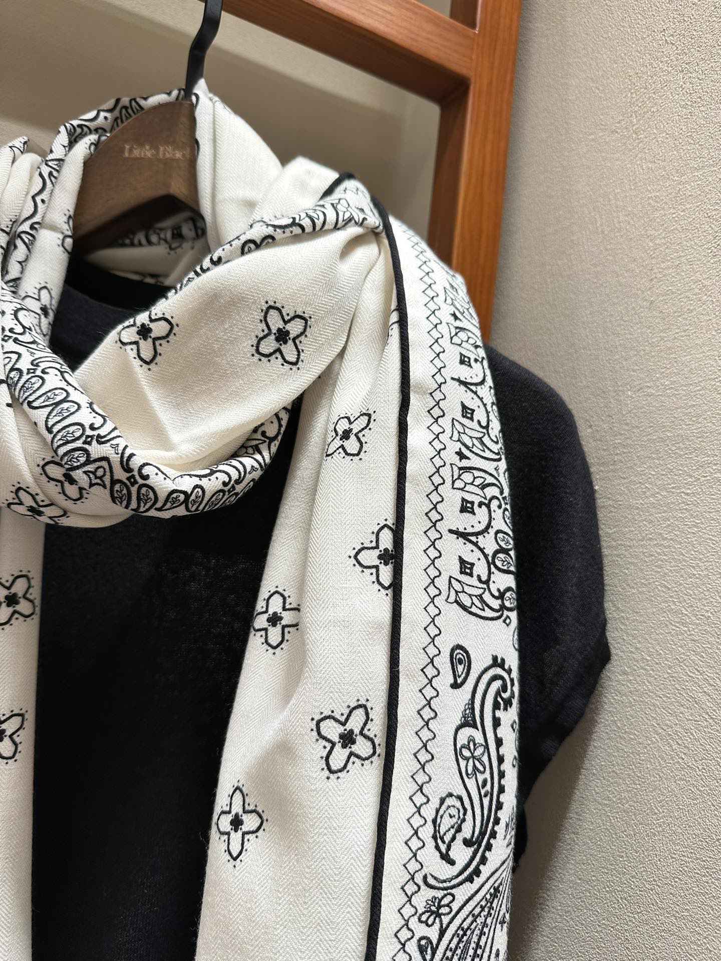 CC Scarf 200 CM In White Mix Black Small Flower Cashmere Silk 351691