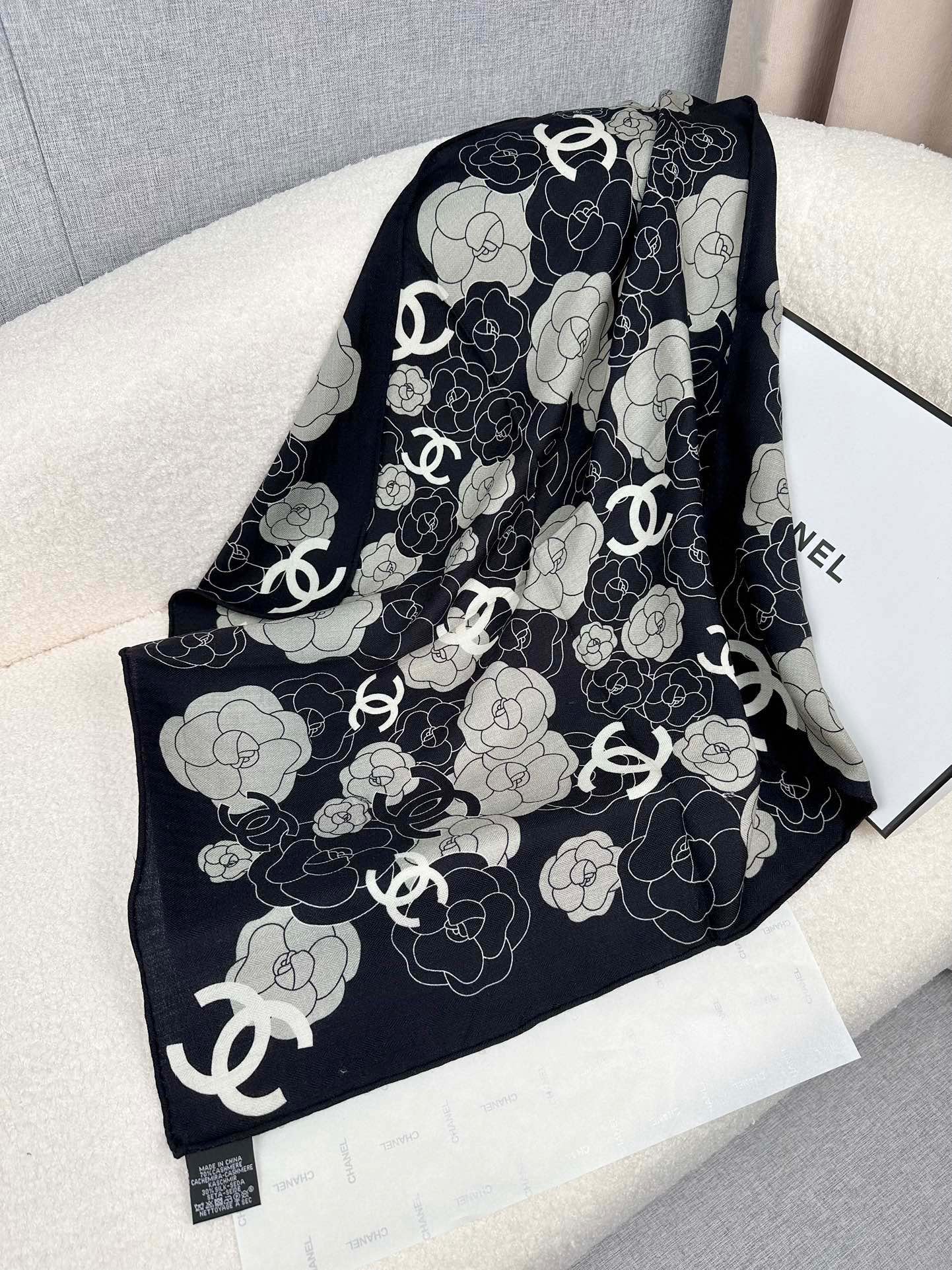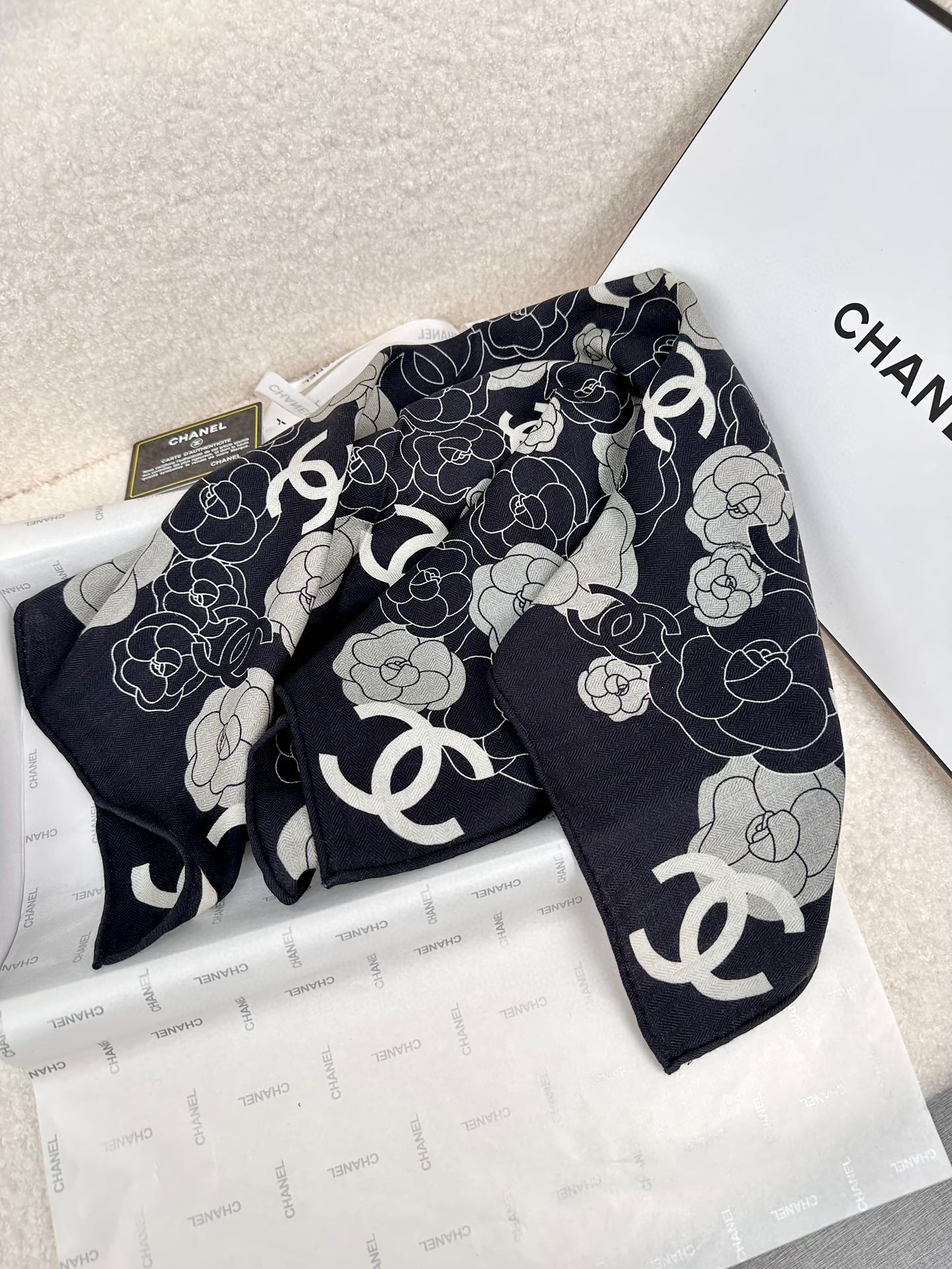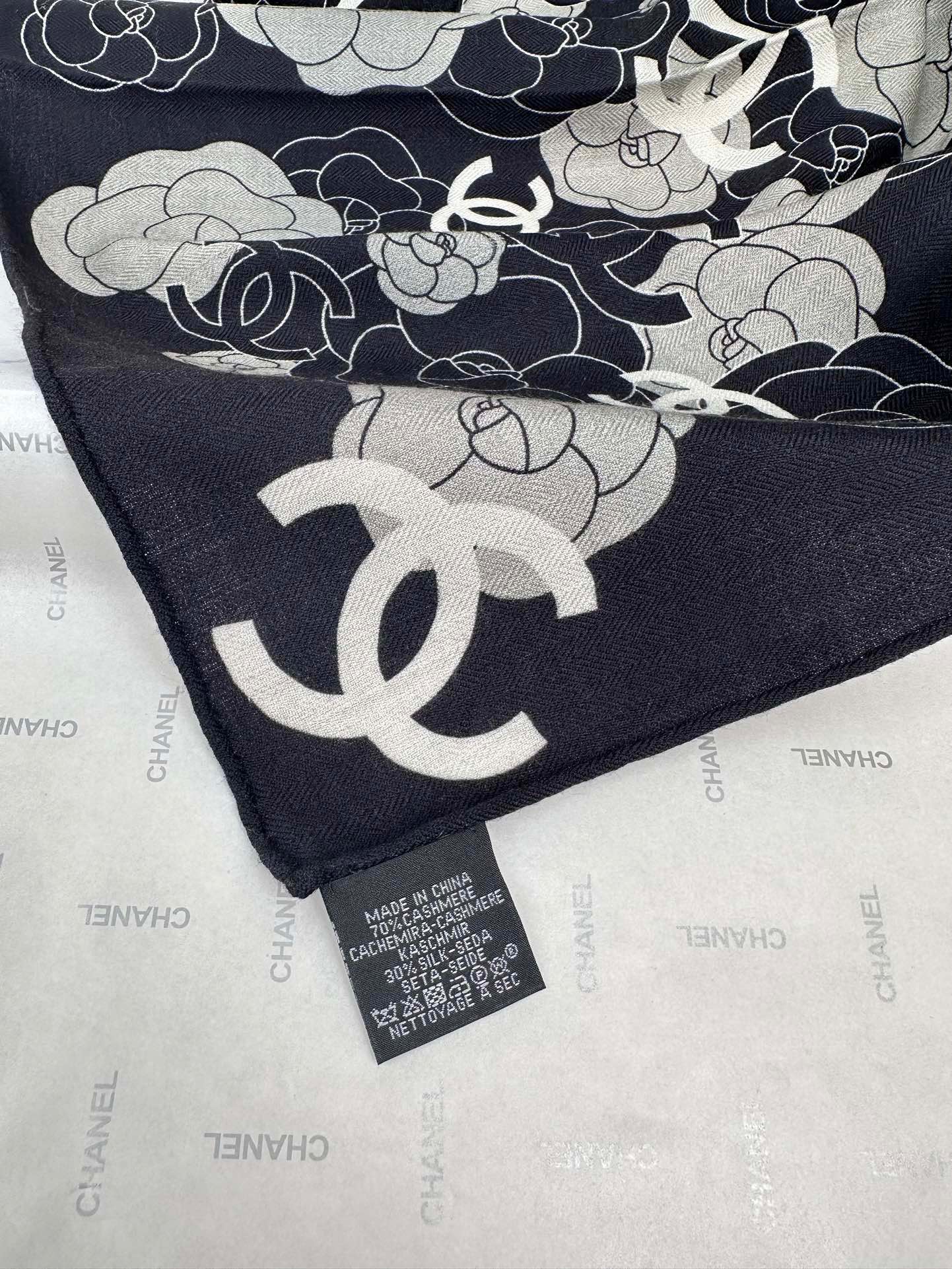 CC Square Scarf 70 CM In Black Mix White Ivory Camellia Cashmere And Silk 367381