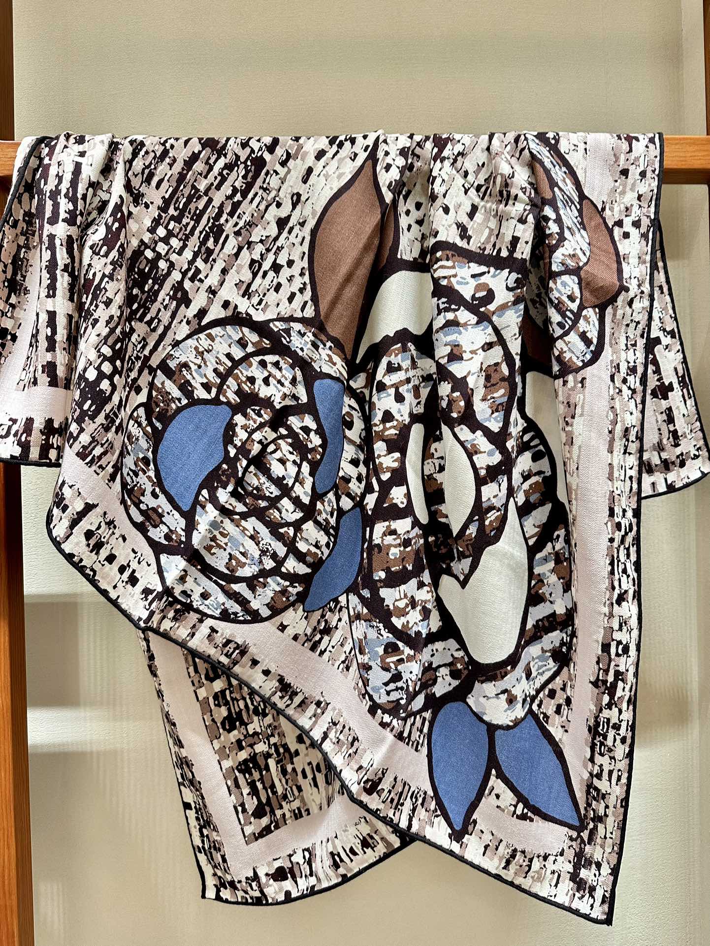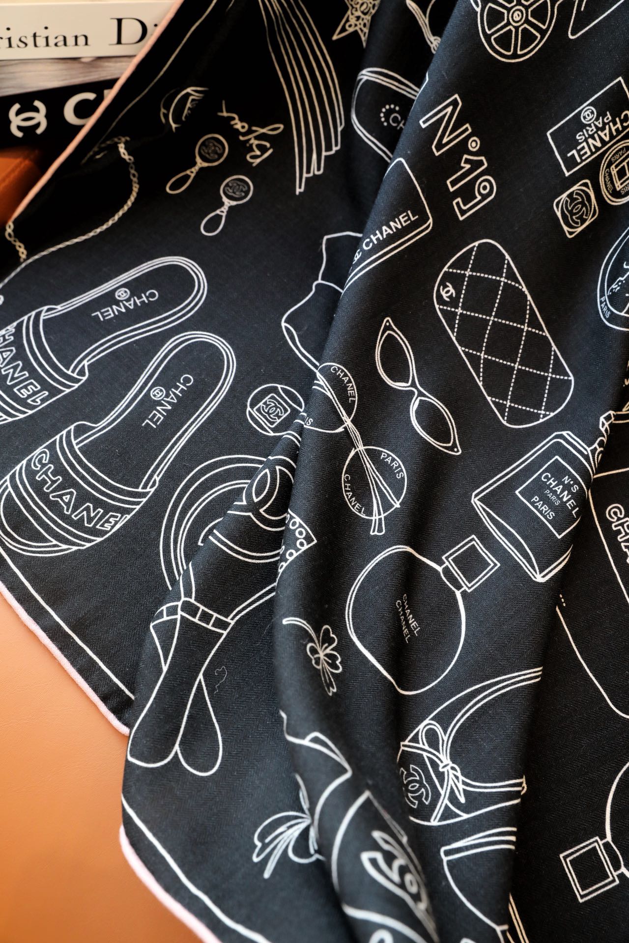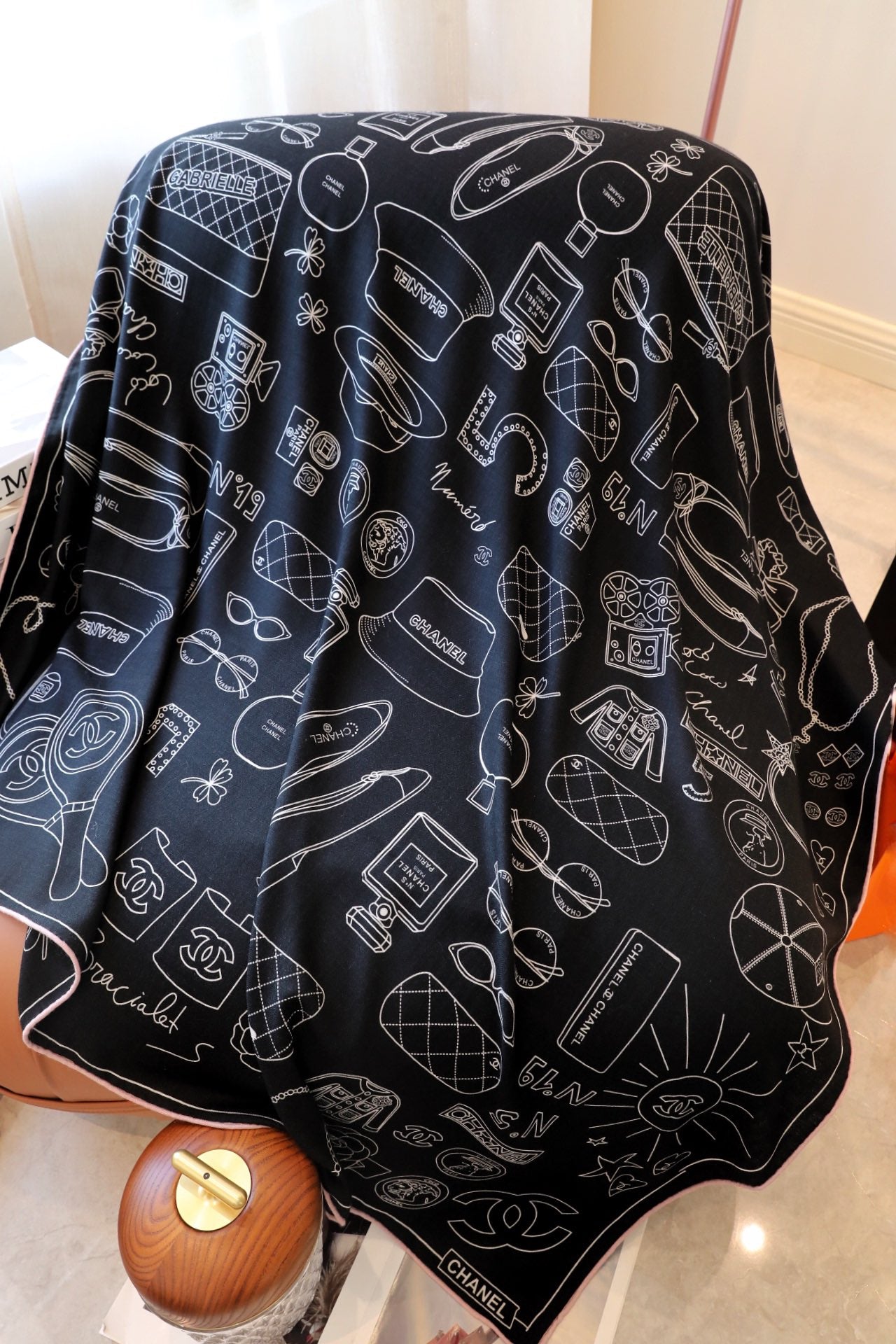 CC Square Scarf 70 CM In Black Mix White Ivory Camellia Cashmere And Silk 367381