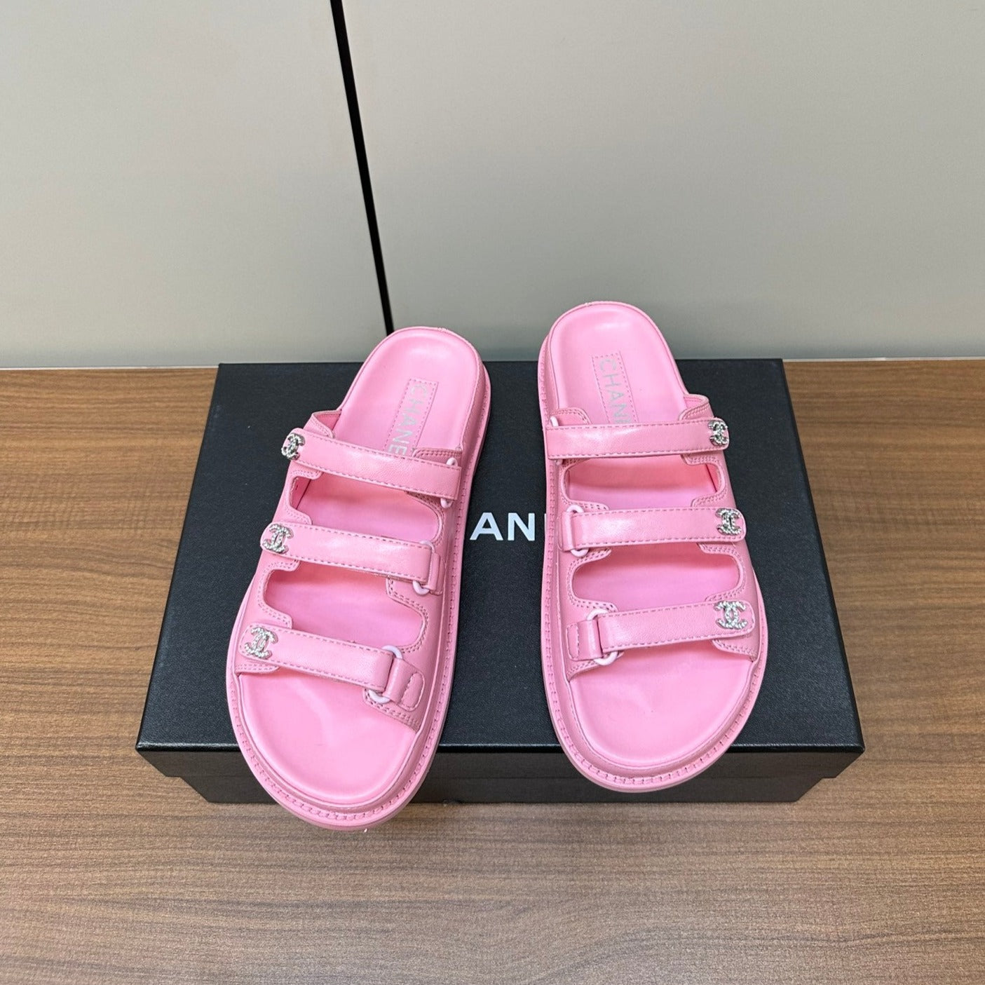 dad sandals pink triple strap lambskin mules