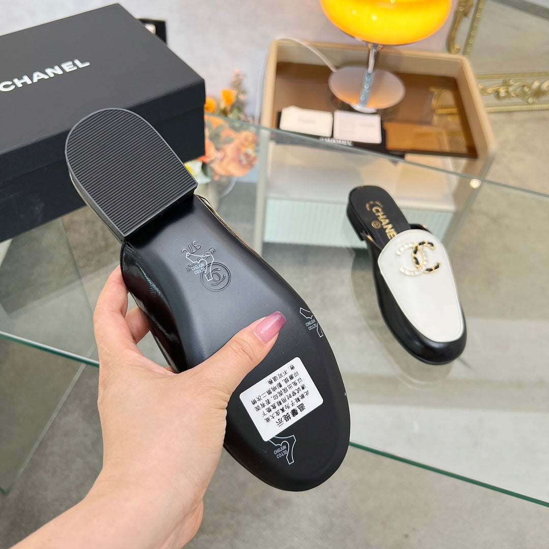 CC 25 Mule Black White Calfskin Large Double C Logo