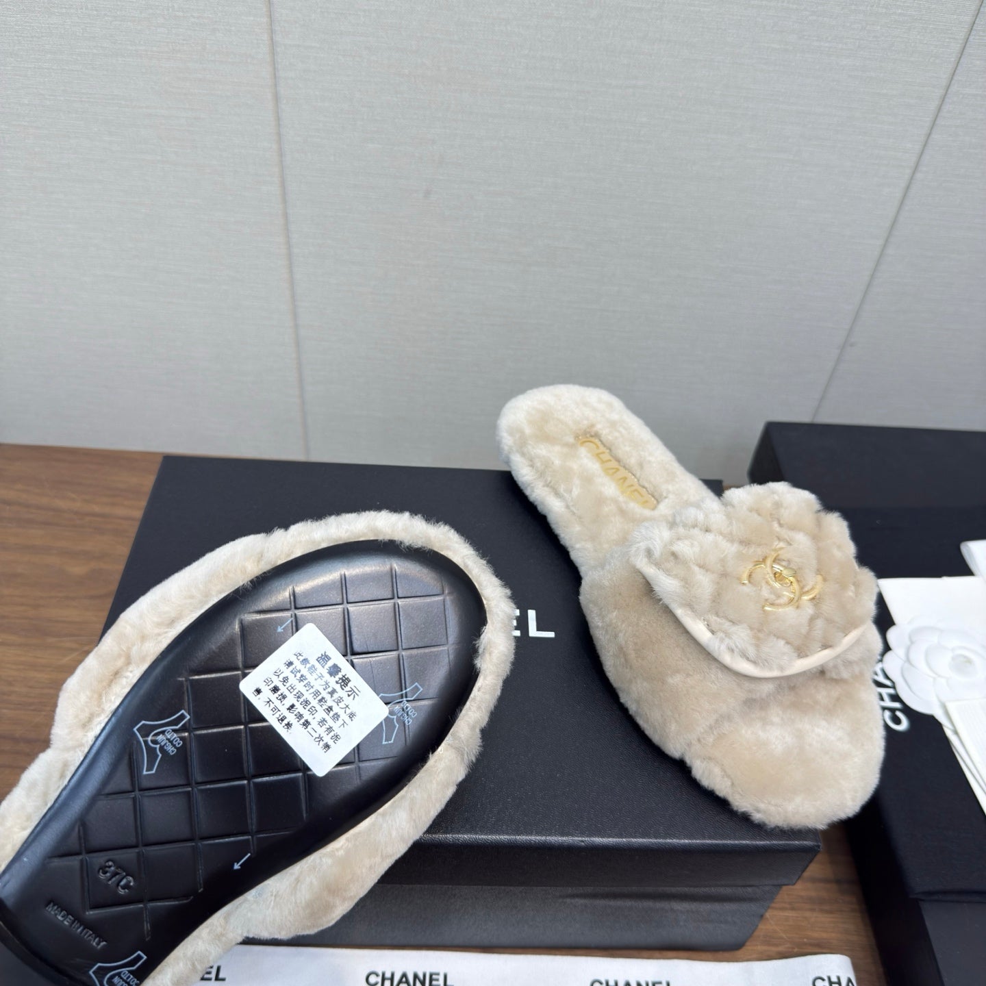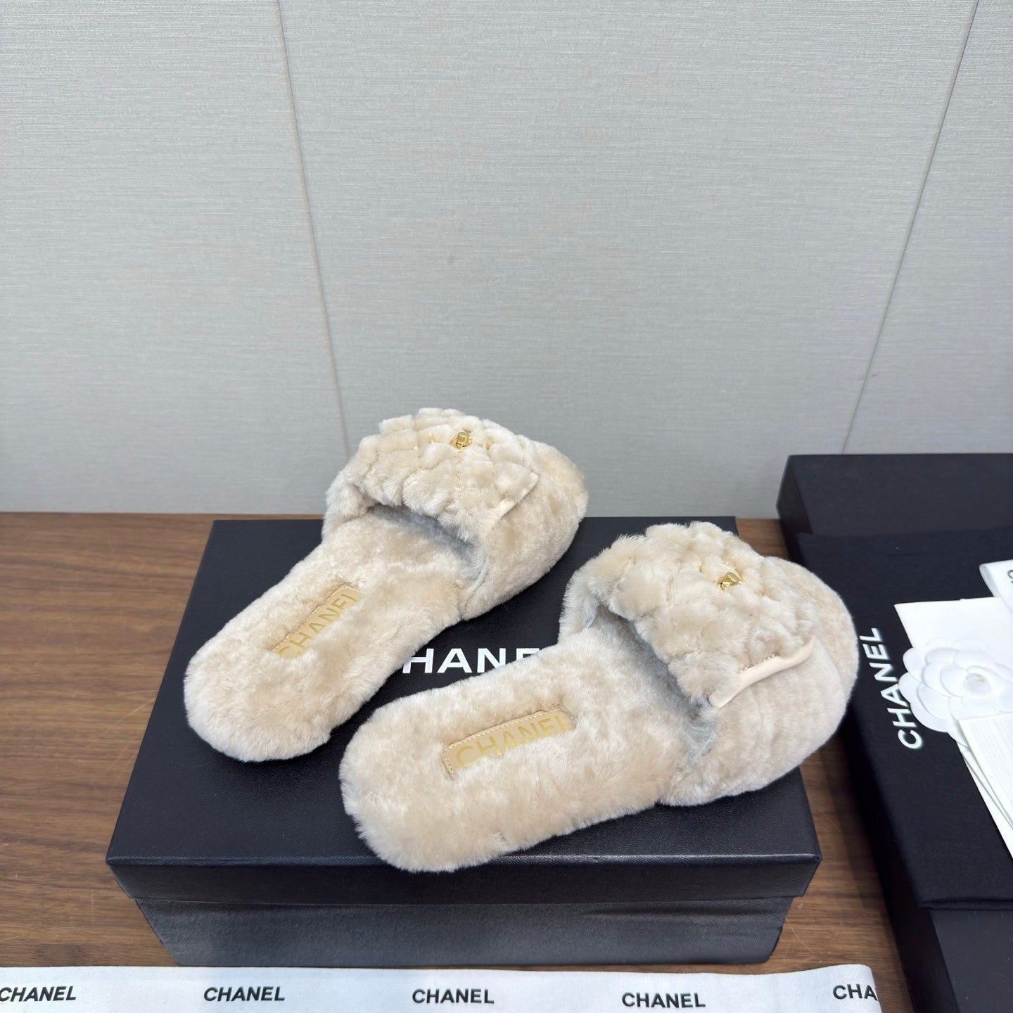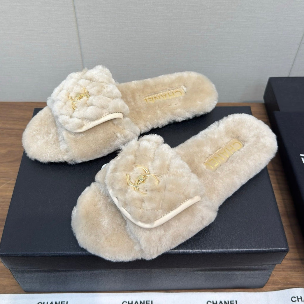Chanel 25 Slipper Beige Smooth Lambwool 465601