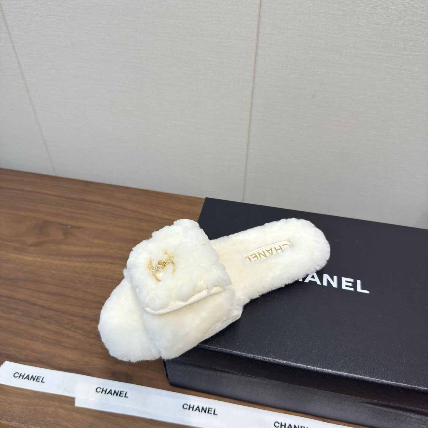 Chanel 25 Slipper White Smooth Lambwool 465603