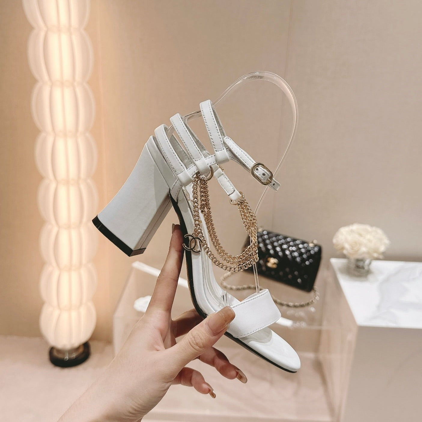 CC Little Camellia World Thin High Heels White Lambskin