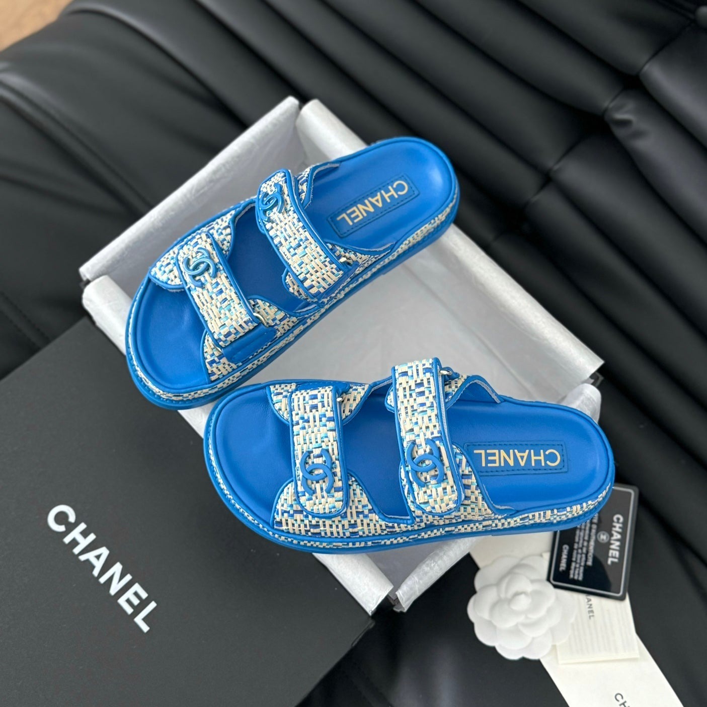 Double C Classic One-Strap Sandals White Navy Blue Lambskin