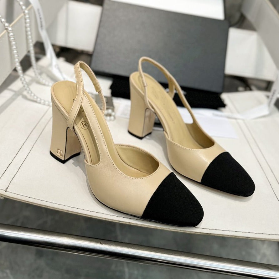 slingback 90 beige calfskin black grosgrain