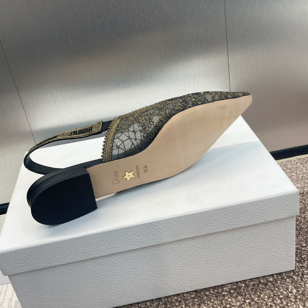 cd slingback flat transparent mesh embroidered black flower moitf