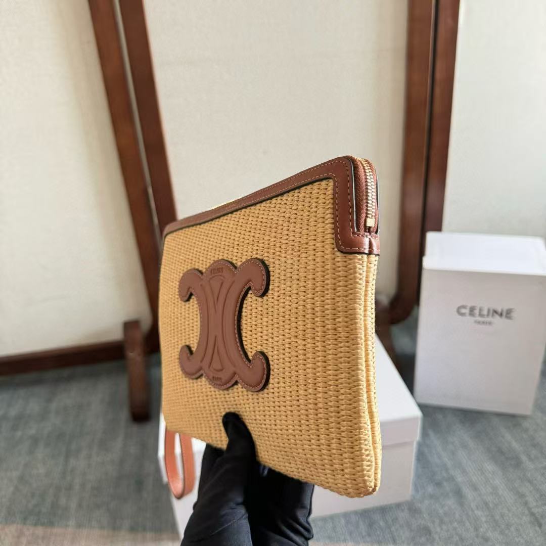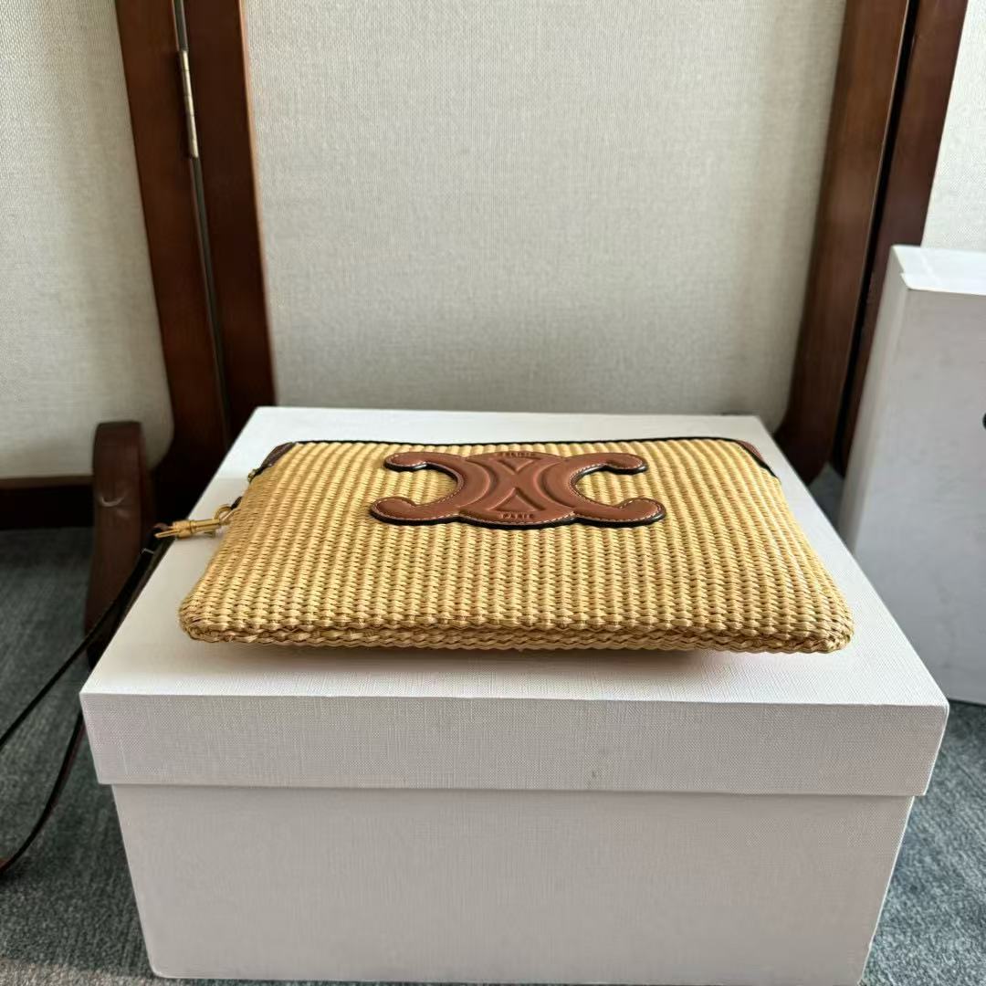 CELINE SMALL POUCH BEIGE BROWN RAFFIA CALFSKIN