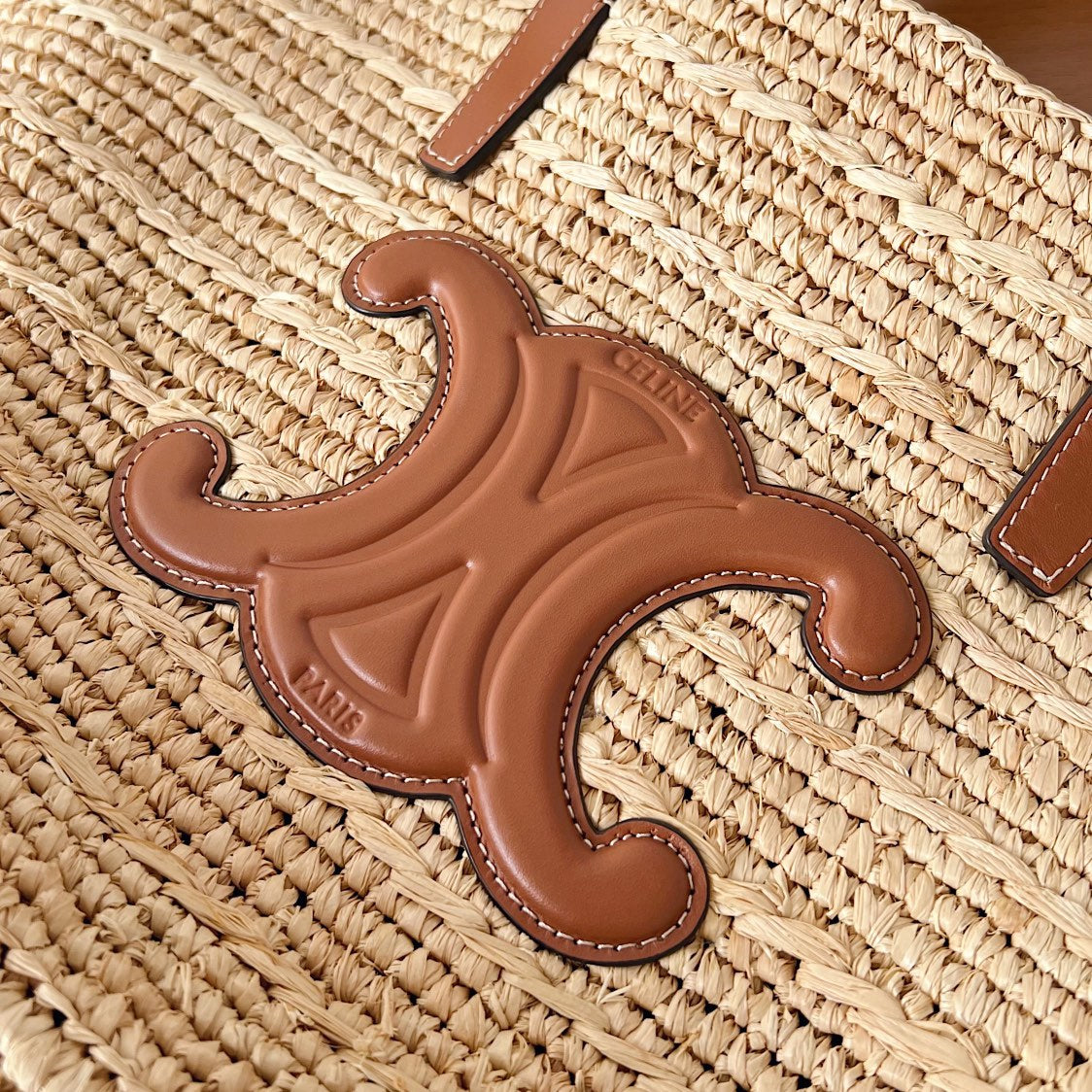 Celine Classic Panier 47cm Braieded Triomphe Beige Raffia Brown Calfskin
