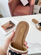 Celine 25C Slippers Beige mix Black Fabric with Calfskin 238158