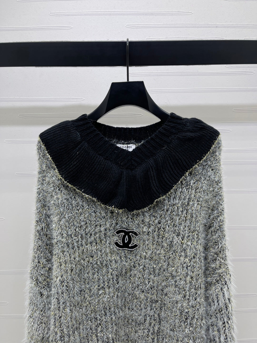 Chanel 2025 Ruffled Collar Shimmering Sweater Gray Black Polyester Wool 319566