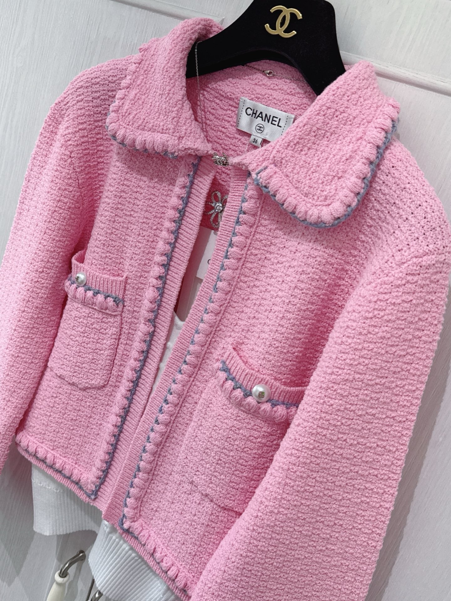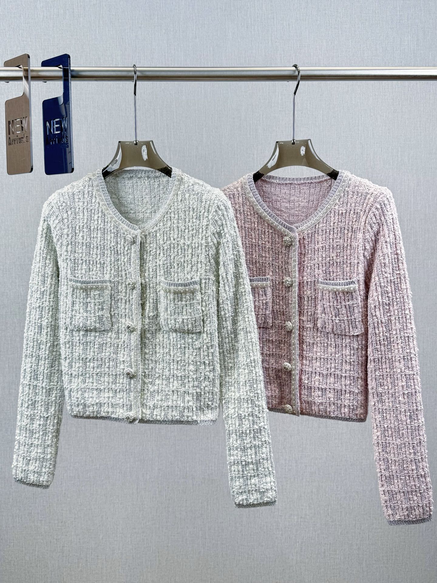 Chanel 2025 Ruffled Collar Shimmering Sweater Beige Pink Polyester Wool 319565