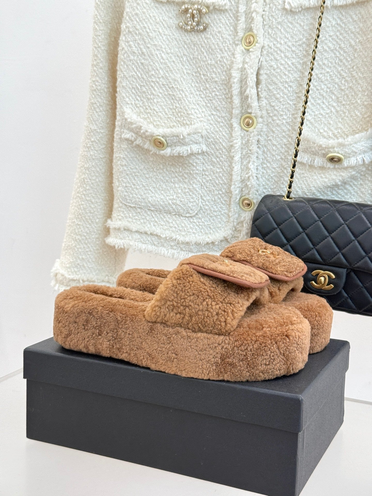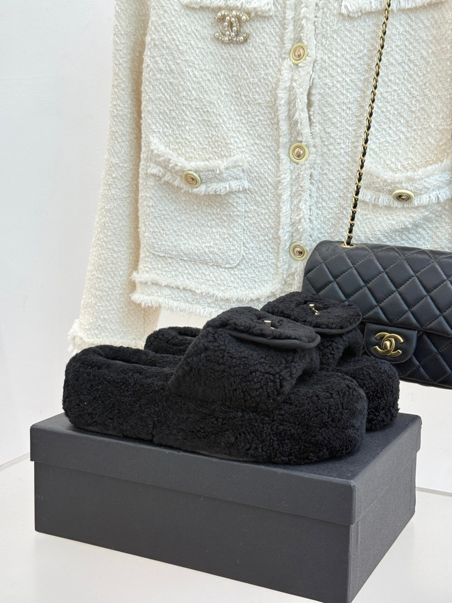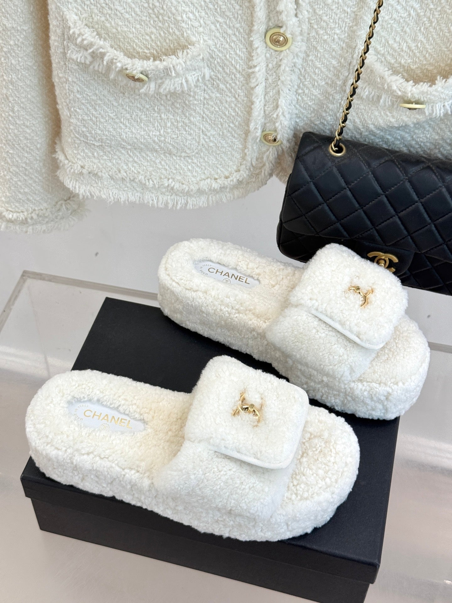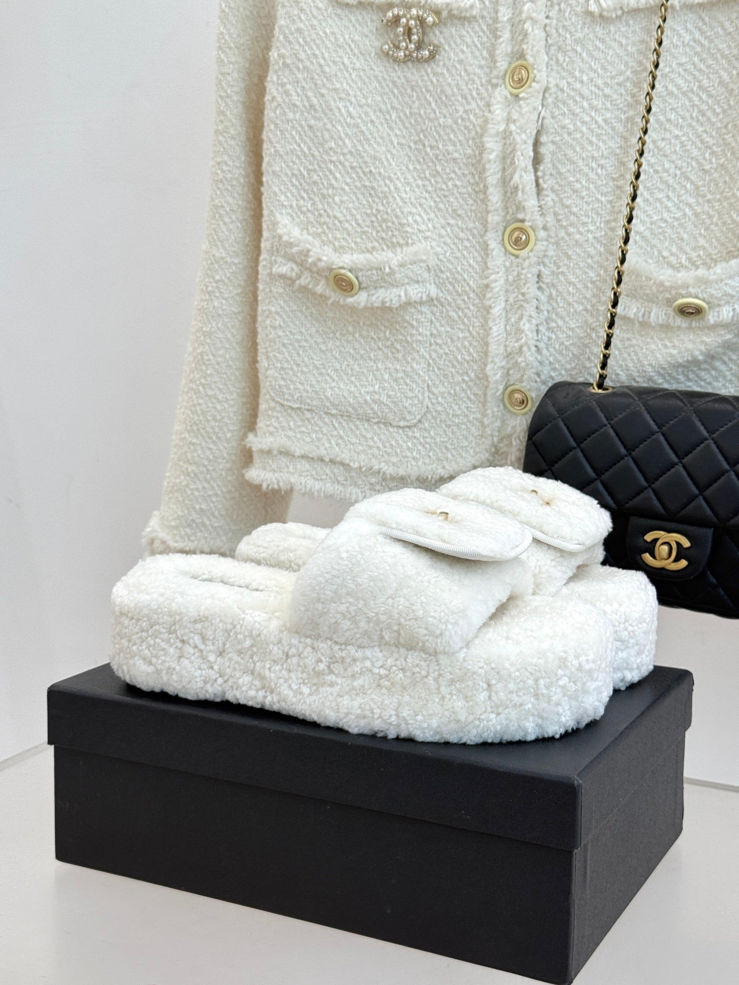 Chanel 25 Buckle Flip-up Thick-soled Slippers White Wool 465383