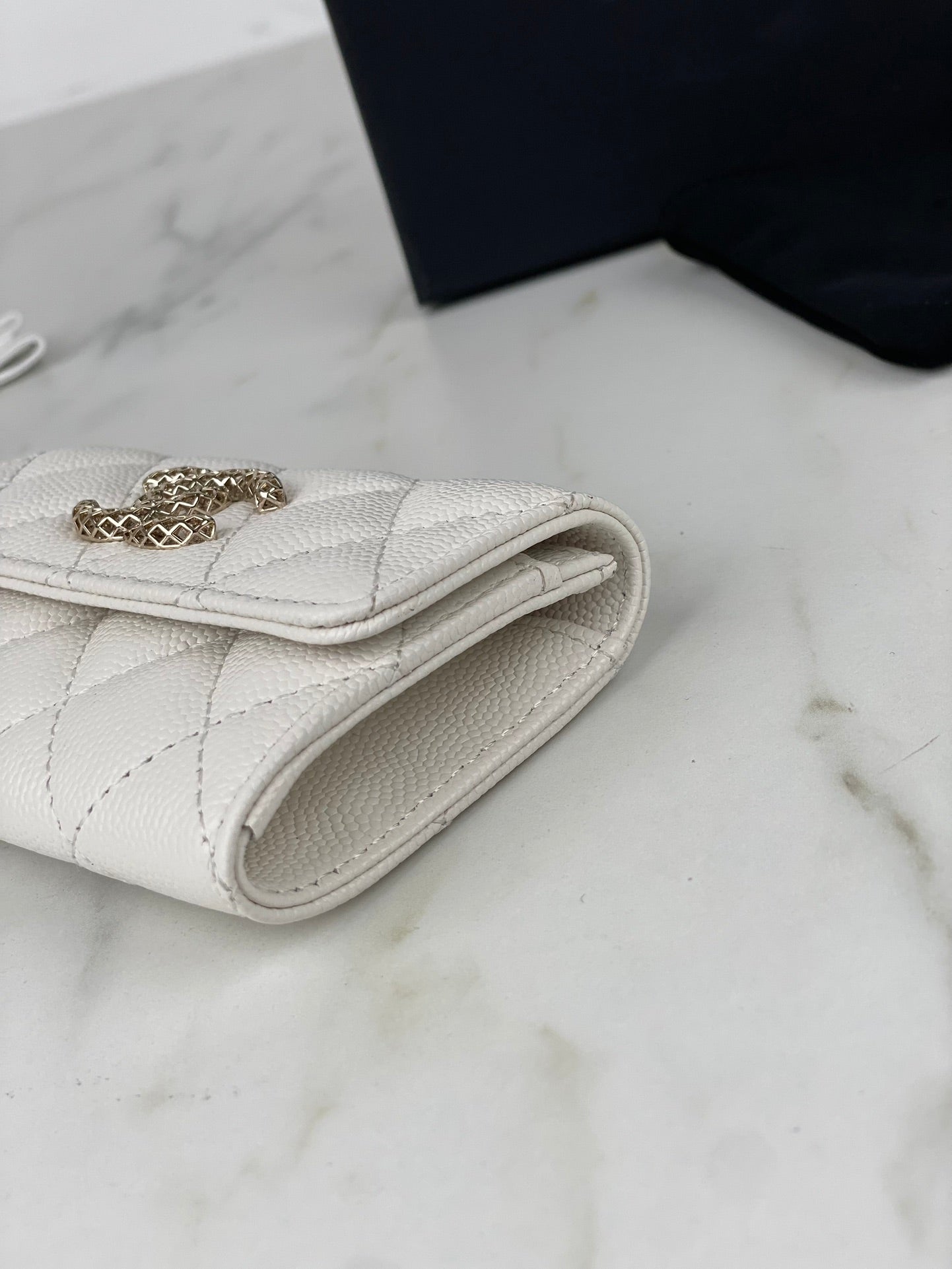 CC FLAP CARD HOLDER 11.3 WHITE GRAINED CALFSKIN GOLD ICON