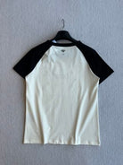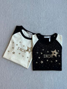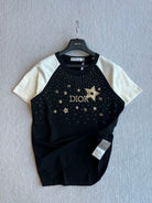 CD Rhinestone Embroidered Short-sleeved T-shirt Black and Beige Cotton