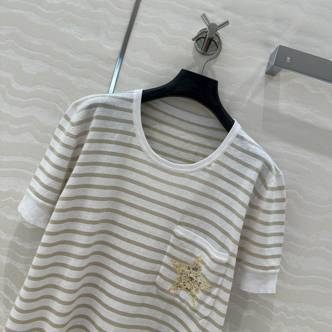 CD 25 Star Embroidery Knitted Short-sleeved Top White Tencel Wool