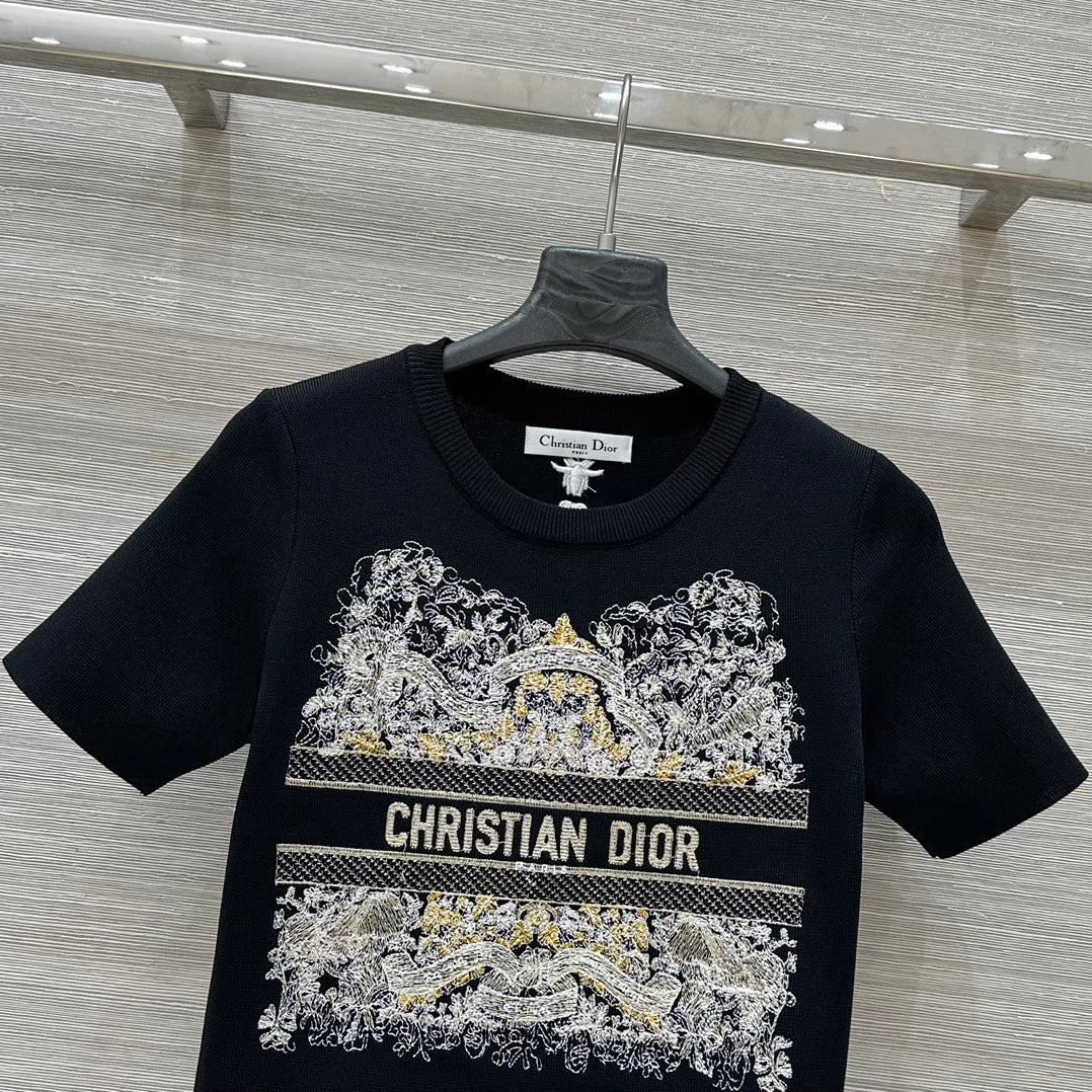 CD 25 Star Embroidery Knitted Short-sleeved Top Black Tencel Wool