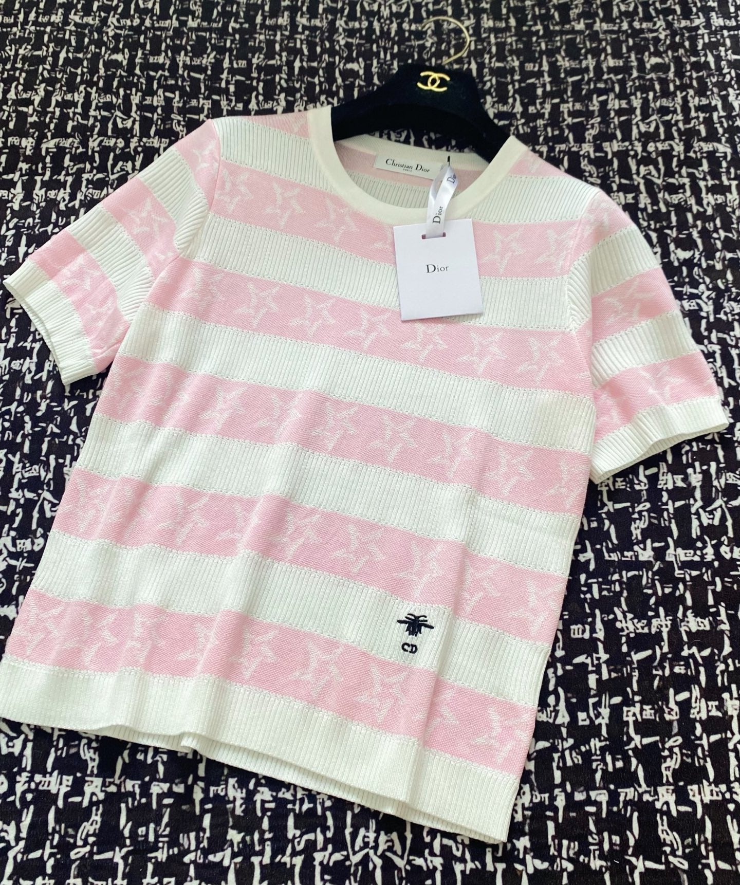 CD 2025 Striped Short-sleeved T-shirt Pink White tencel 606660