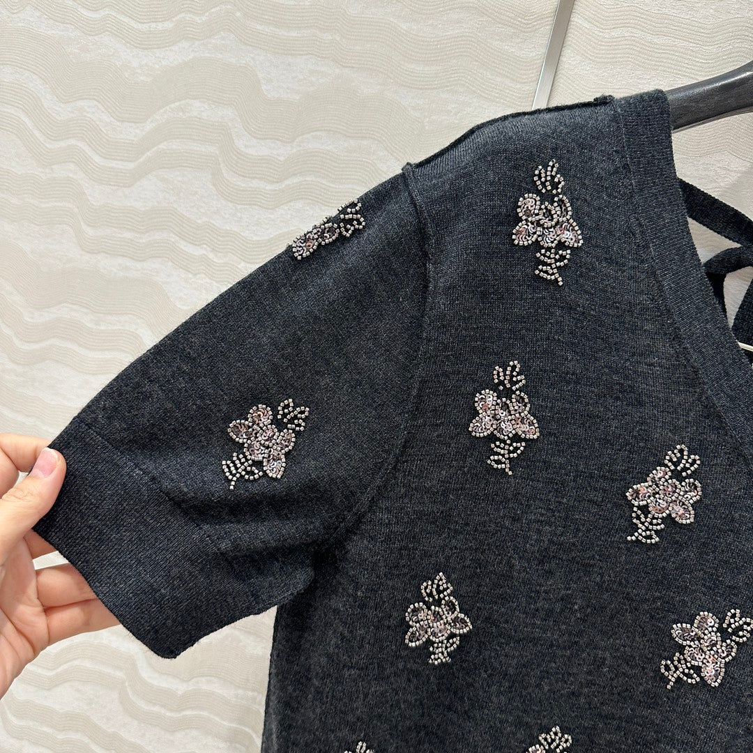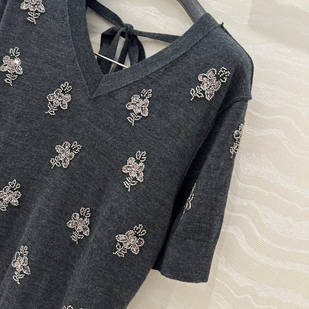 Fendi Beaded Flower V-neck Knitted Small Top Black Gray Wool