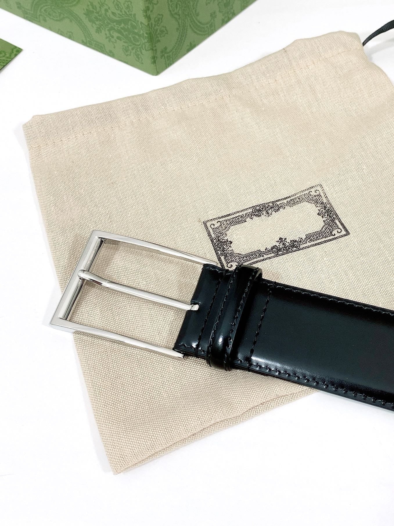 G BELT SILVER SQUARE BUCKLE BLACK LEATHER 3.5CM