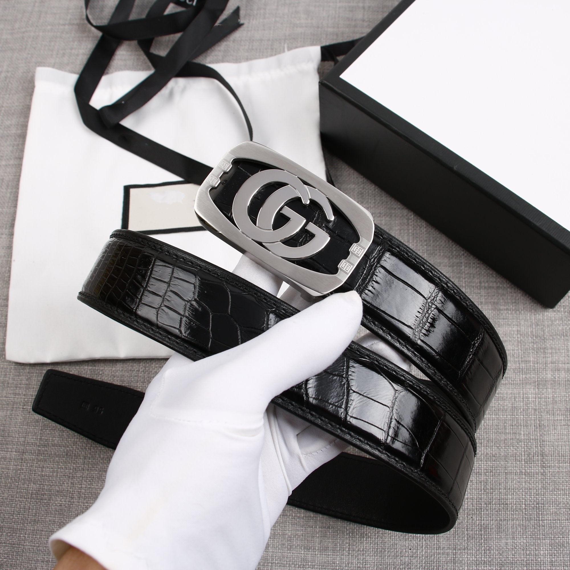 G BELT SILVER BUCKLE CROCODILE POLISHED BLACK 3.8CM