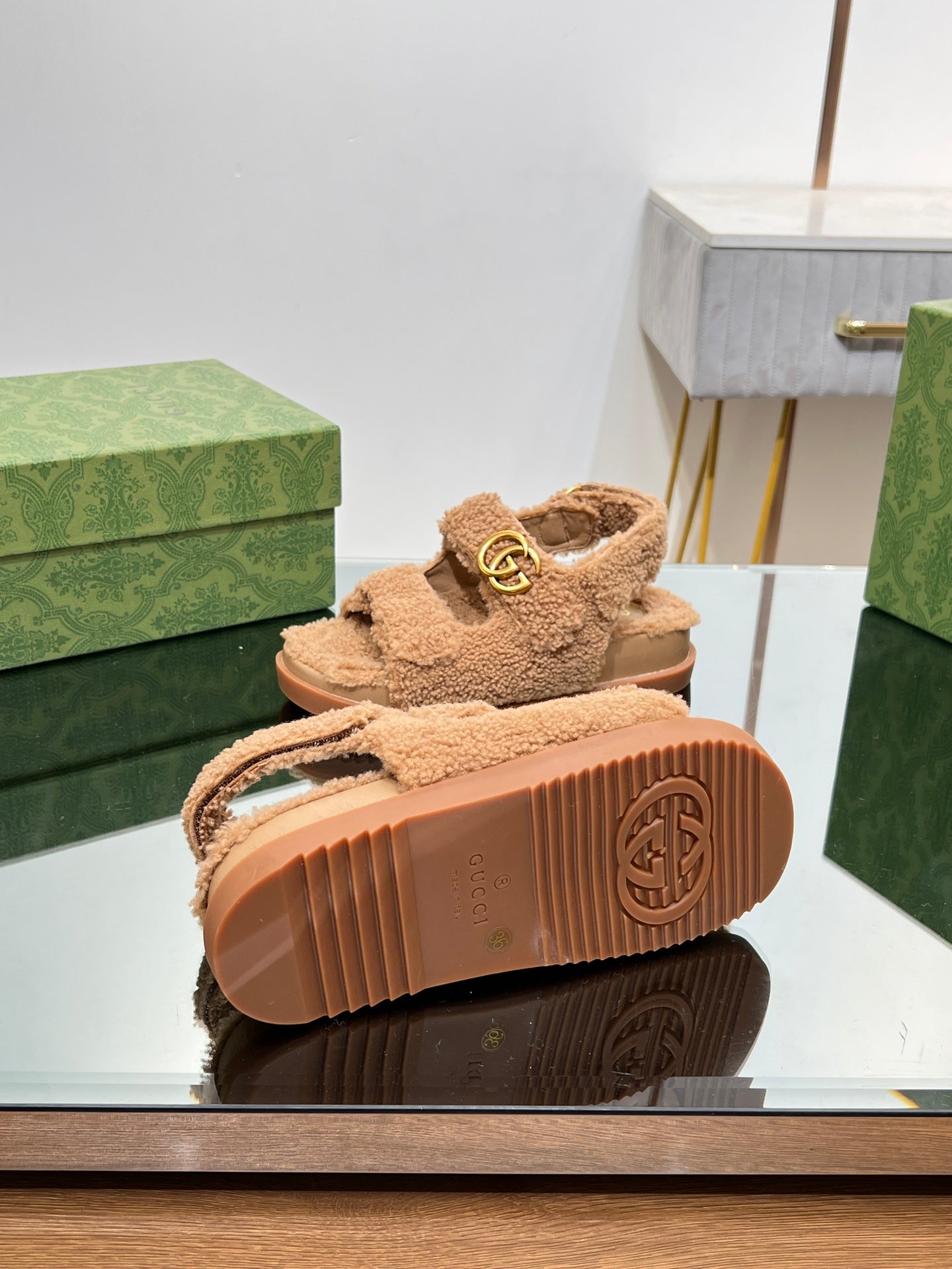 GG MOLLY MULE IN CAMEL BROWN MONOGRAM JACQUARD FABRIC AND SHEARLING LINING