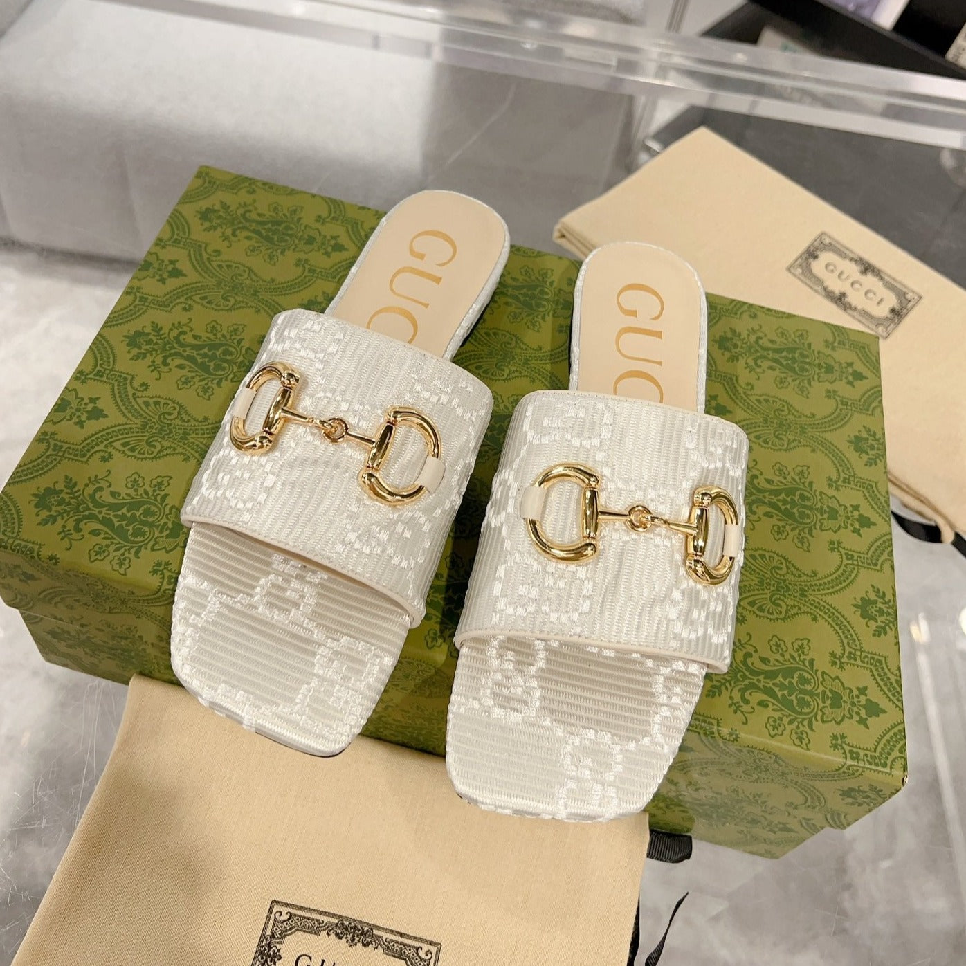 GG CRYSTAL SLIDES SANDAL WHITE CALFSKIN