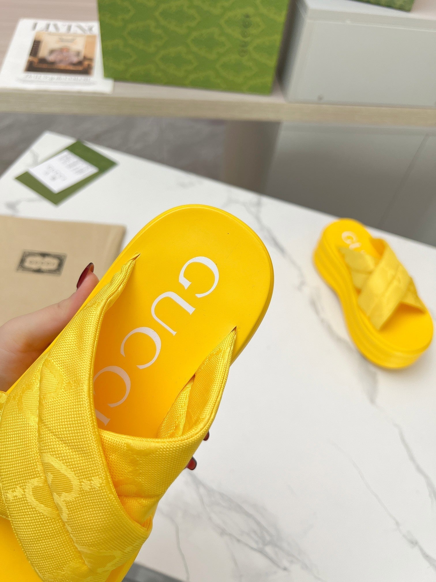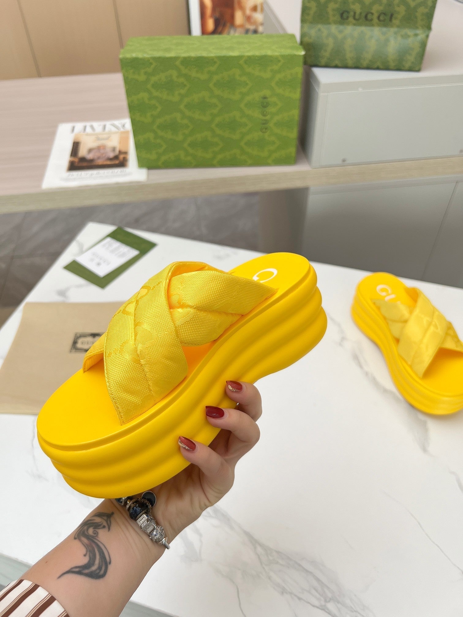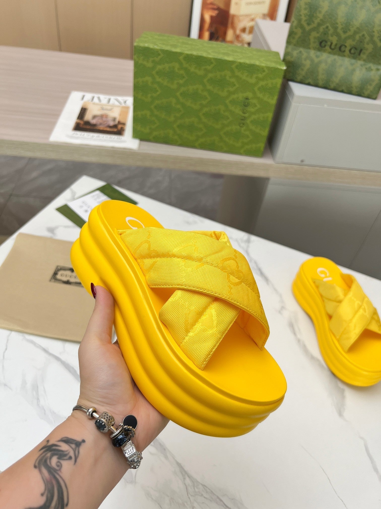 GG waterproof platform slippers yellow fabric
