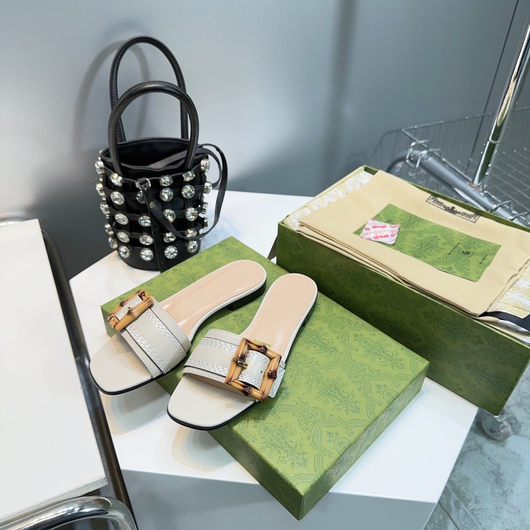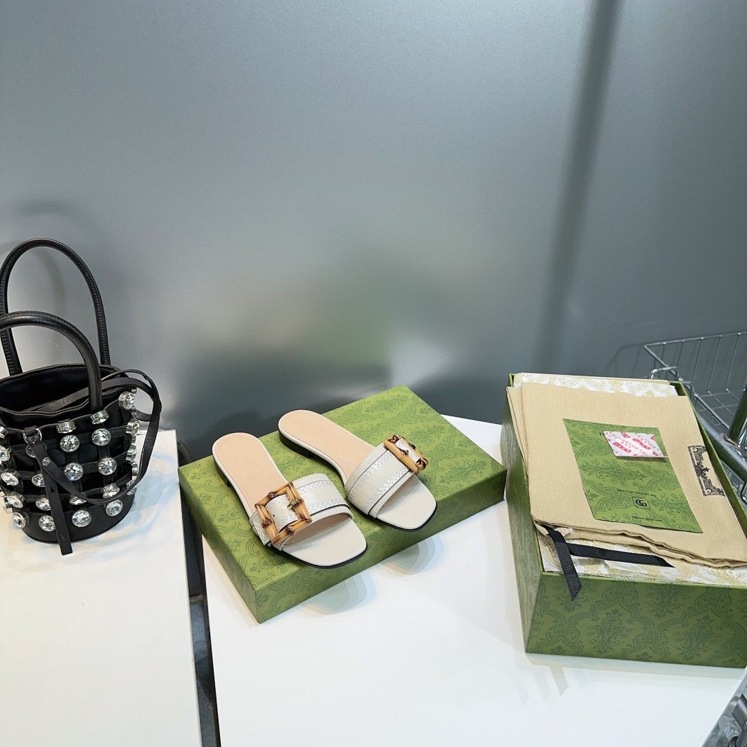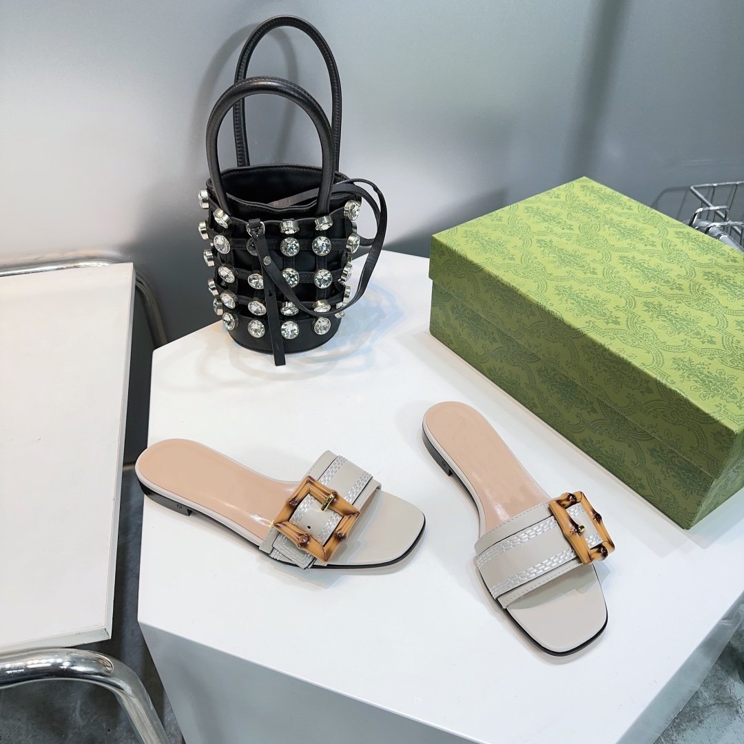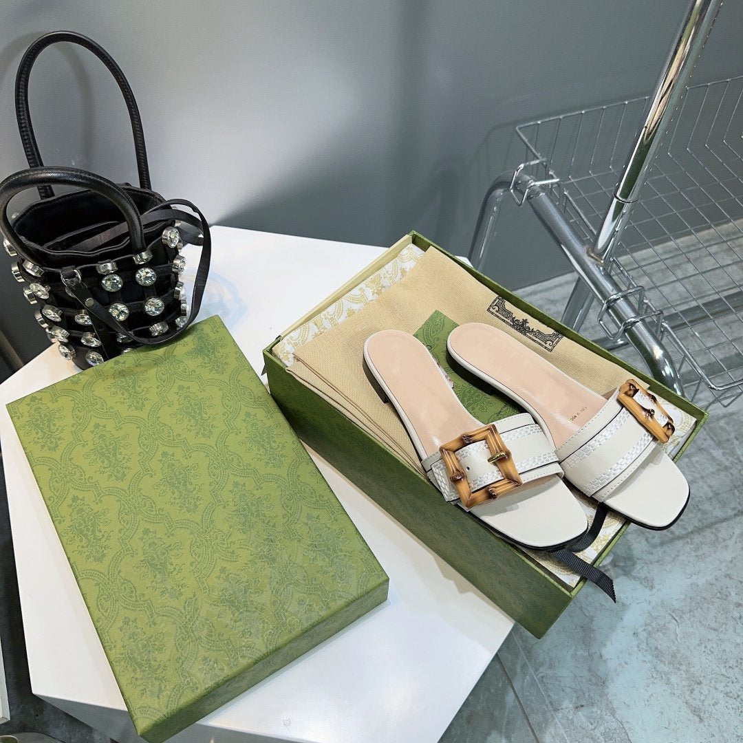 GG BAMBOO BUCKLE FLAT SANDALS WHITE
