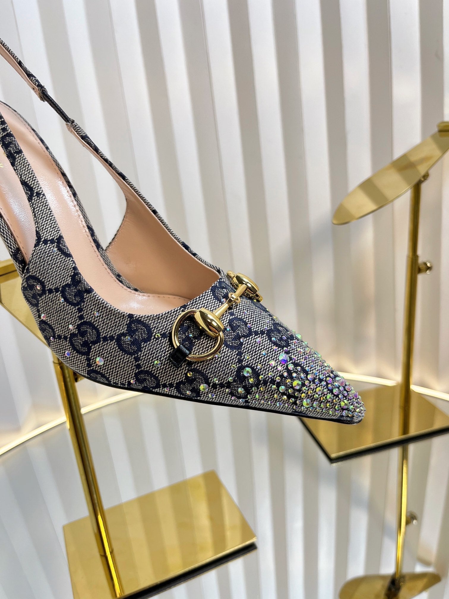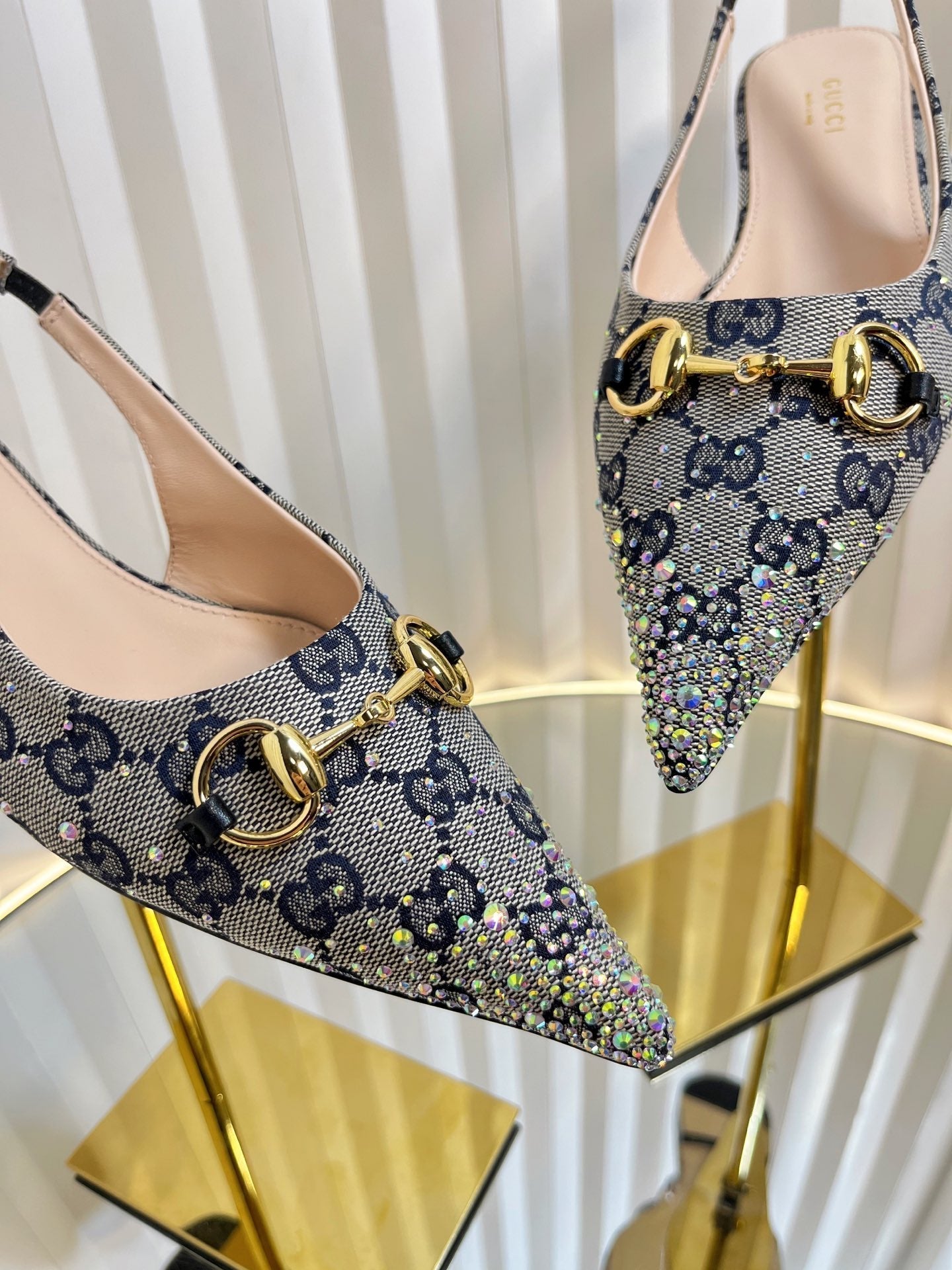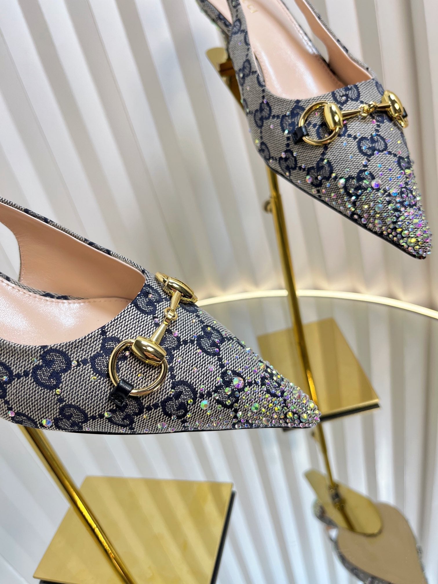 GG Horsebit Slingback 85MM Beige Cloud Blue Monogram Canvas Point Toe Crystal-Embellished