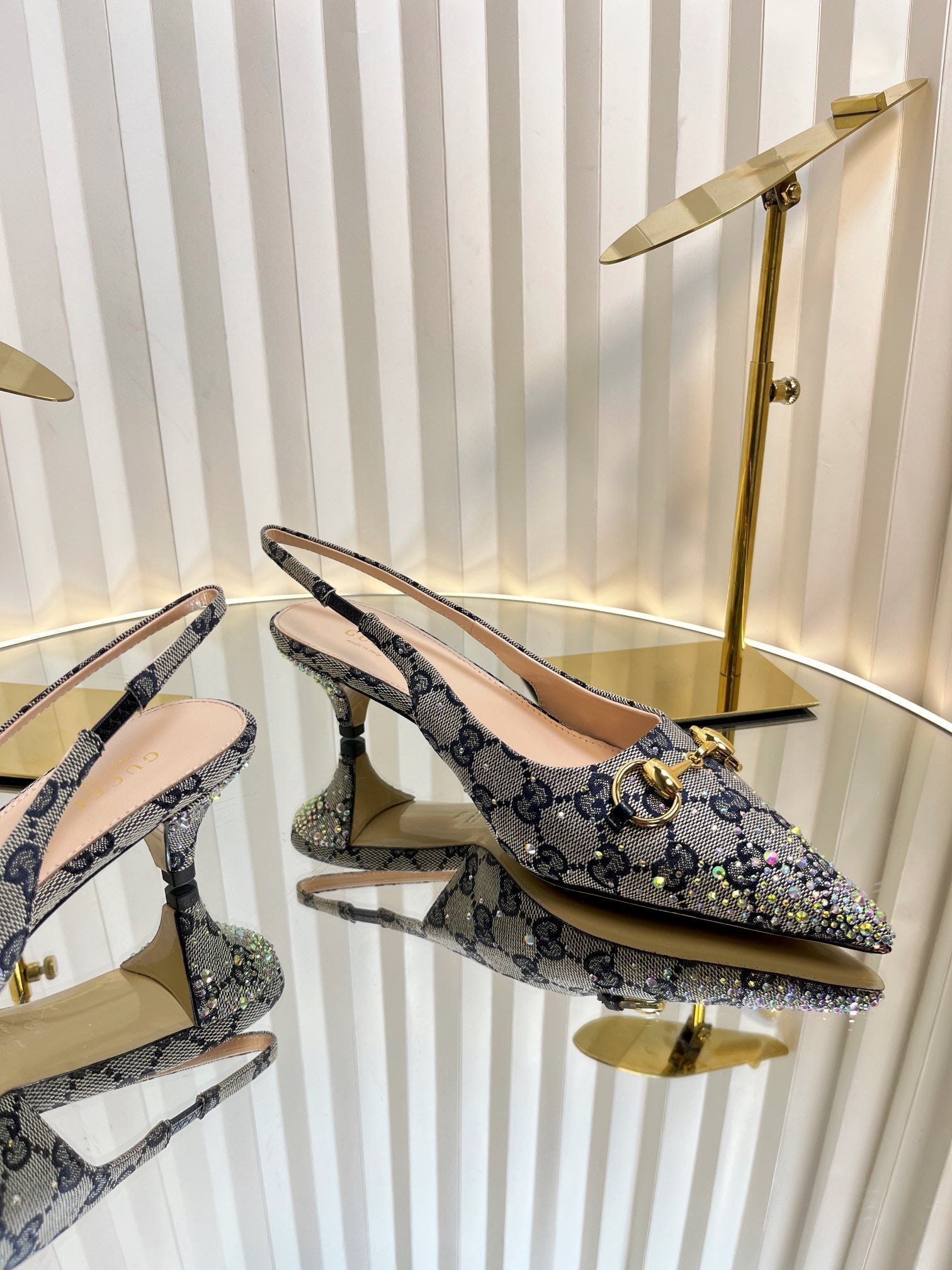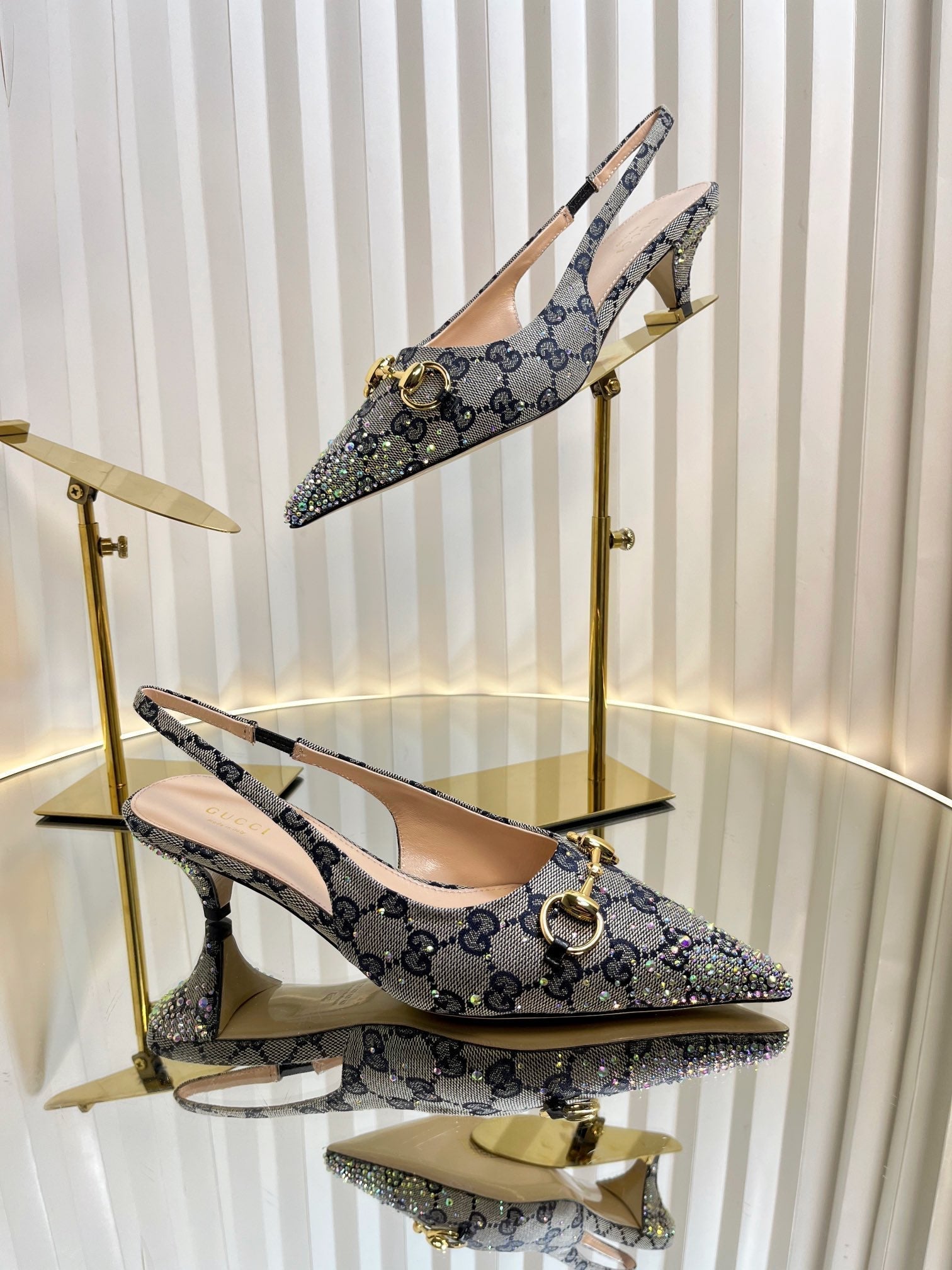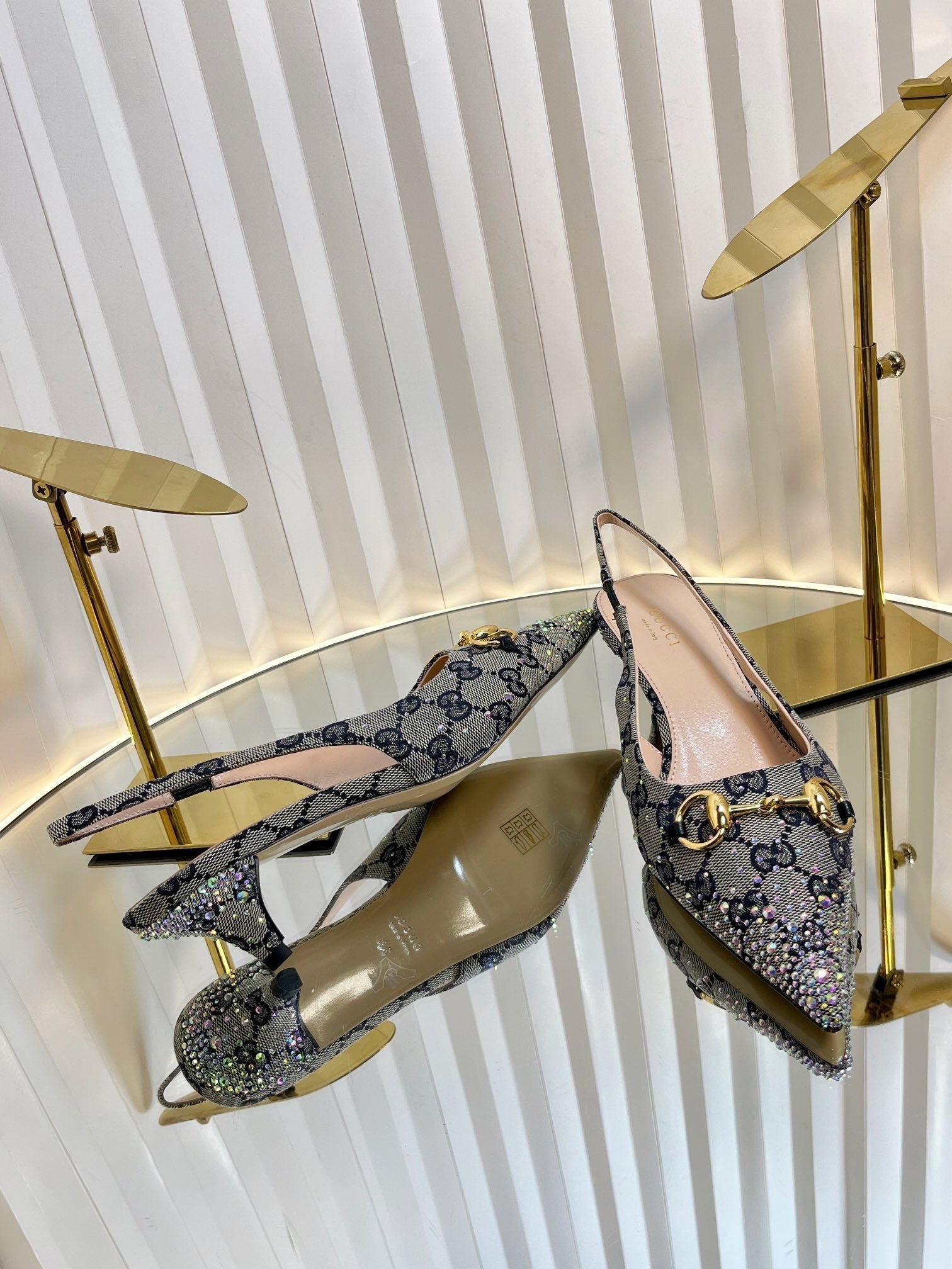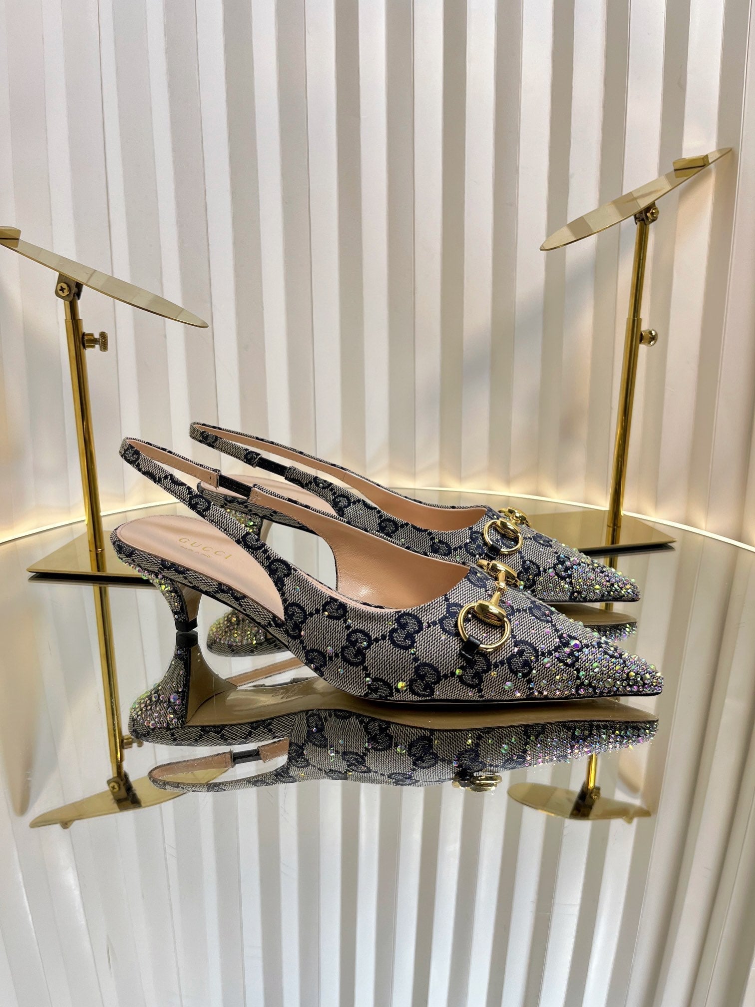 GG Horsebit Slingback 45MM Black Ebony Monogram Canvas Point Toe Crystal-Embellished
