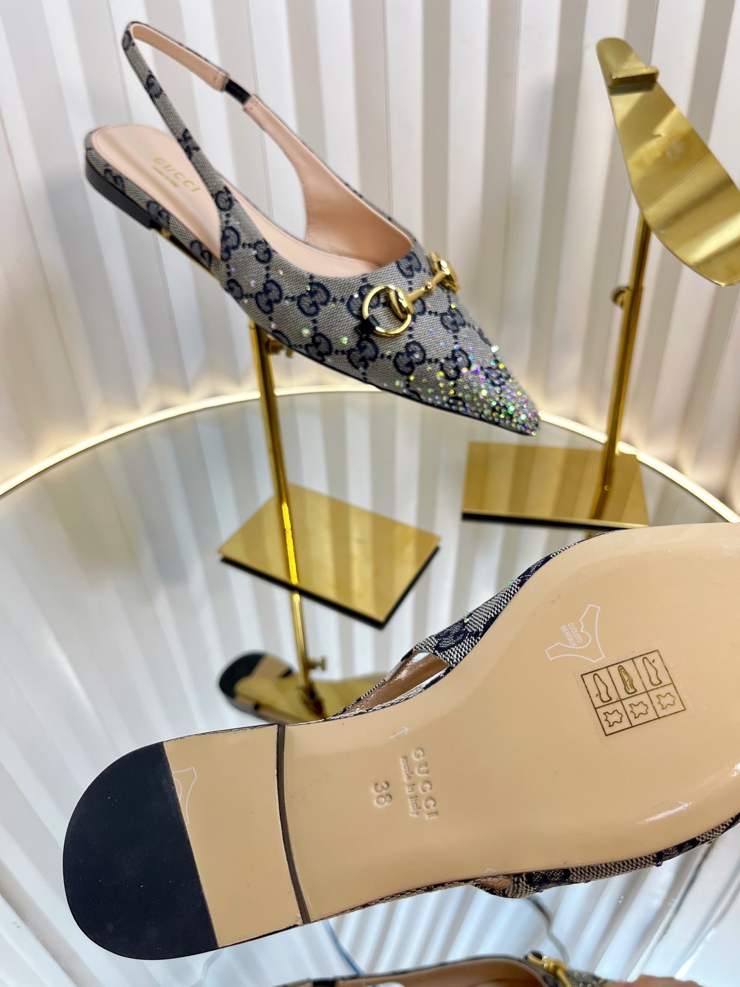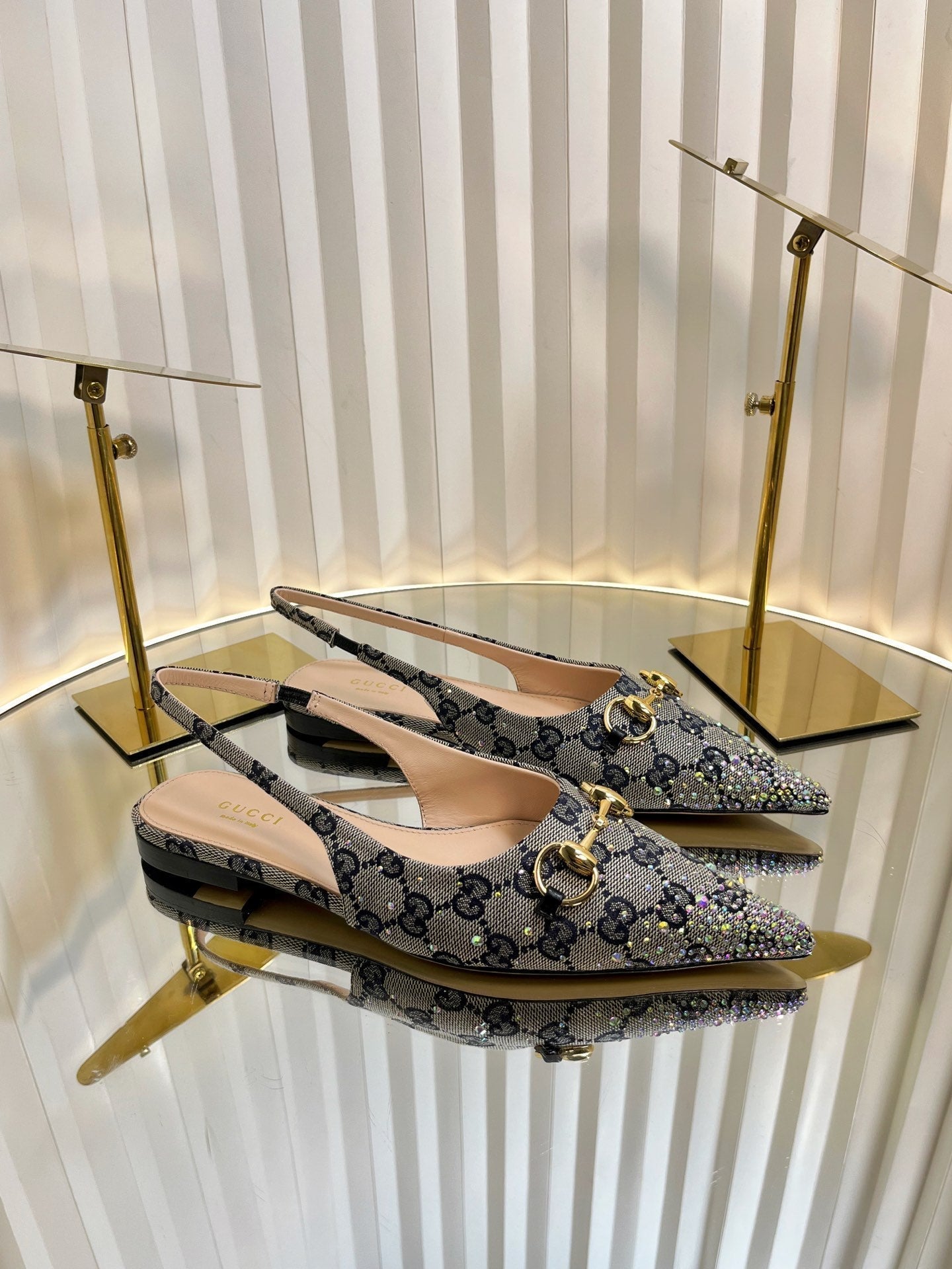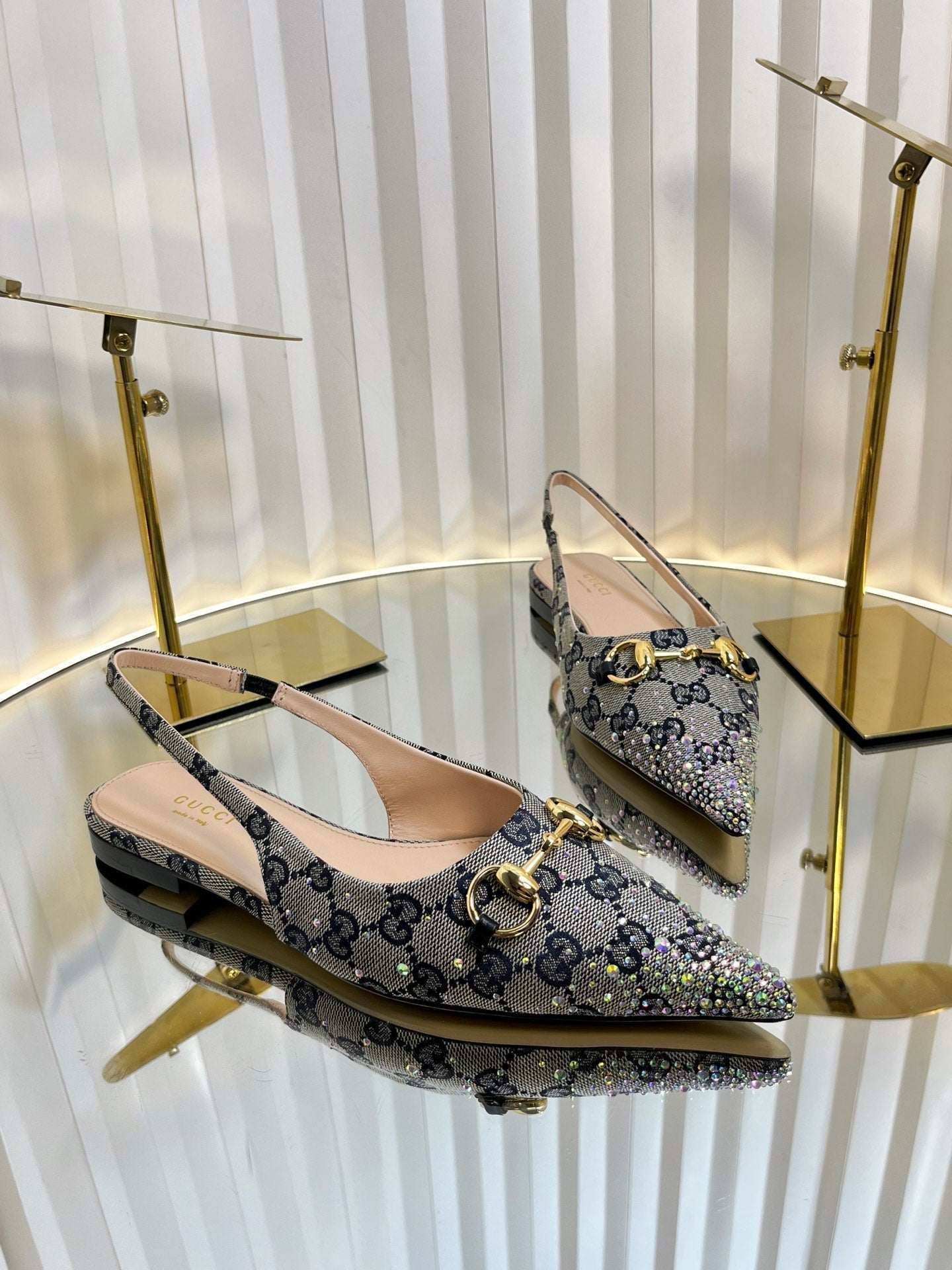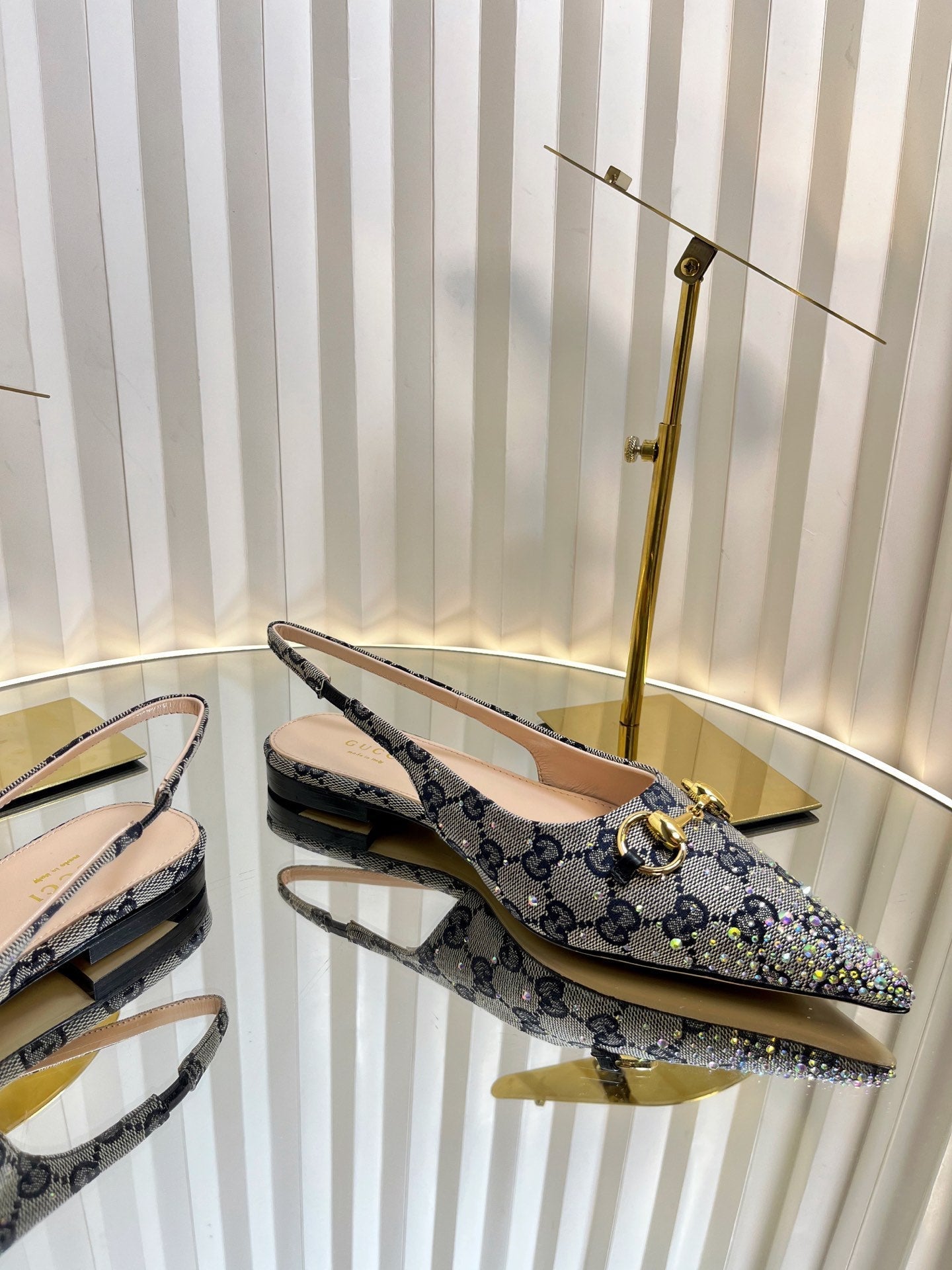 GG Horsebit Slingback Flat Black Ebony Monogram Canvas Point Toe Crystal-Embellished