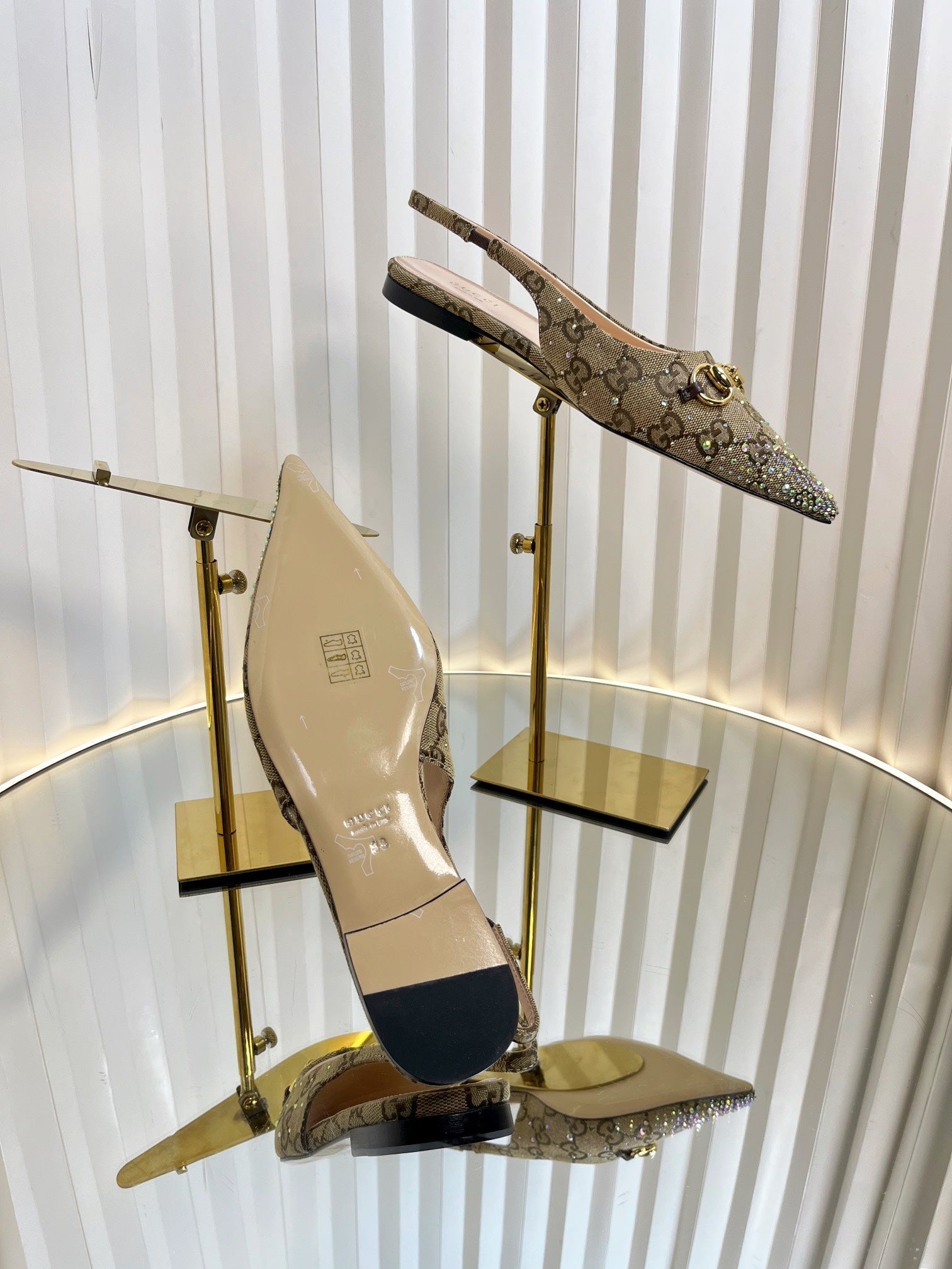 GG Horsebit Slingback Flat Beige Ebony Monogram Canvas Point Toe Crystal-Embellished