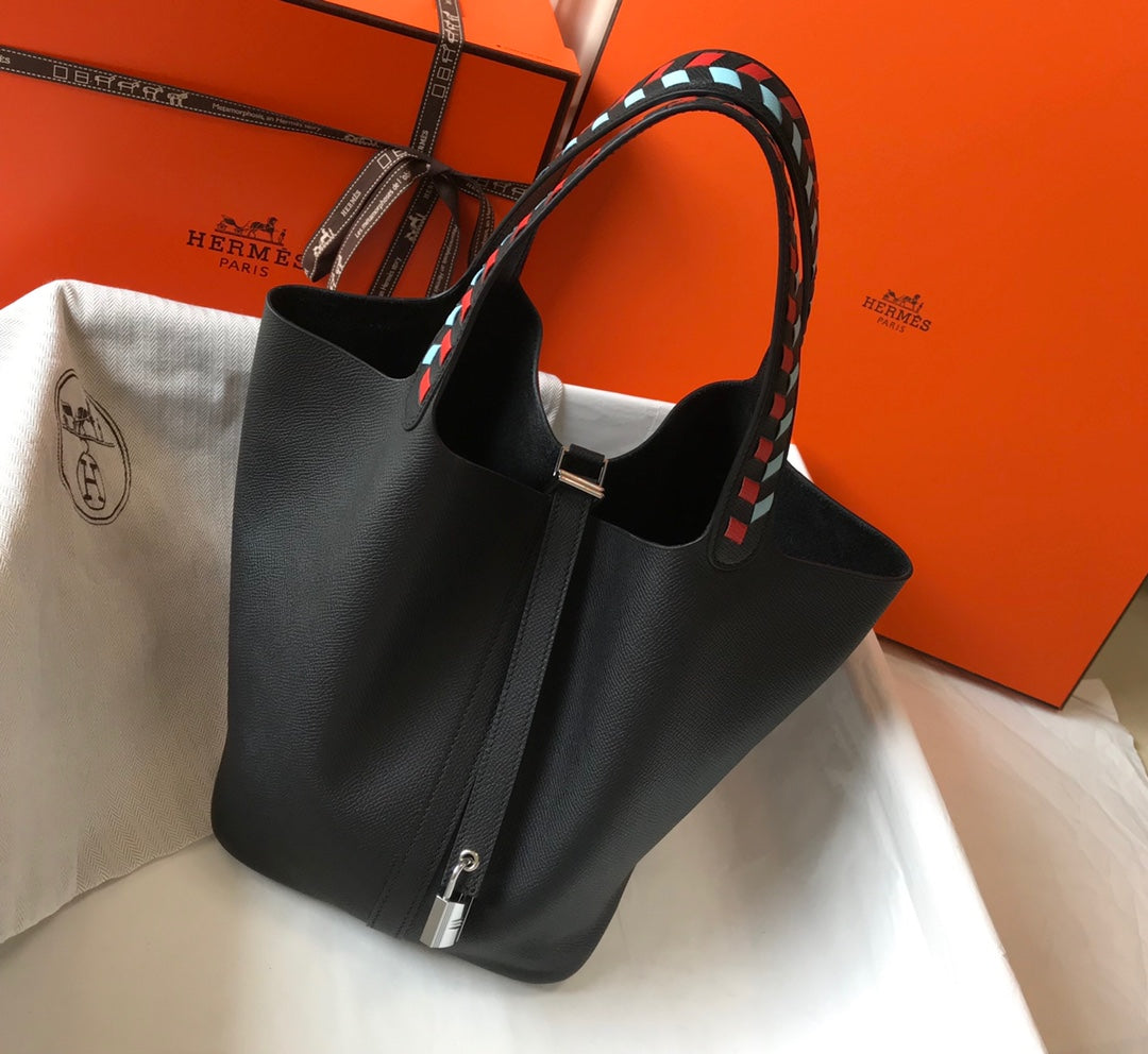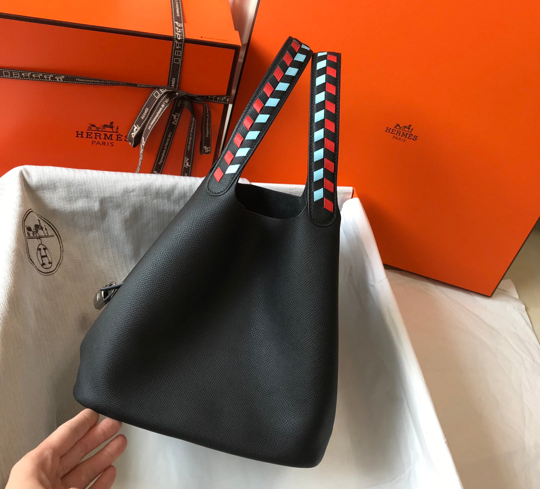 HM PICOTIN LOCK 18 BLACK EPSOM LEATHER WITH BRAID STRAP